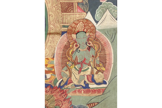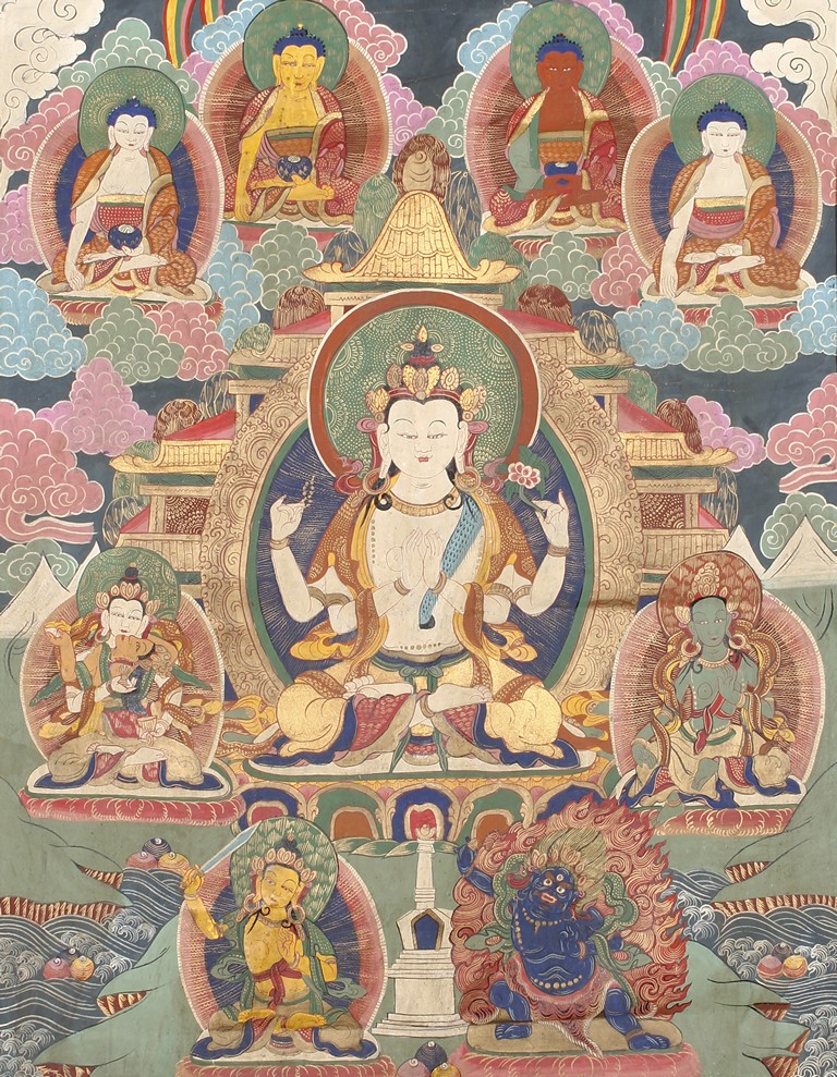 This thangka is painted on a cloth with depiction of the four-armed Shadakshari Lokeshvara as the central figure seated in dhyanasana, surrounded by deities and monks holding various objects seated before vibrant orange and pinkish mandorlas all upon green background. Qing Dynasty Period.