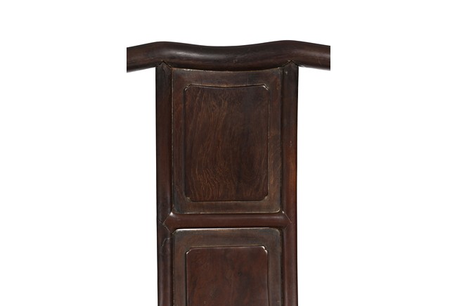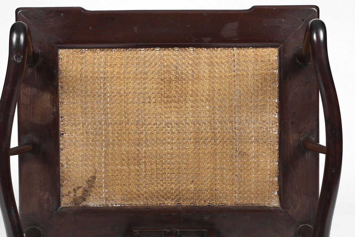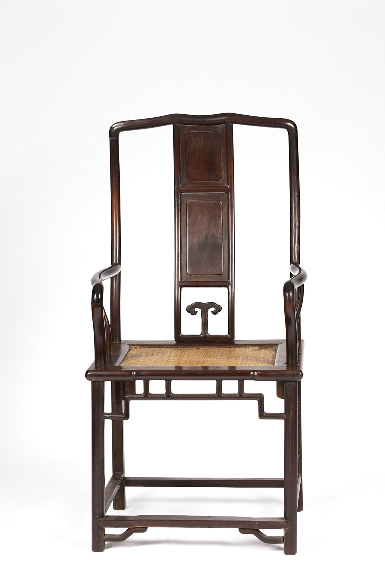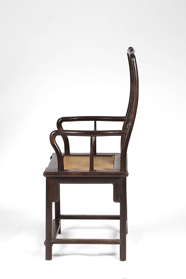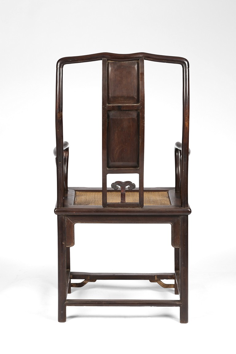 The yoke back chair with round toprail supported on slender stile extending to the back leg, armrest supported on curved side posts, the backplate with two rectangular rosewood panels above an upright lingzhi head, with mat seat, feet joined by stretchers. Qing Dynasty period.