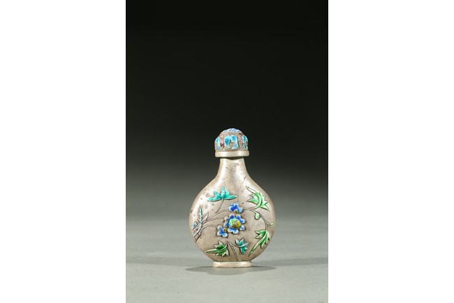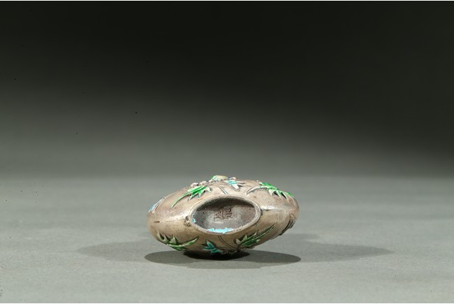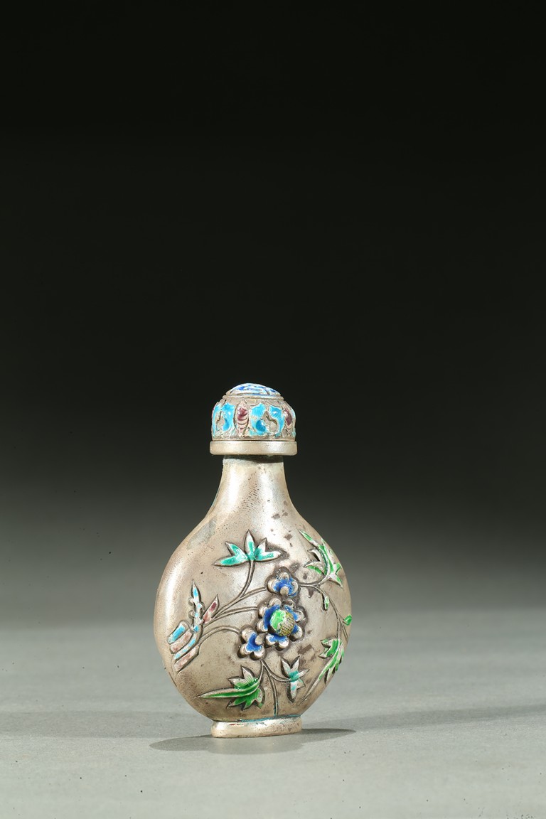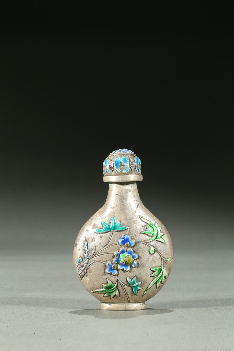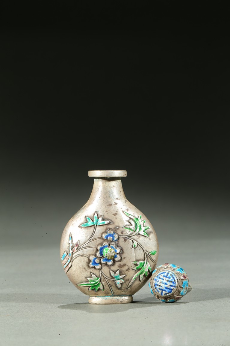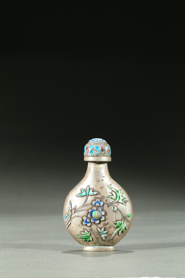 The silver snuff bottle enameled to the exterior depicting leafy flowers, the base impressed with a mark. Qing Dynasty period.