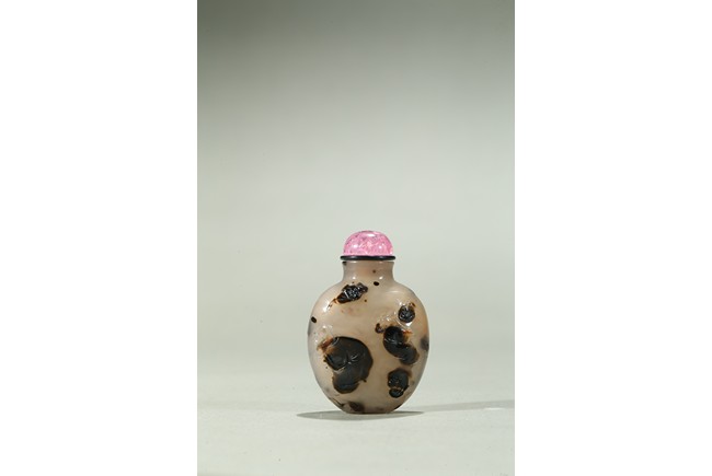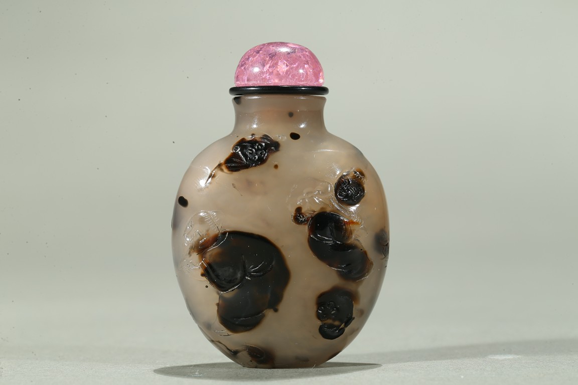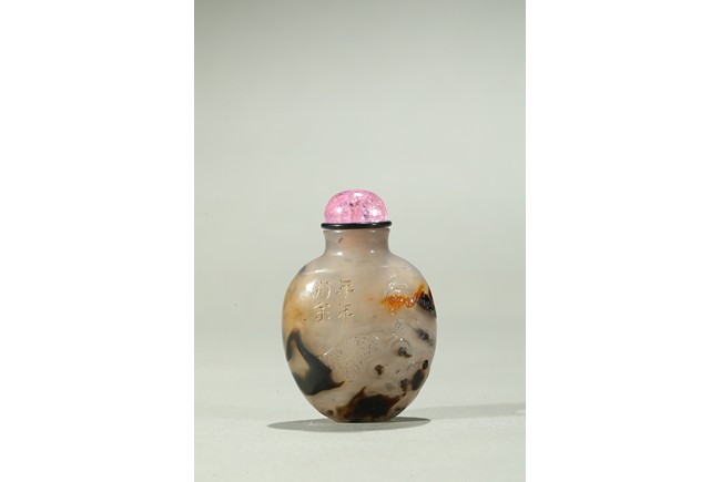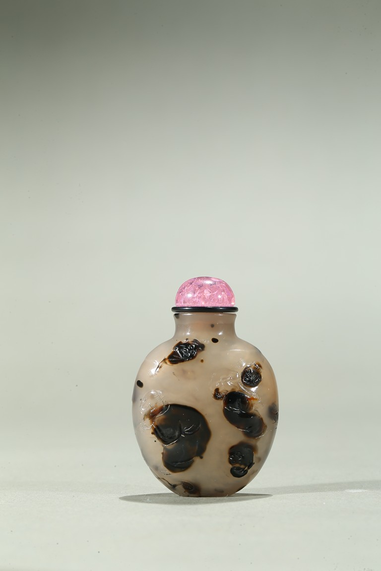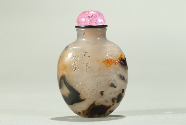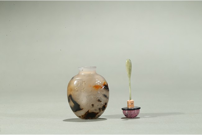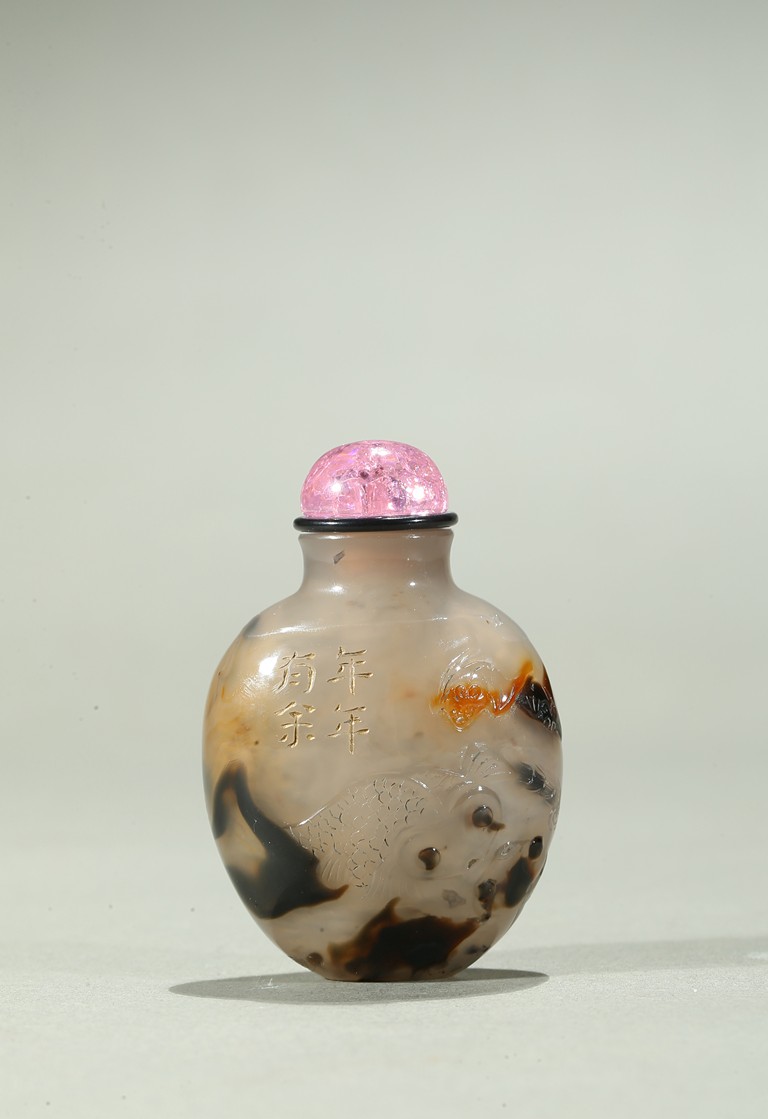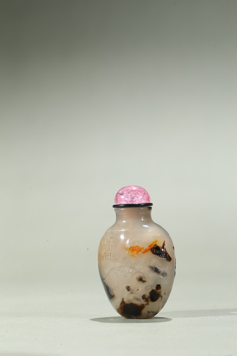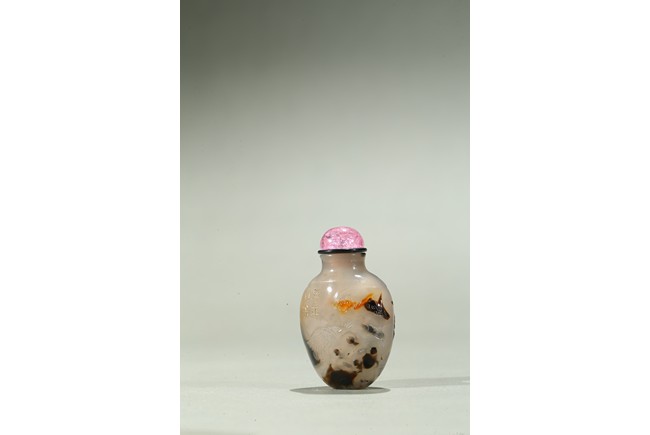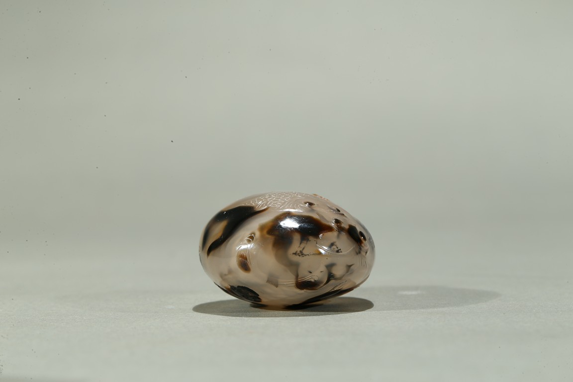 Suzhou school. Of rounded form, one side carved with a scene of a carp in the river below a flying bat highlighted by the caramel tone inclusion, the other side carved with the two legendary immortals 'hehe erxian' and an auspicious bat, further highlighted by the brown-black inclusions in the stone.