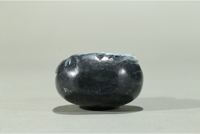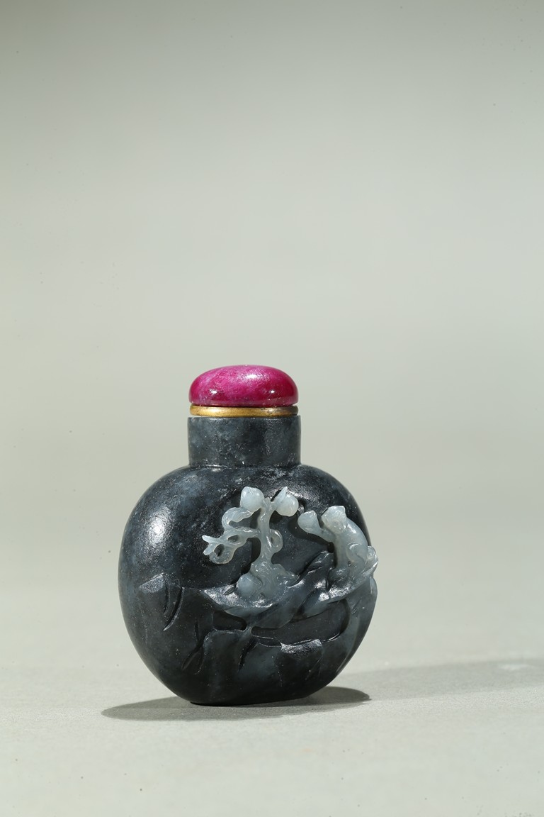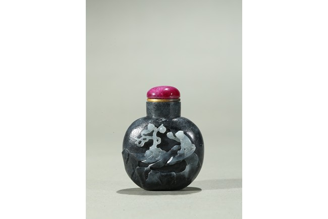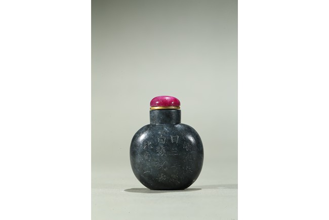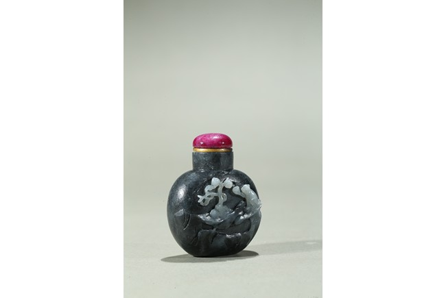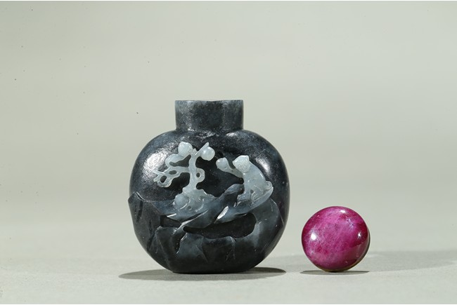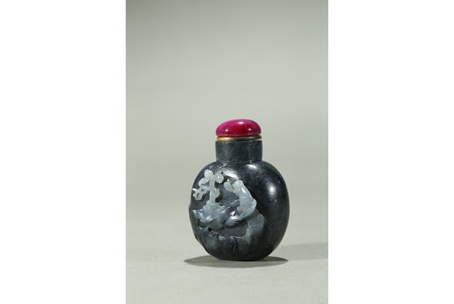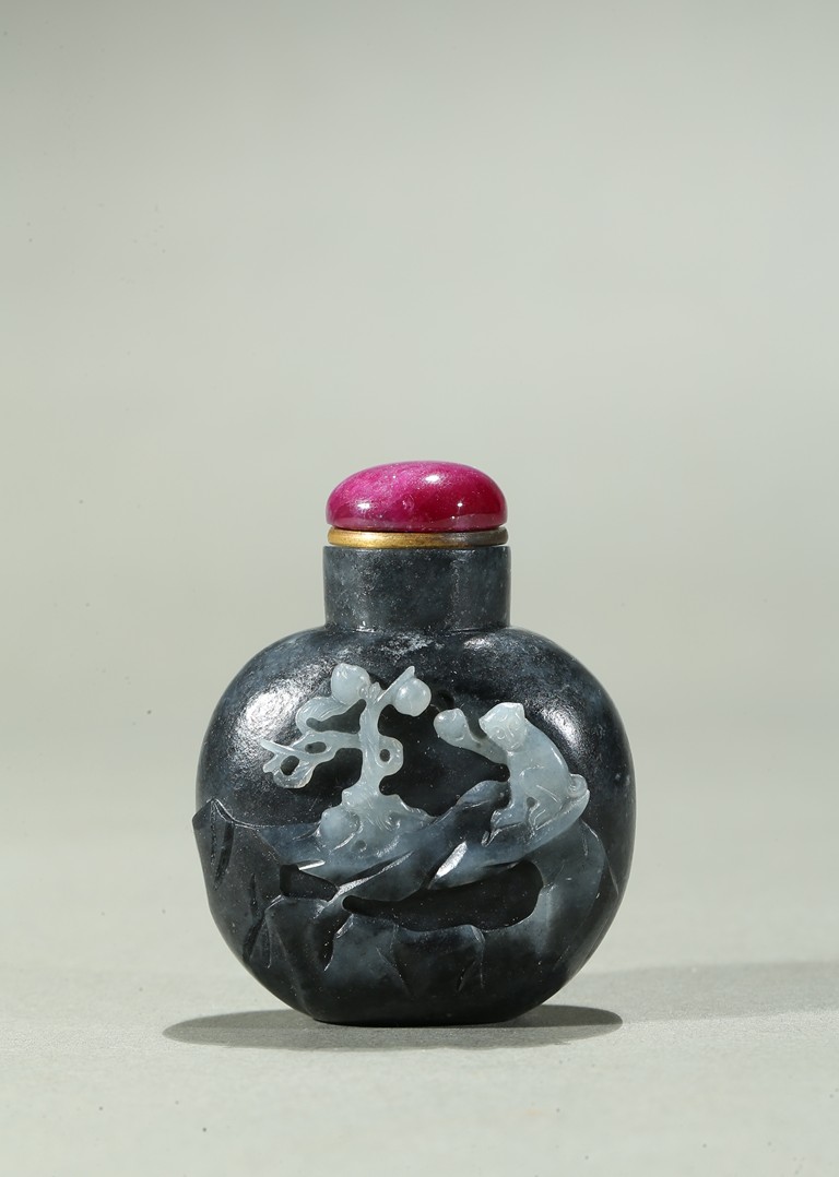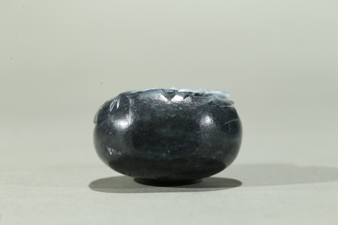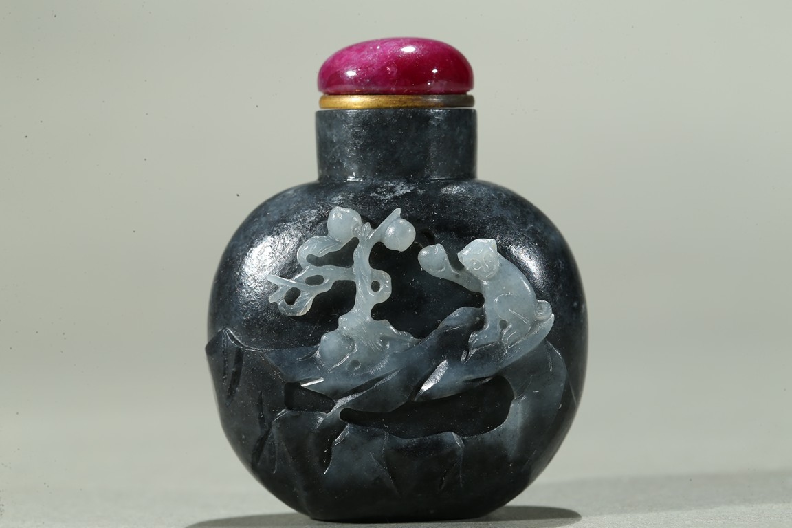 Suzhou school. Well hollowed, of compressed globular form, one side carved with a scene of a monkey sitting on a rocky cliff grabbing a peach from a peach tree, the other side finely inscribed with poetic inscription, the carving details carefully designed to best utilize the white and black tone of the stone. Qing Dynasty period.