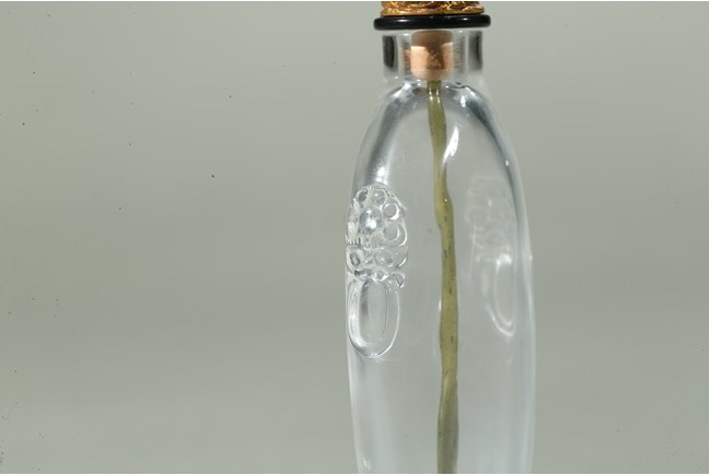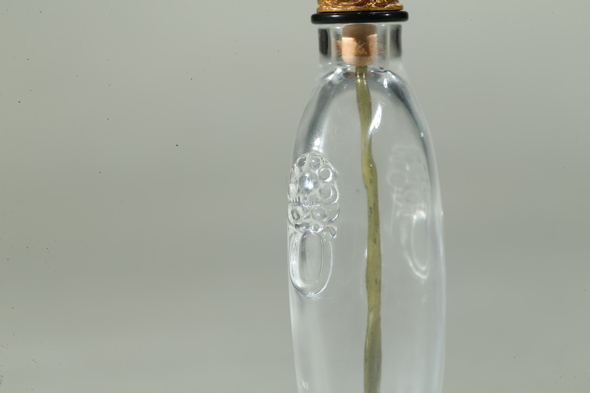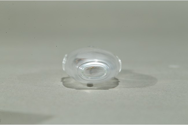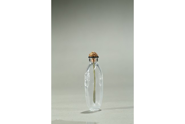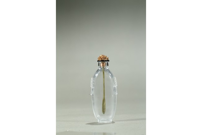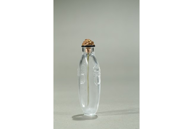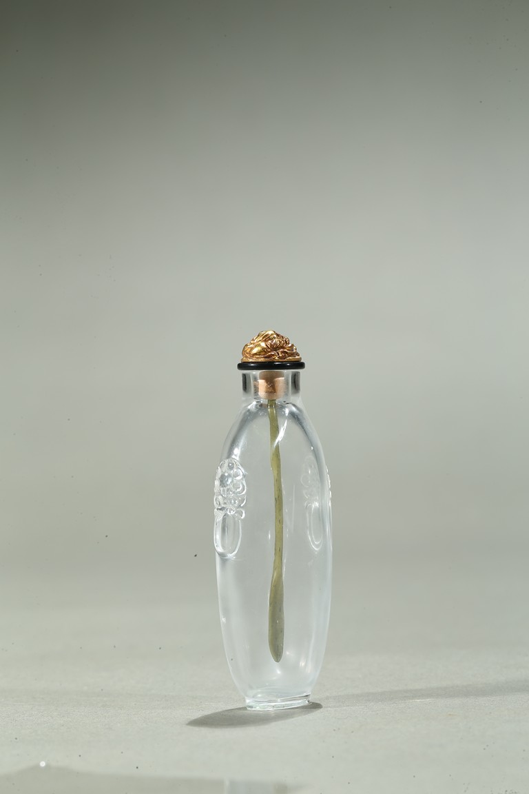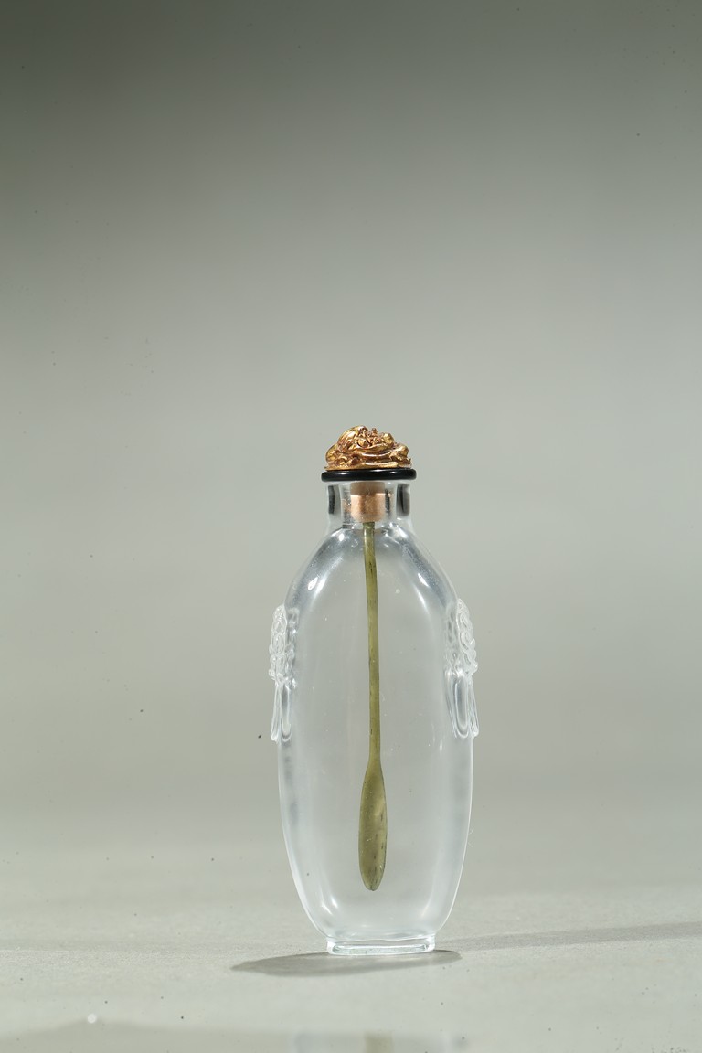 Of elongated ovoid form, the transparent crystals body moulded in shallow relief with mythical beast mask handles. Qing Dynasty period.