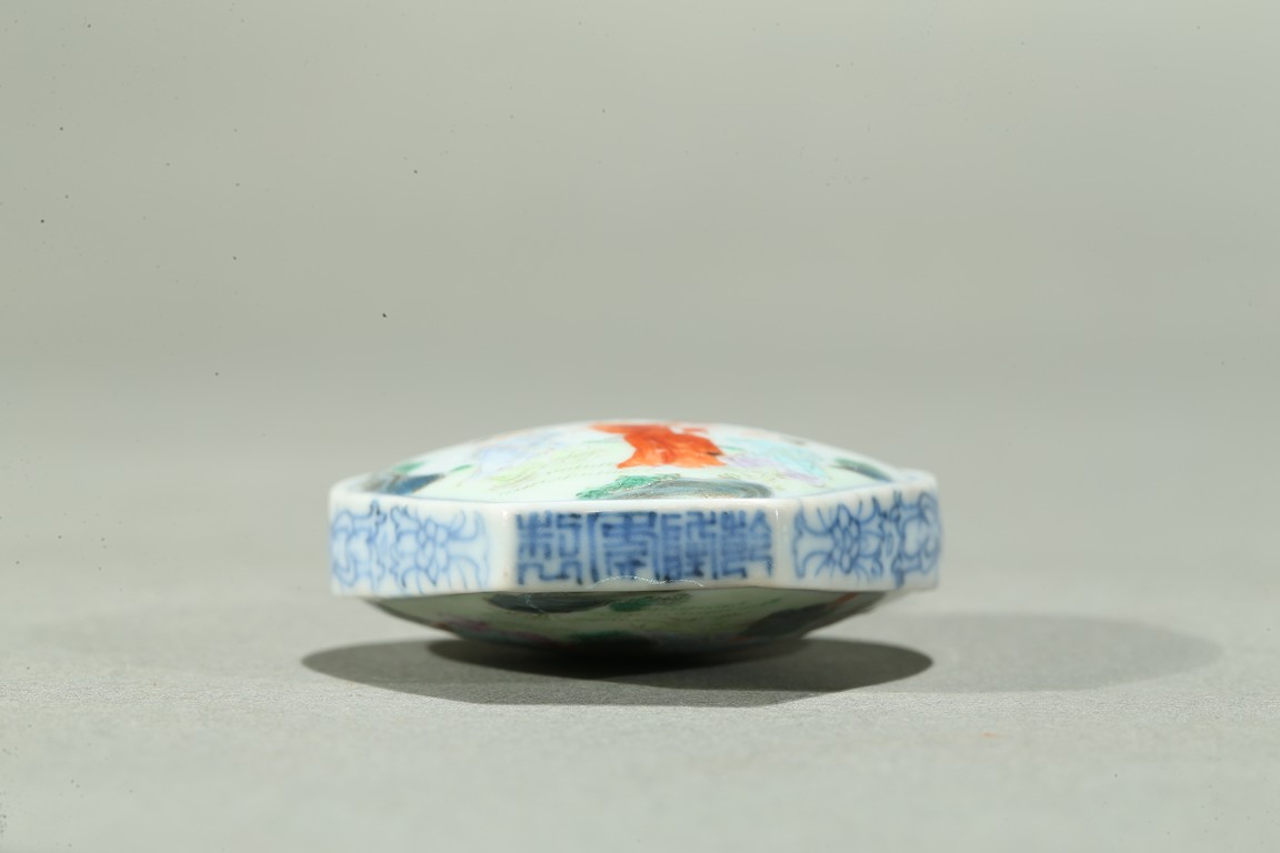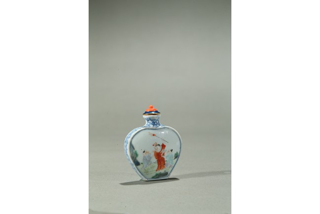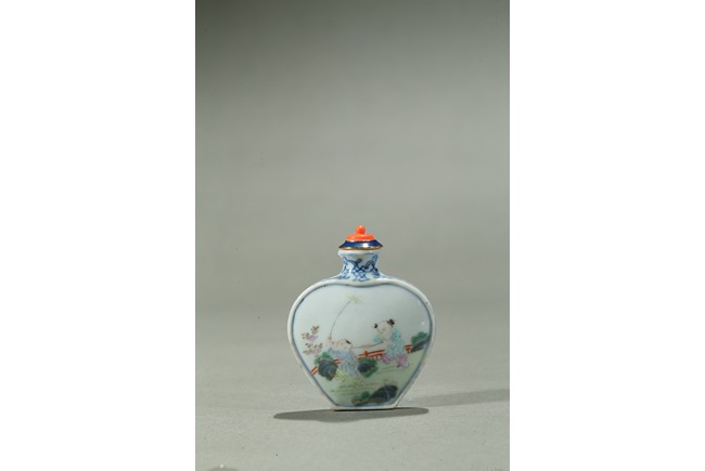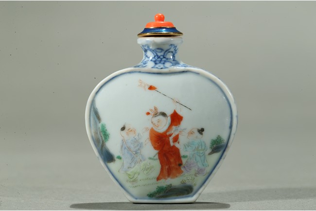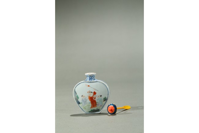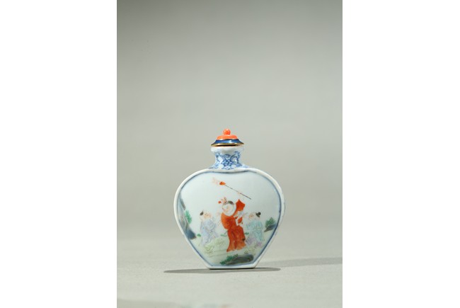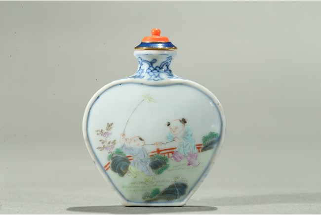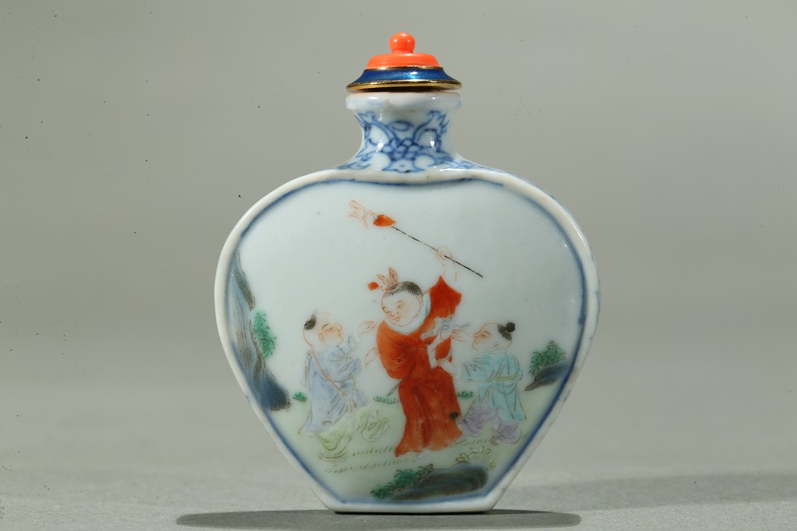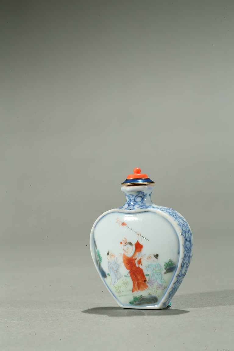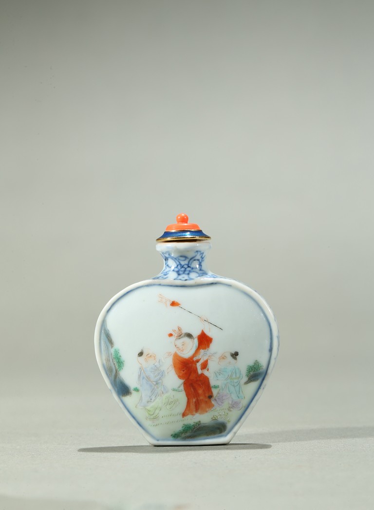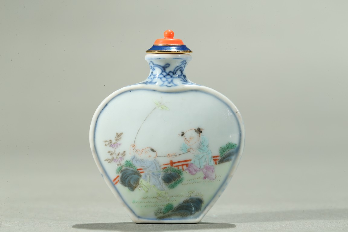 The snuff bottle enamelled to one side with three boys engaging in playful activities in a landscape, the reverse further painted with two boys catching a butterfly in a garden setting, the sides with scrolled decoration in underglaze blue, the base with four character QIANLONG mark. Qing Dynasty Qianlong period.