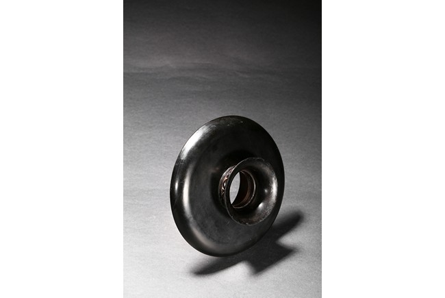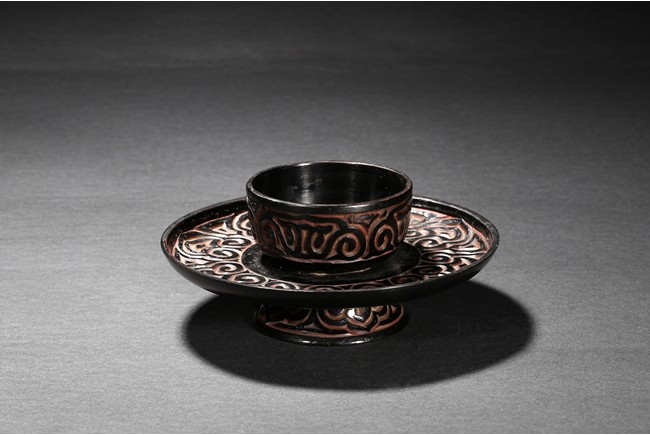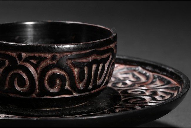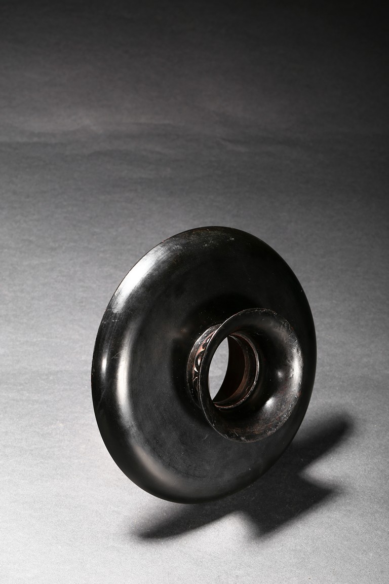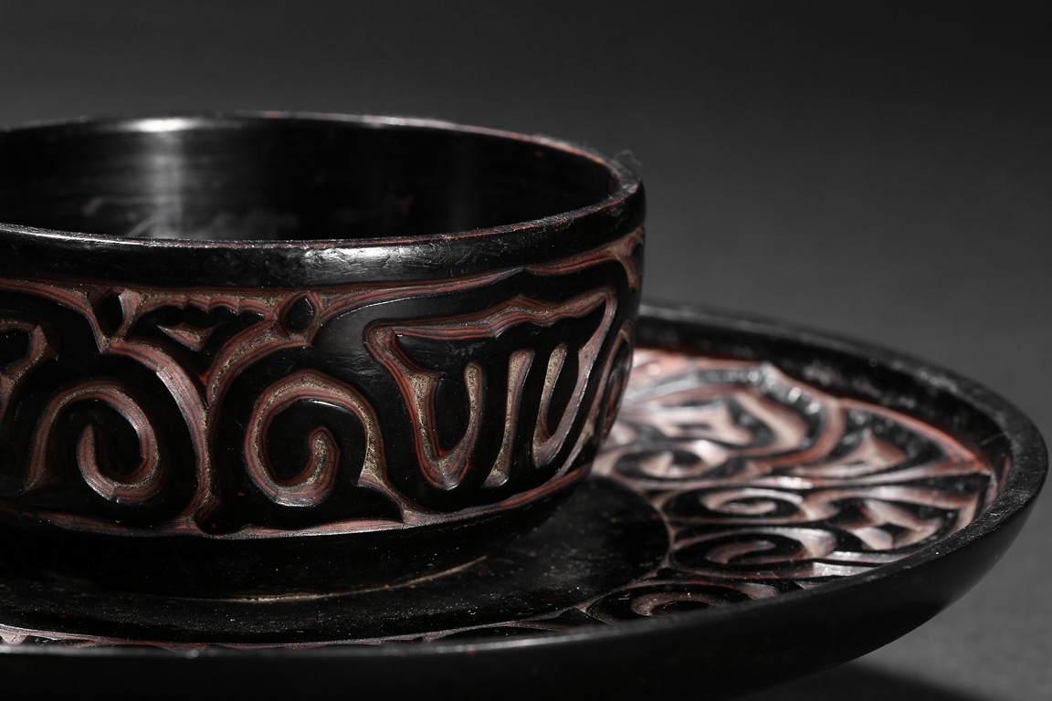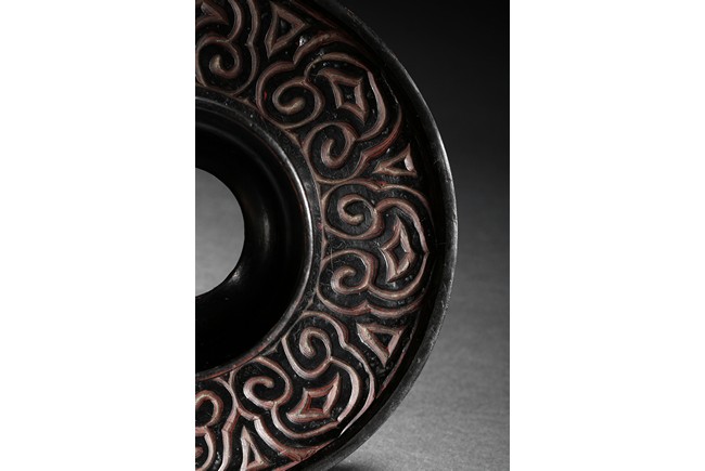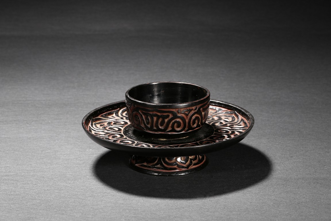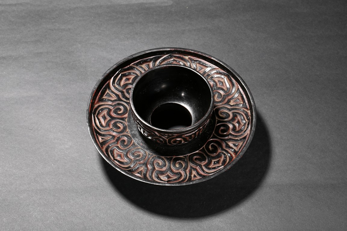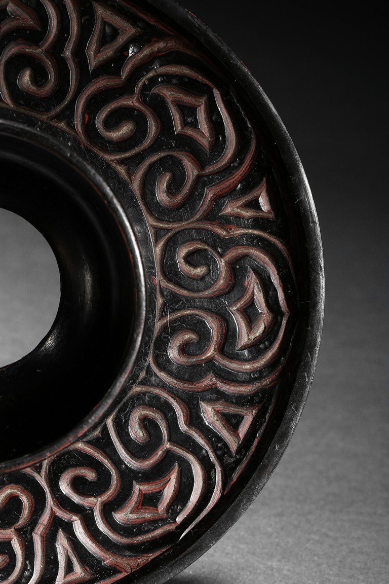 The hollow vessel is crisply carved through thick layers of black lacquer with broad bands of ruyi scrolls around the cup-shaped receptacle, on both sides of the wide flange, and on the flared foot, the interior lacquered black. Early Qing Dynasty period.