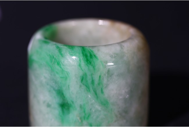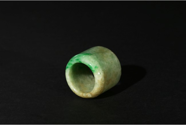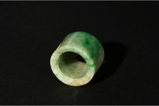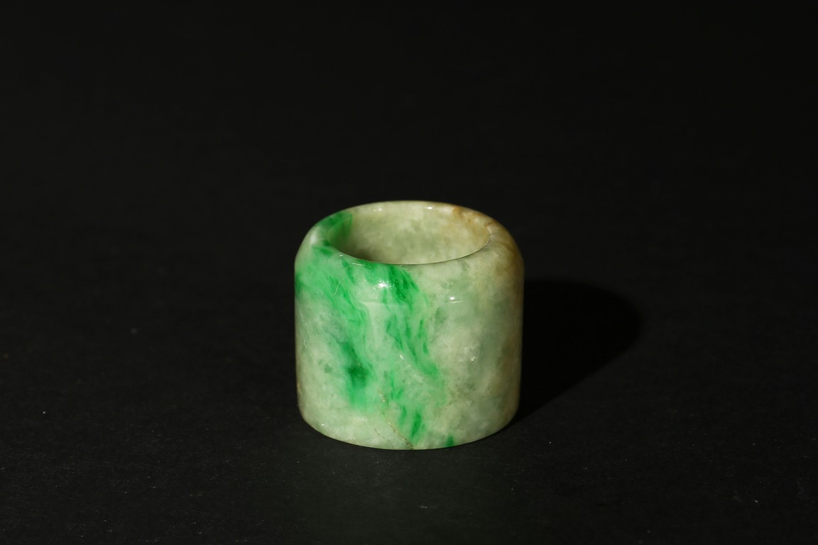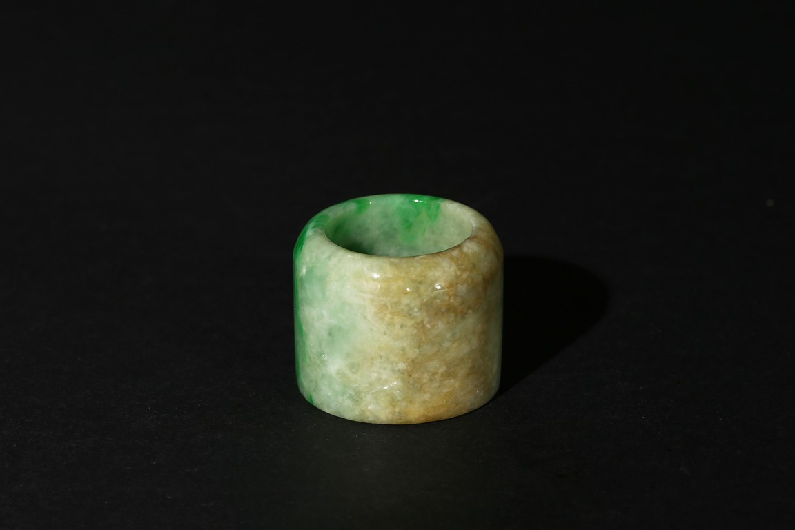 The ring with sides undecorated and with a soft polish, the translucent stone suffused with apple-green and slight russet inclusions. Qing Dynasty period.