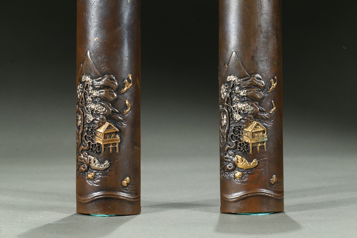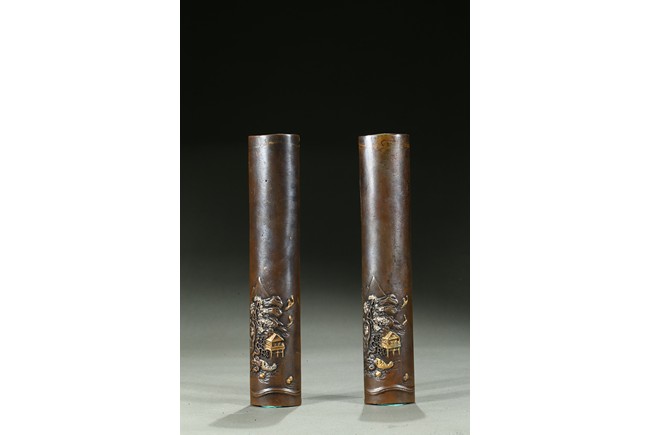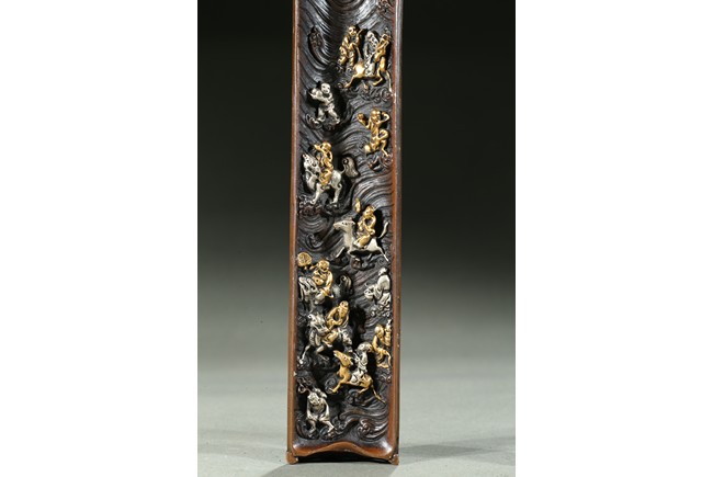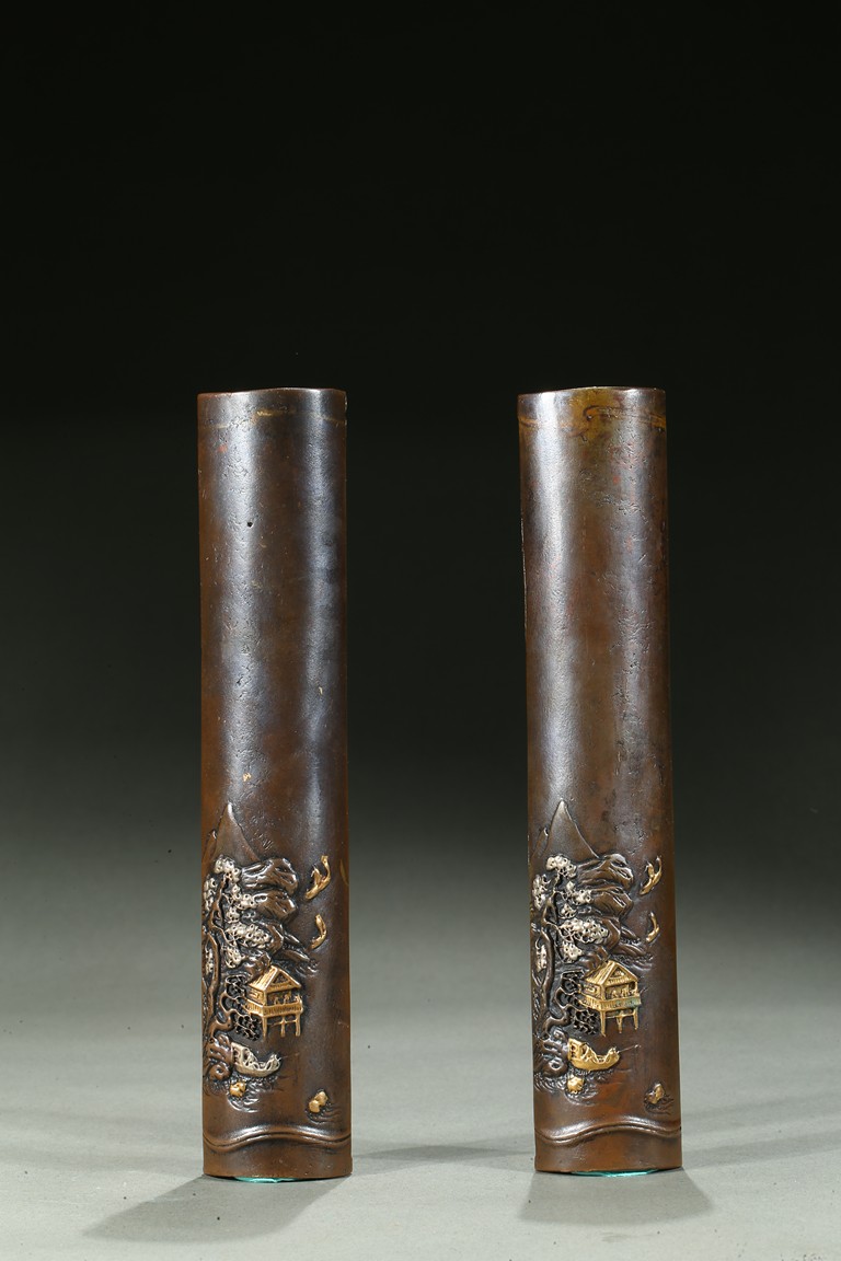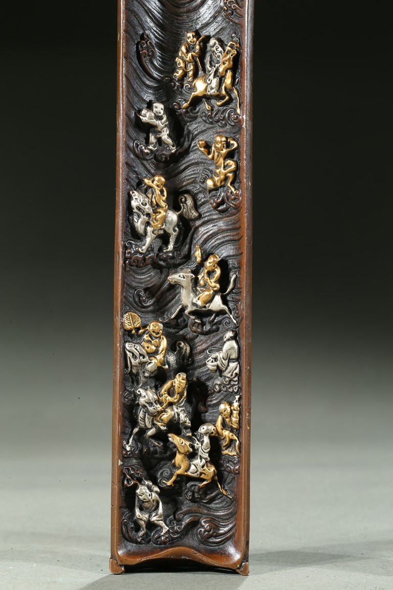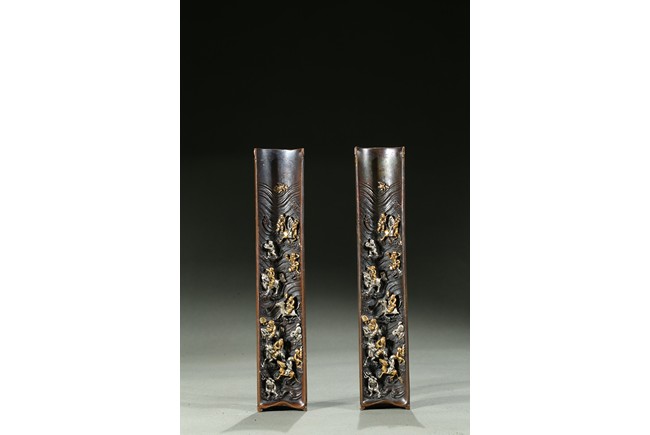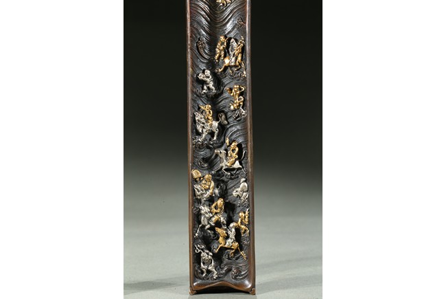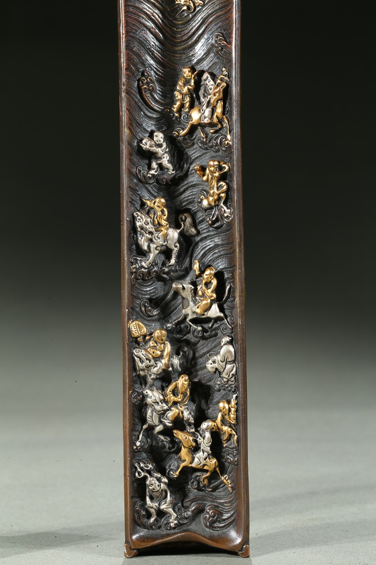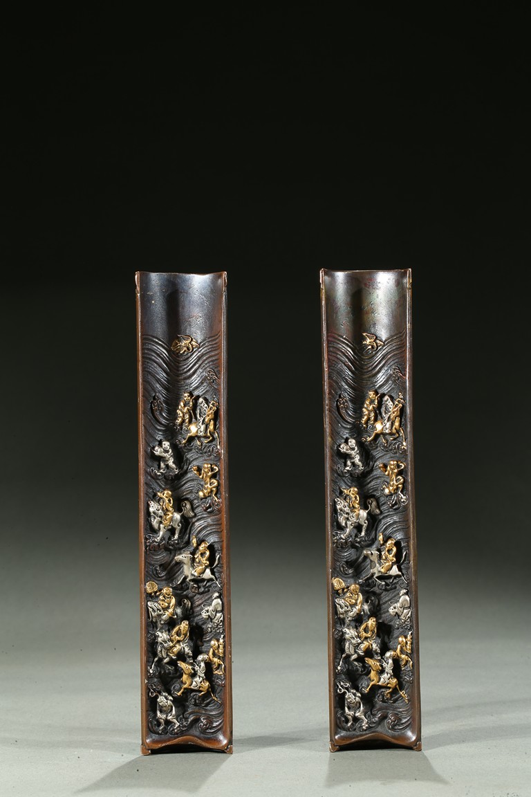 Each weight is cast with a riverscape scene including hills, pines, boats, and pavilion, the reverse cast in relief with various immortals travelling across crashing waves, finely inlaid in silver and parcel-gilt. Qing Dynasty period.