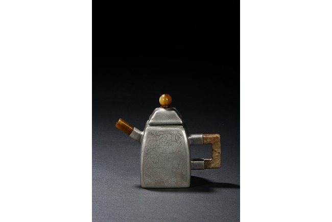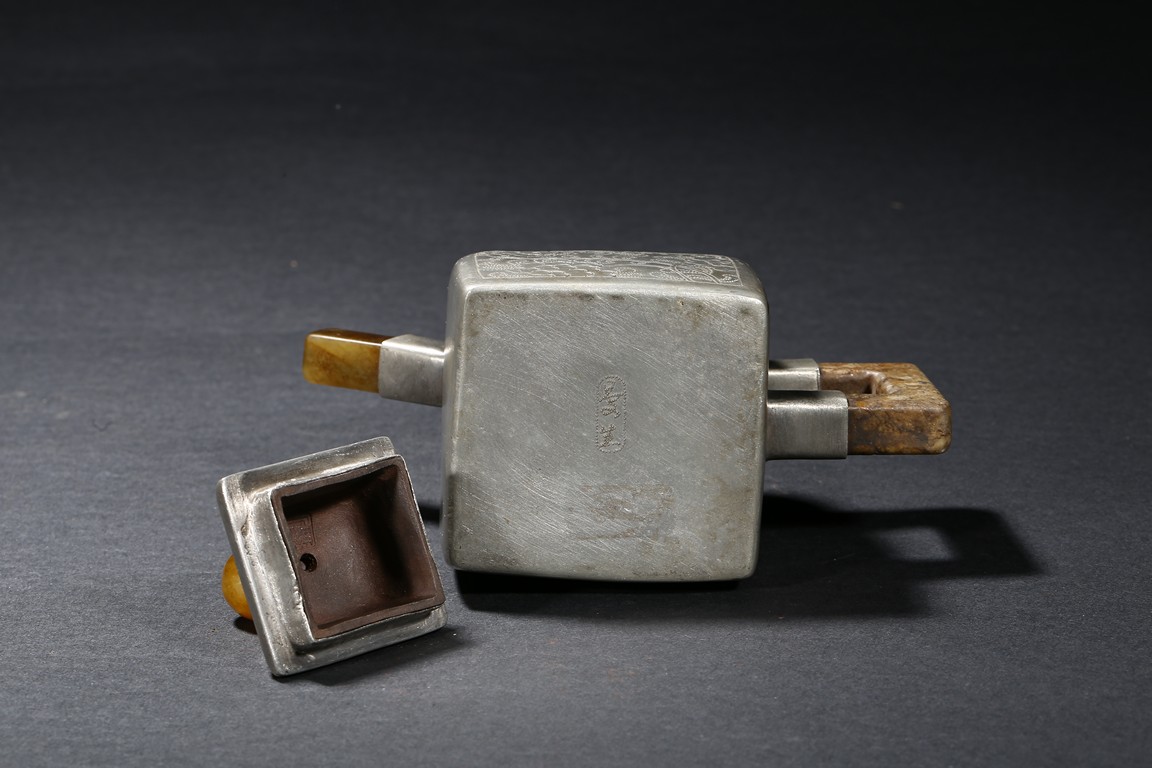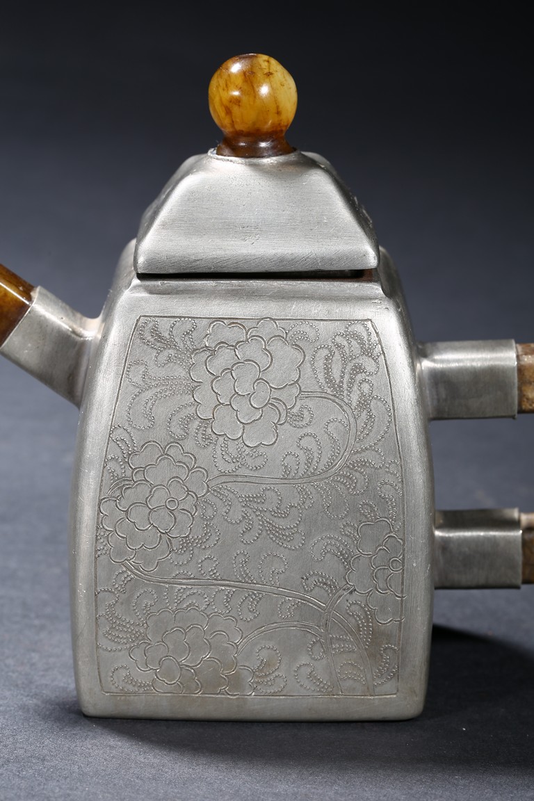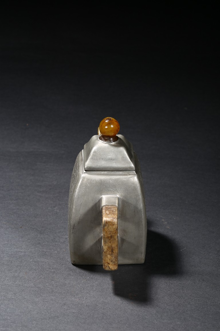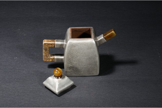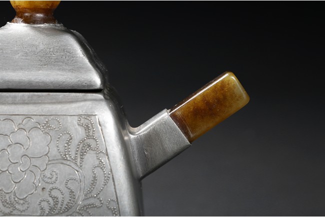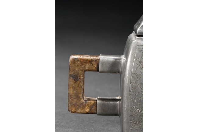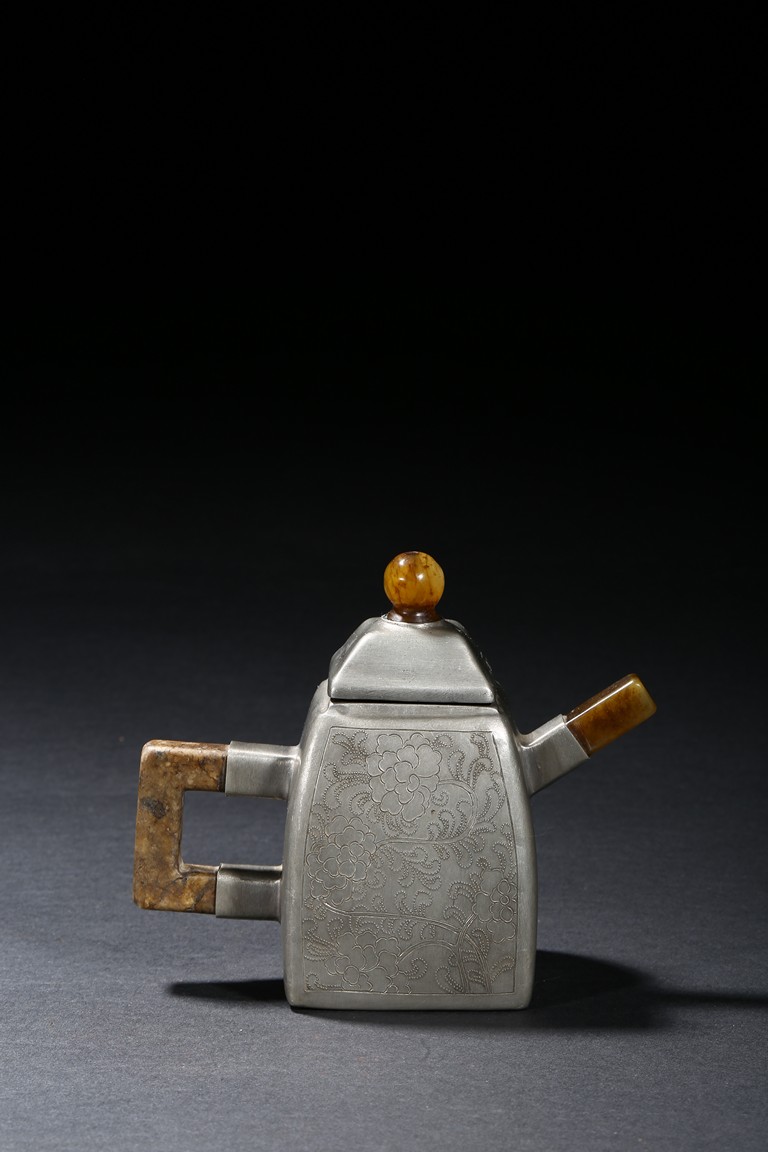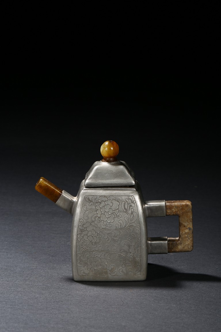 Of a fitted lid, arching handle, and tapered spout all formed partially from carved jade stone, both sides incised to depict dense foliate scroll pattern, base with two character mansheng; the teapot and cover interior bearing square seal marks. Qing Dynasty period.