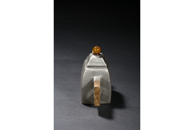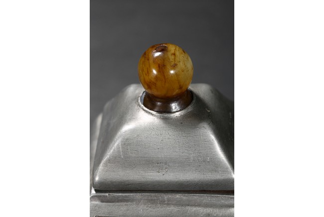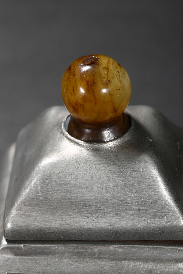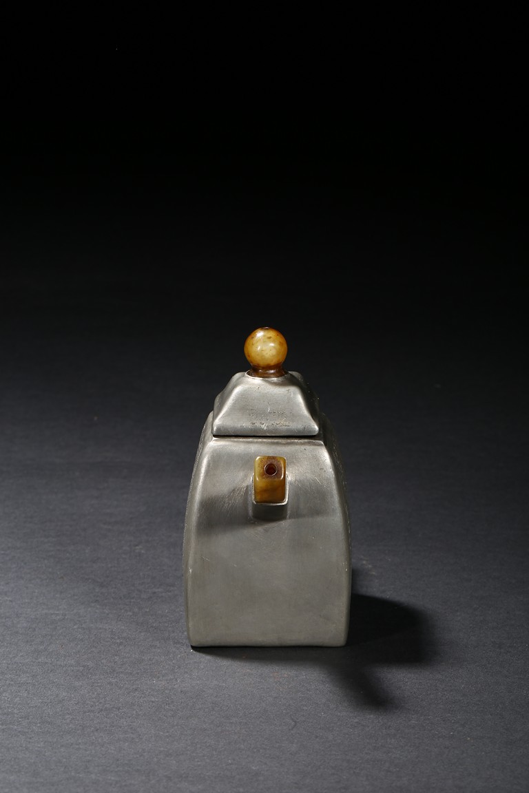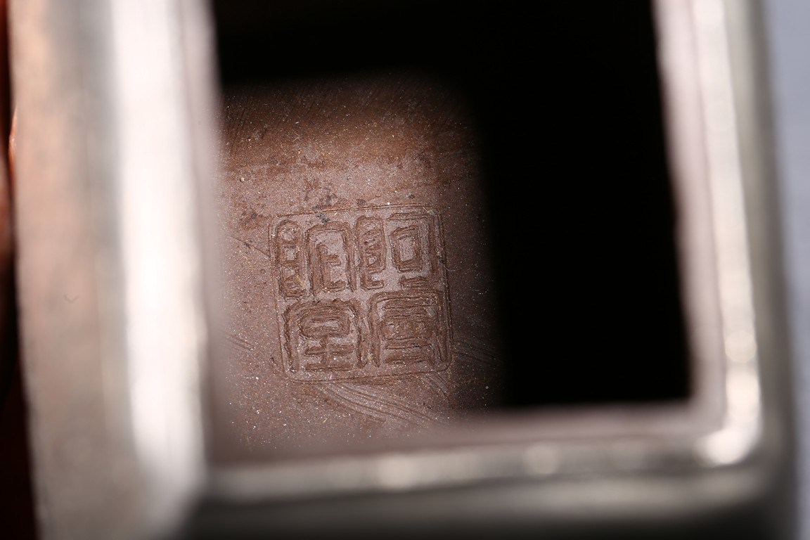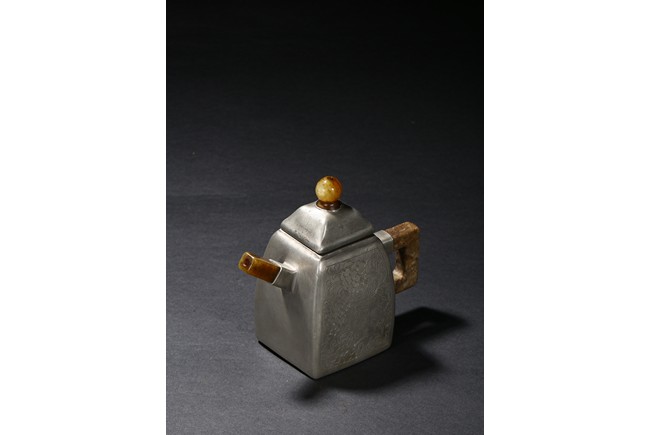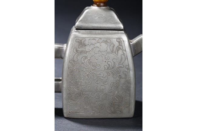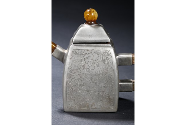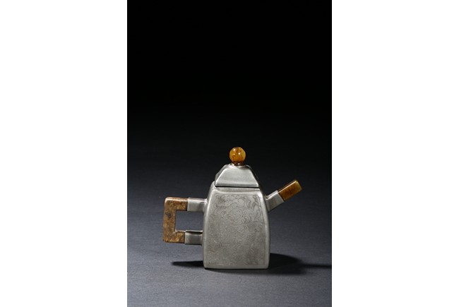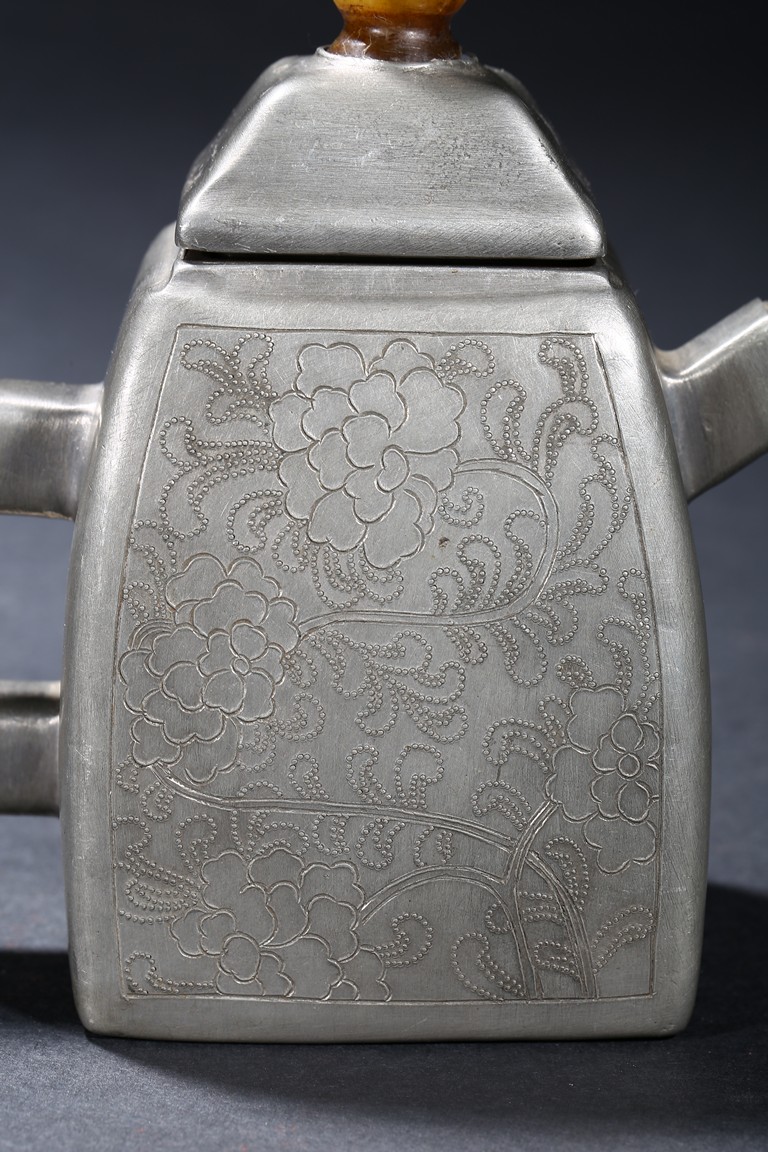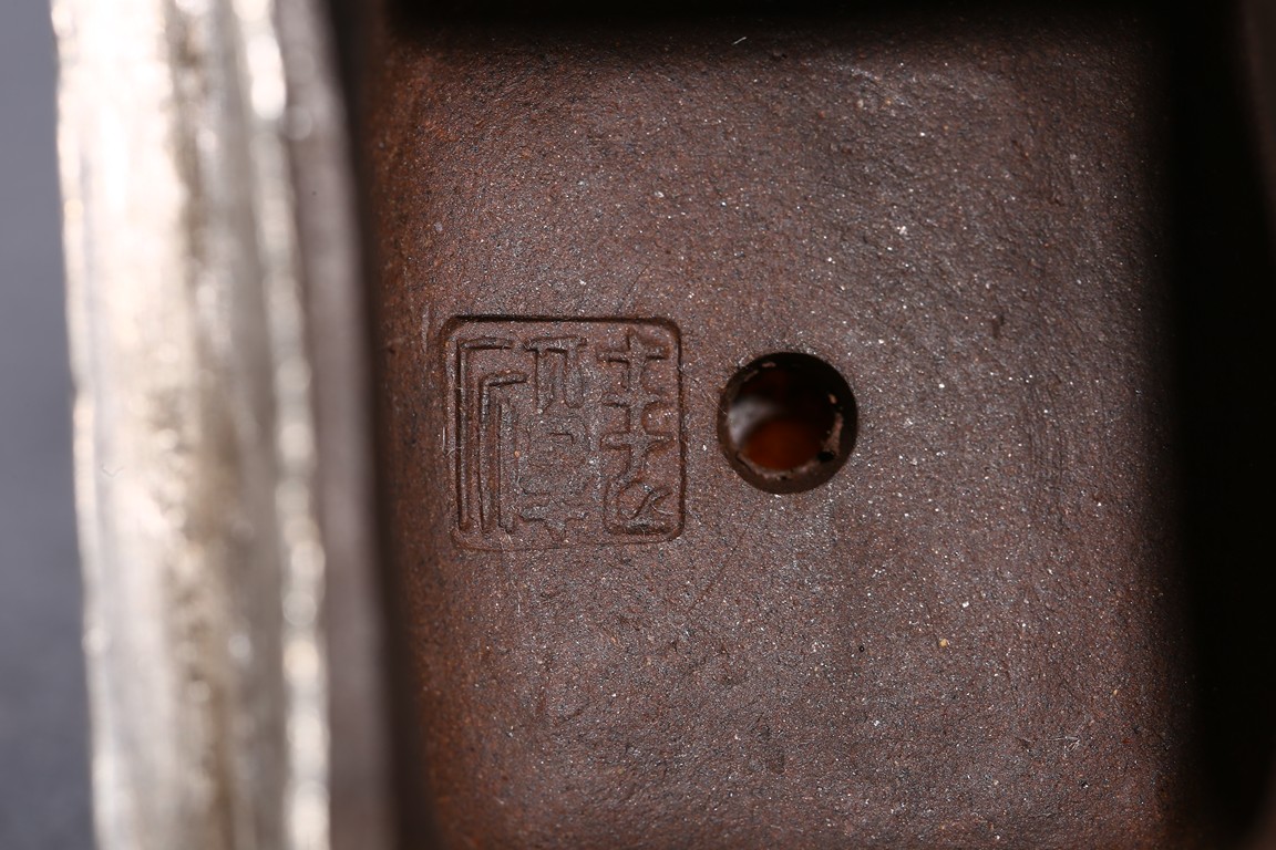 Of a fitted lid, arching handle, and tapered spout all formed partially from carved jade stone, both sides incised to depict dense foliate scroll pattern, base with two character mansheng; the teapot and cover interior bearing square seal marks. Qing Dynasty period.