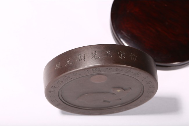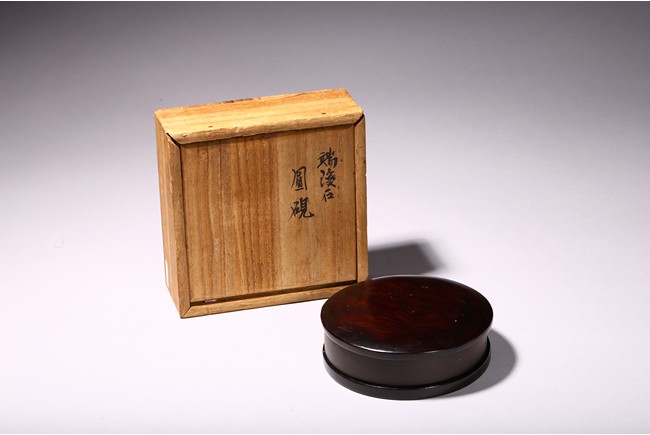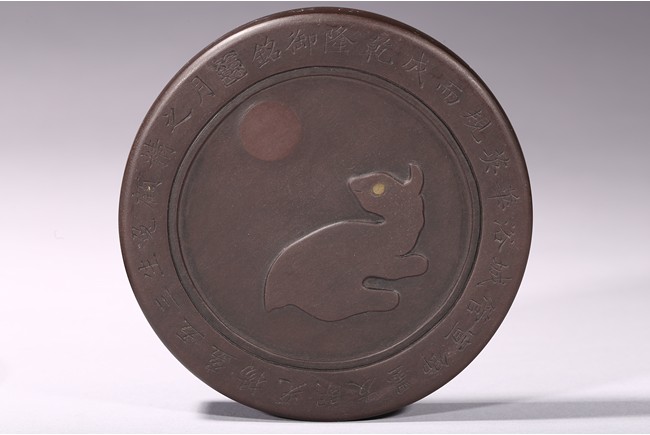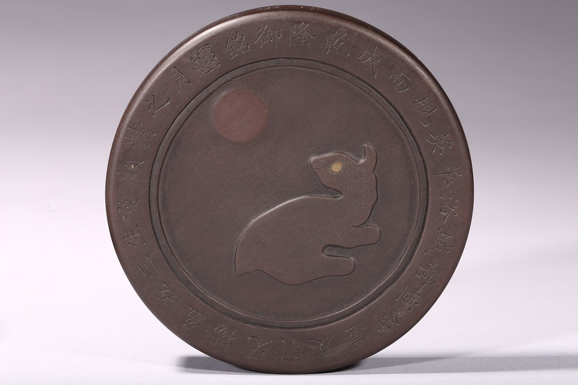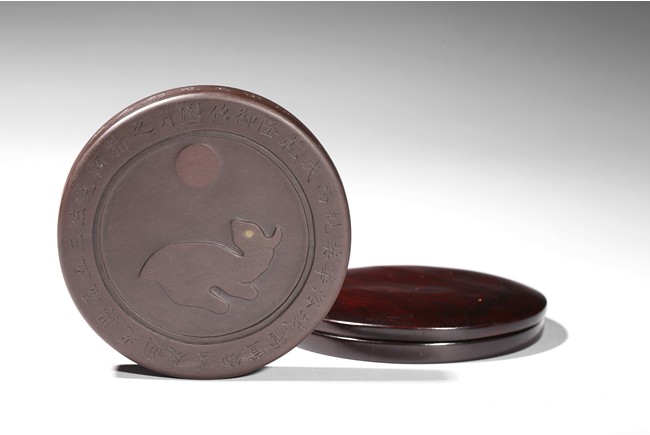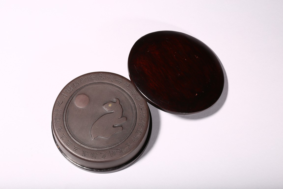 The circular inkstone carved in relief depicting a rabbit turned looking at the moon, the outer border finely incised with regular script inscription and a seal mark, the side further inscribed with inscription, accompanied with an original rosewood box and a Japanese wood box. Qing Dynasty period.
