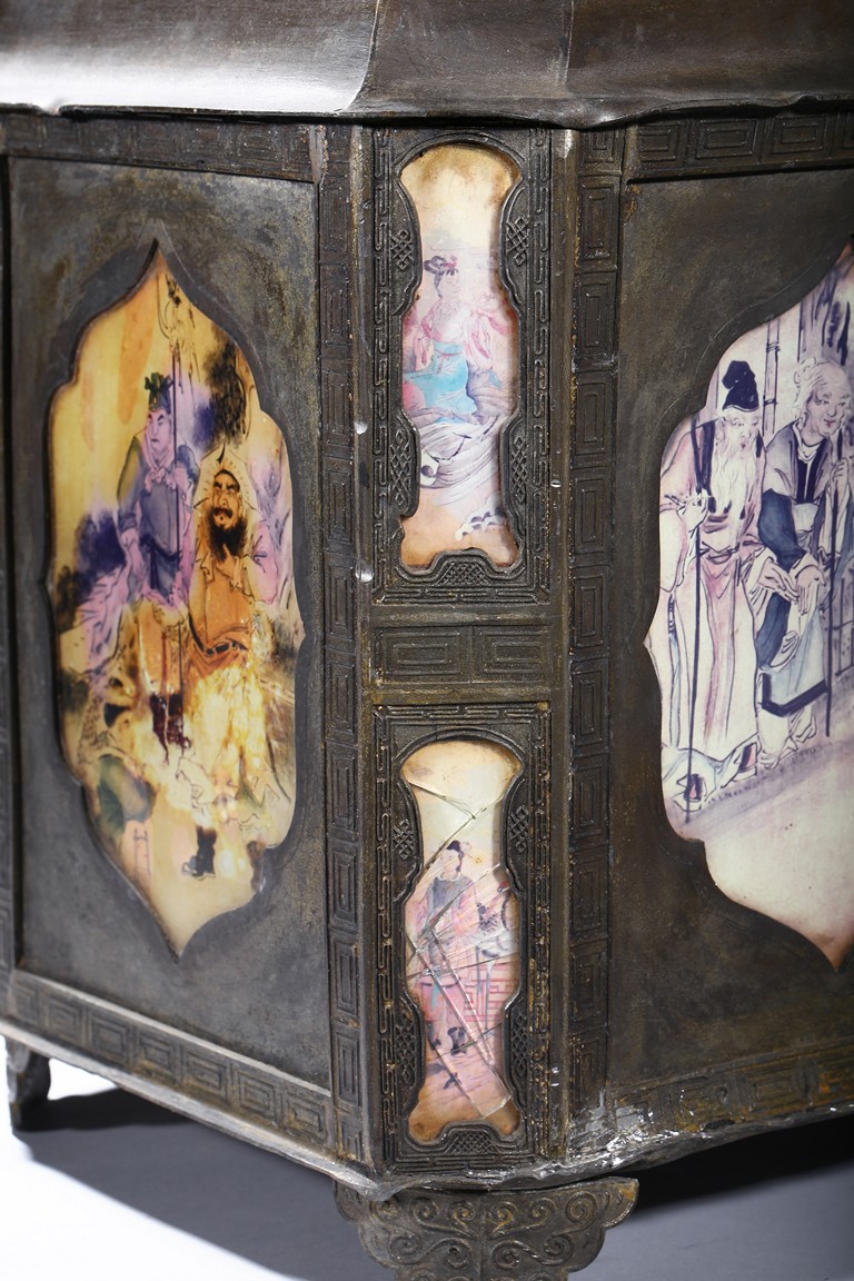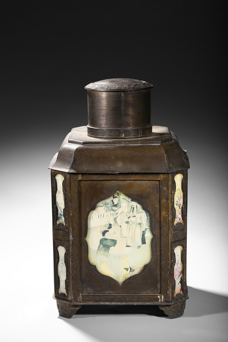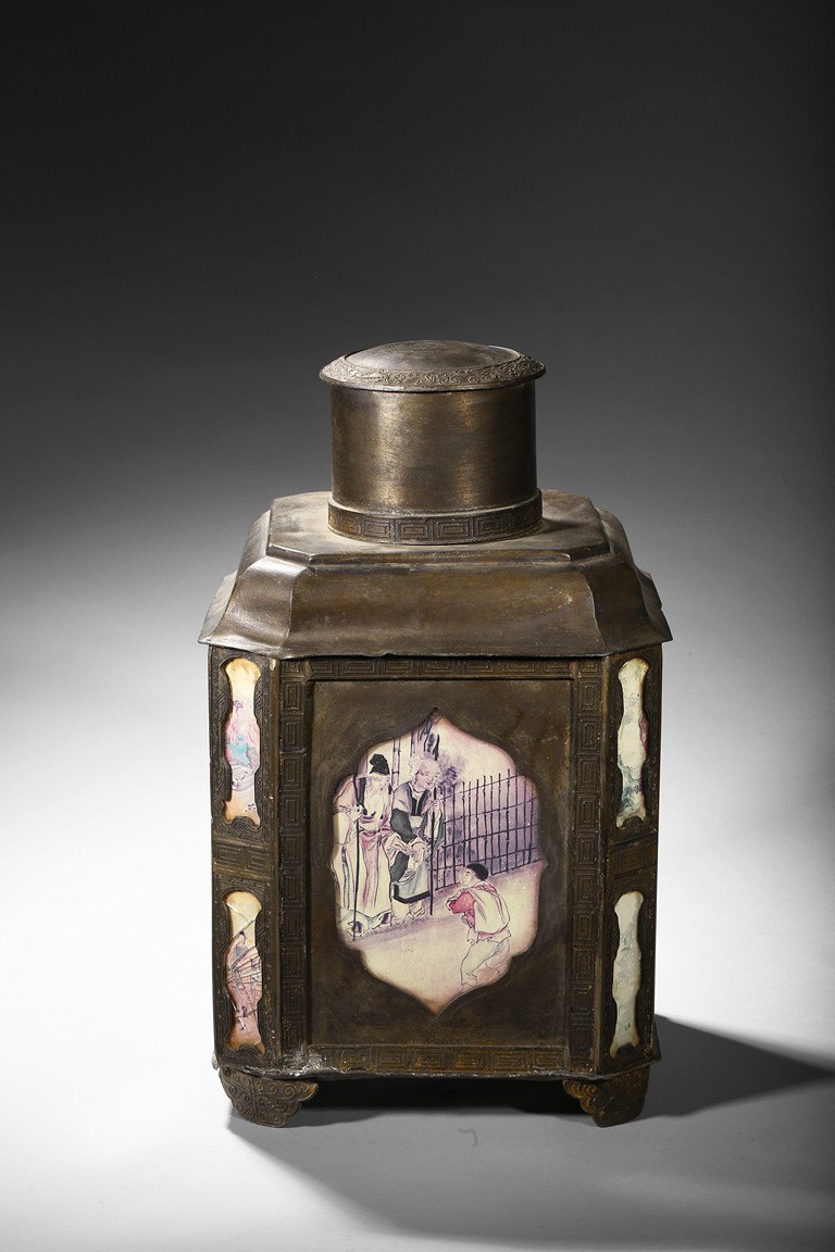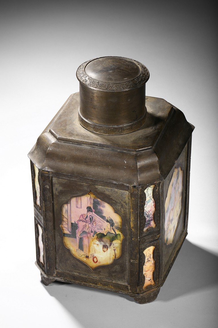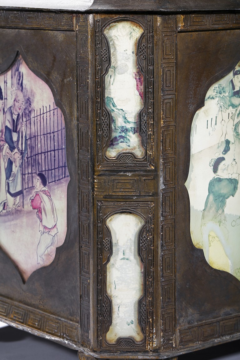 Usually large size, of hexagonal section and raised on four ruyi-shaped feet with scrolled decorations, each side with shaped cartouche enclosing reverse-painted traditional story scenes on glass, the cylindrical neck fitted with a cover, the base impressed with a mark. Qing Dynasty period.