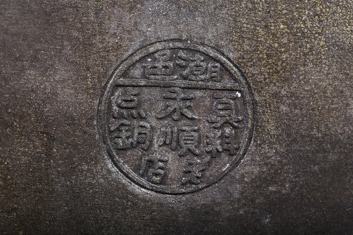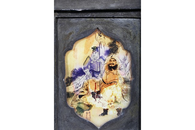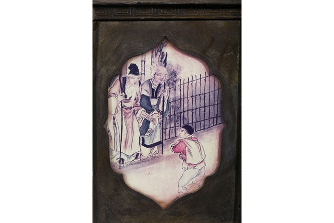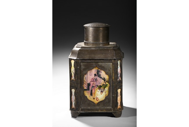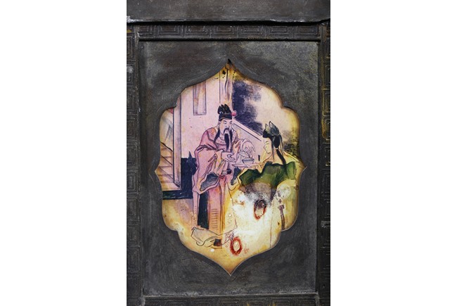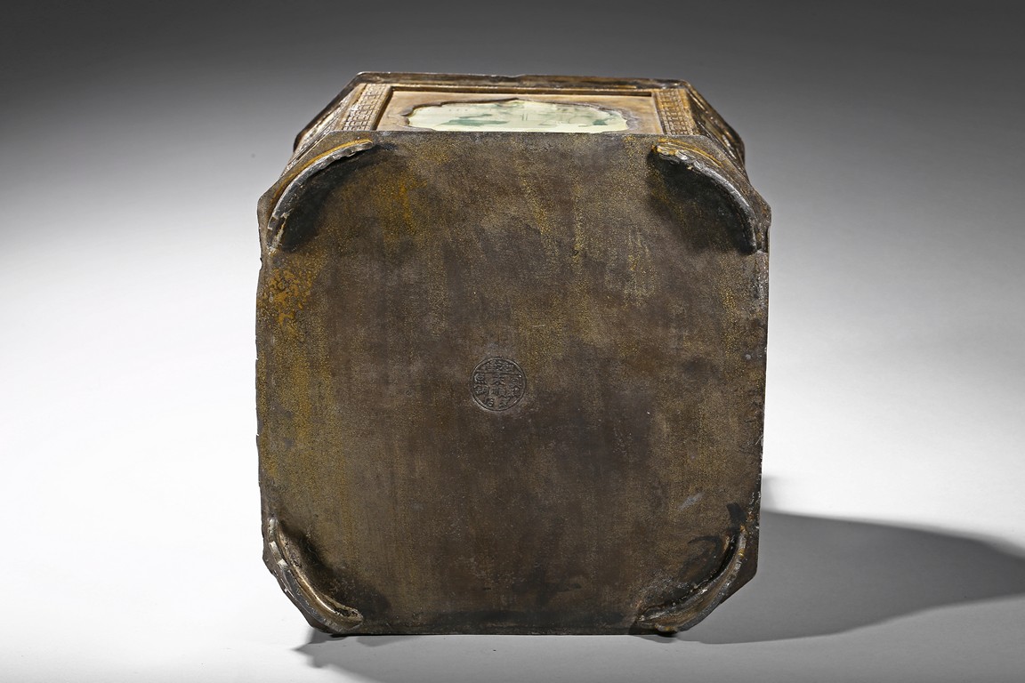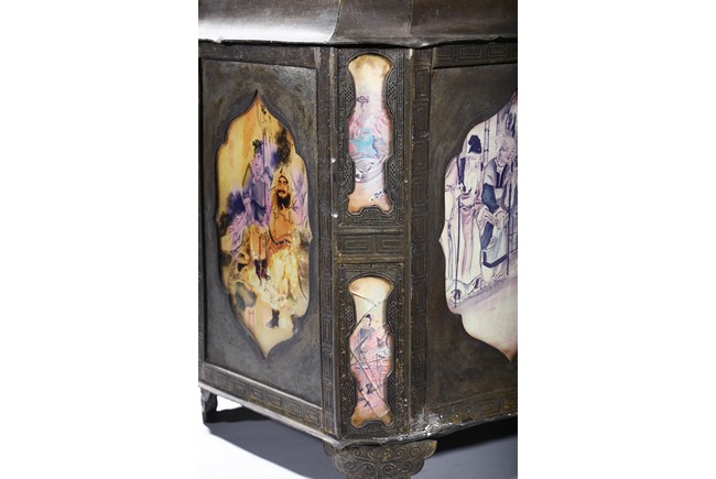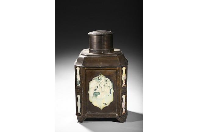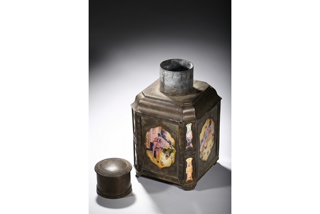 Usually large size, of hexagonal section and raised on four ruyi-shaped feet with scrolled decorations, each side with shaped cartouche enclosing reverse-painted traditional story scenes on glass, the cylindrical neck fitted with a cover, the base impressed with a mark. Qing Dynasty period.