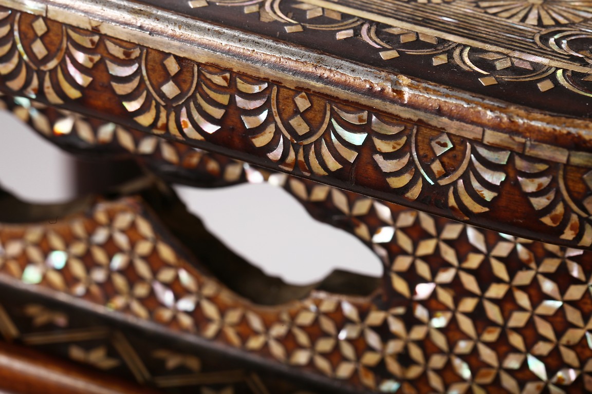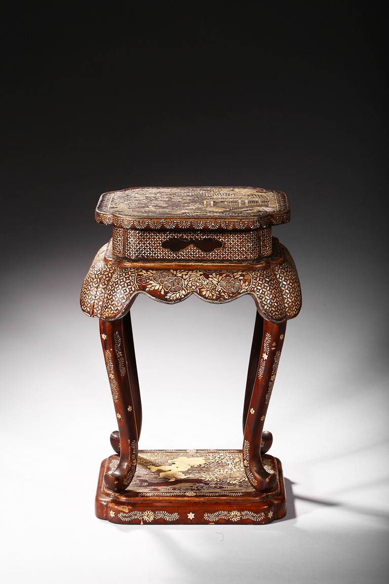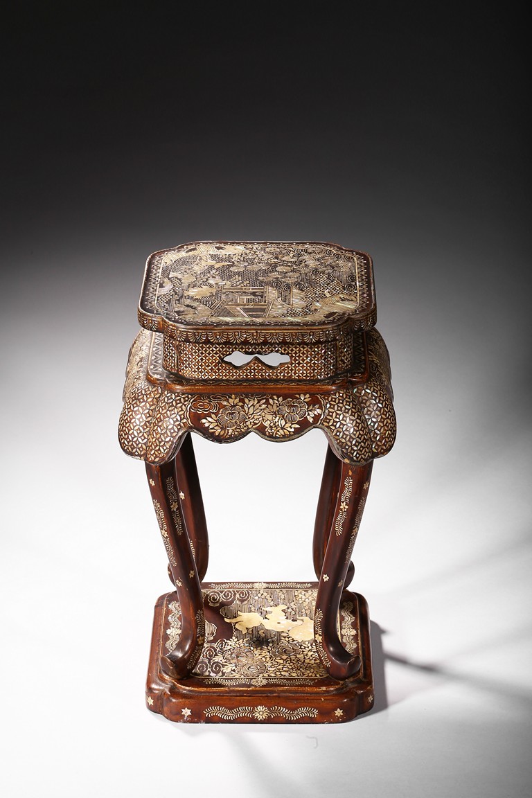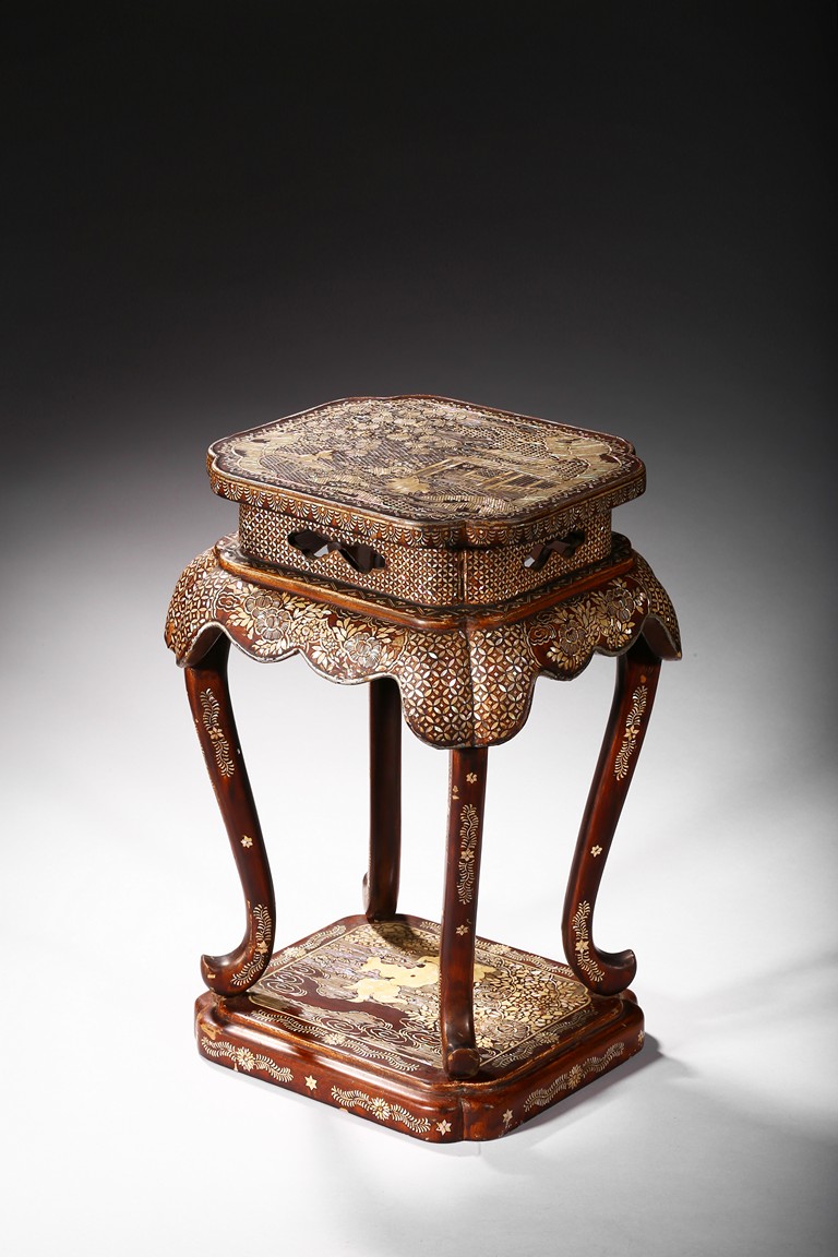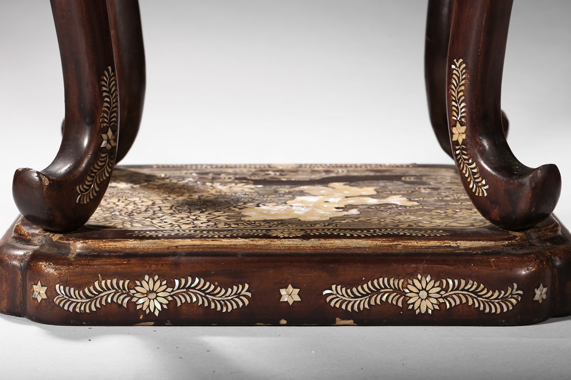 Of square section, overall decorated with mother of pearl depicting figures, landscape, and foliate scrolls, supported on four cabriole stands.