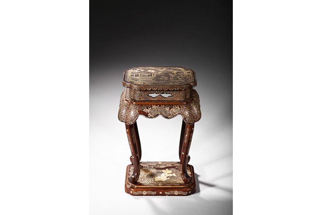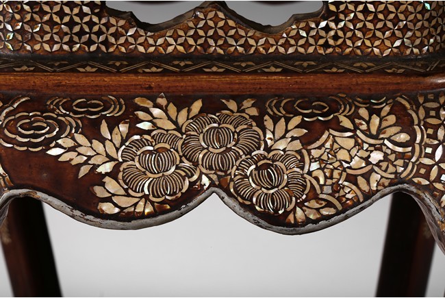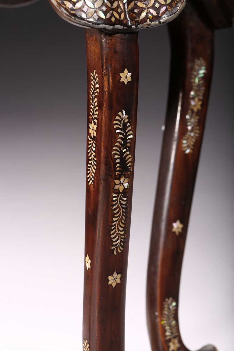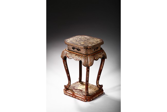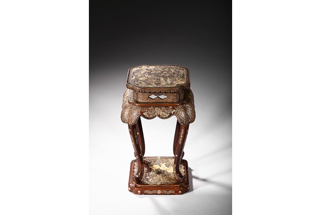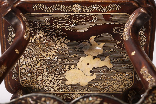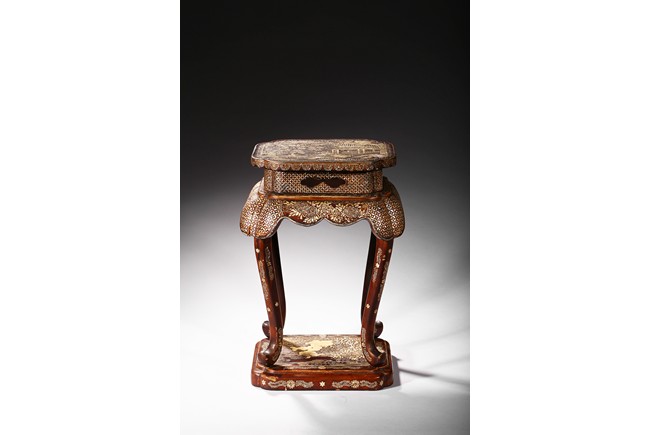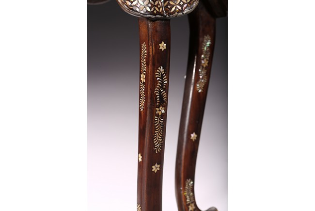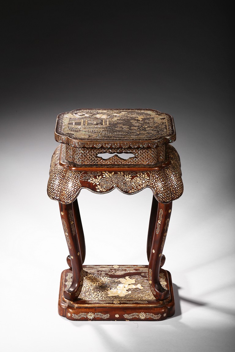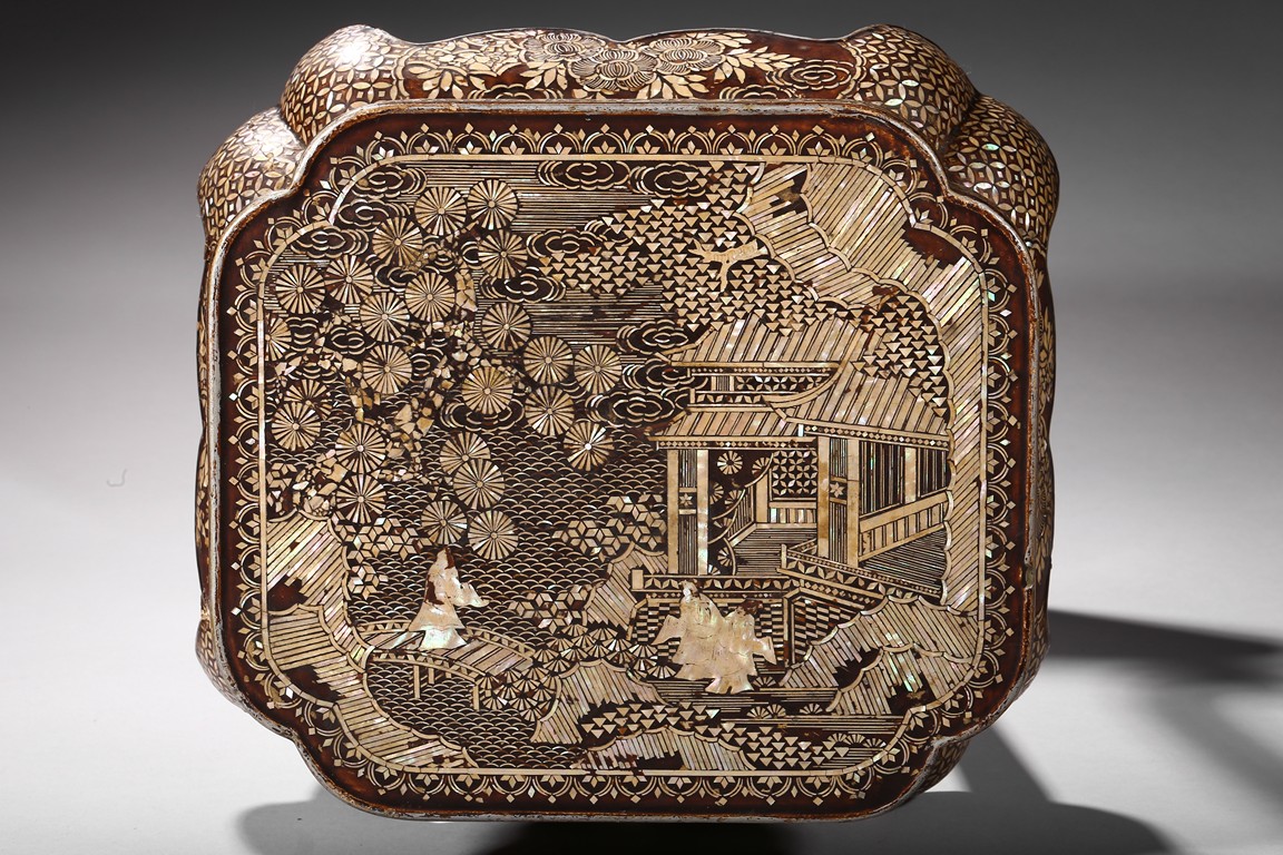 Of square section, overall decorated with mother of pearl depicting figures, landscape, and foliate scrolls, supported on four cabriole stands.