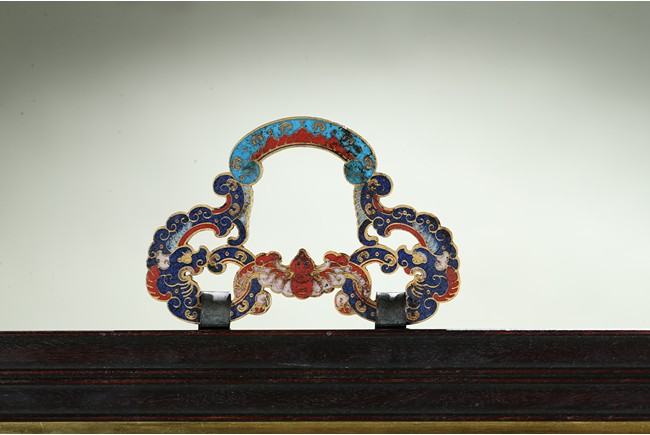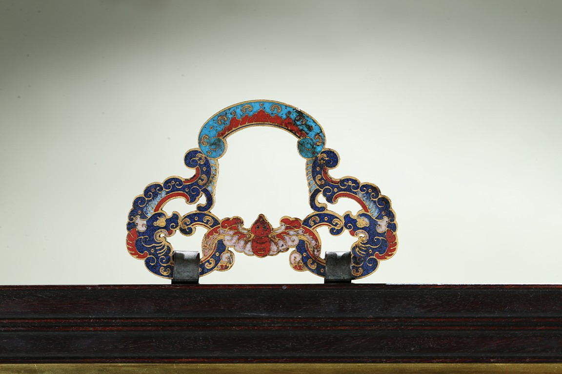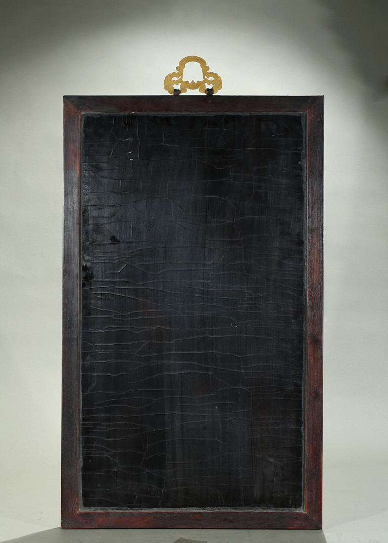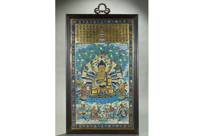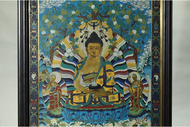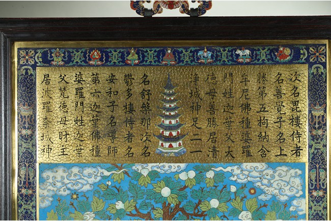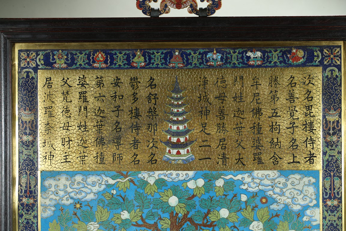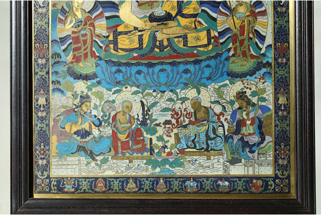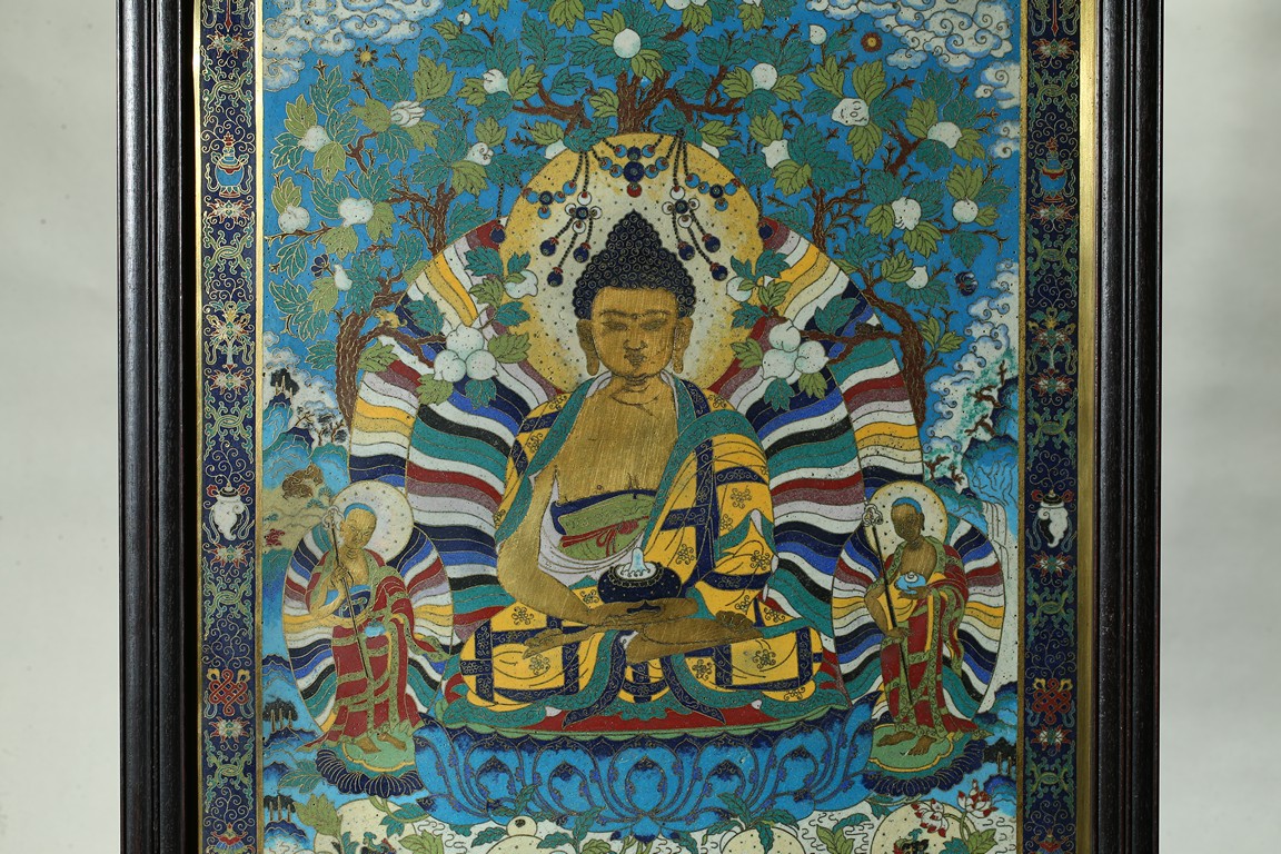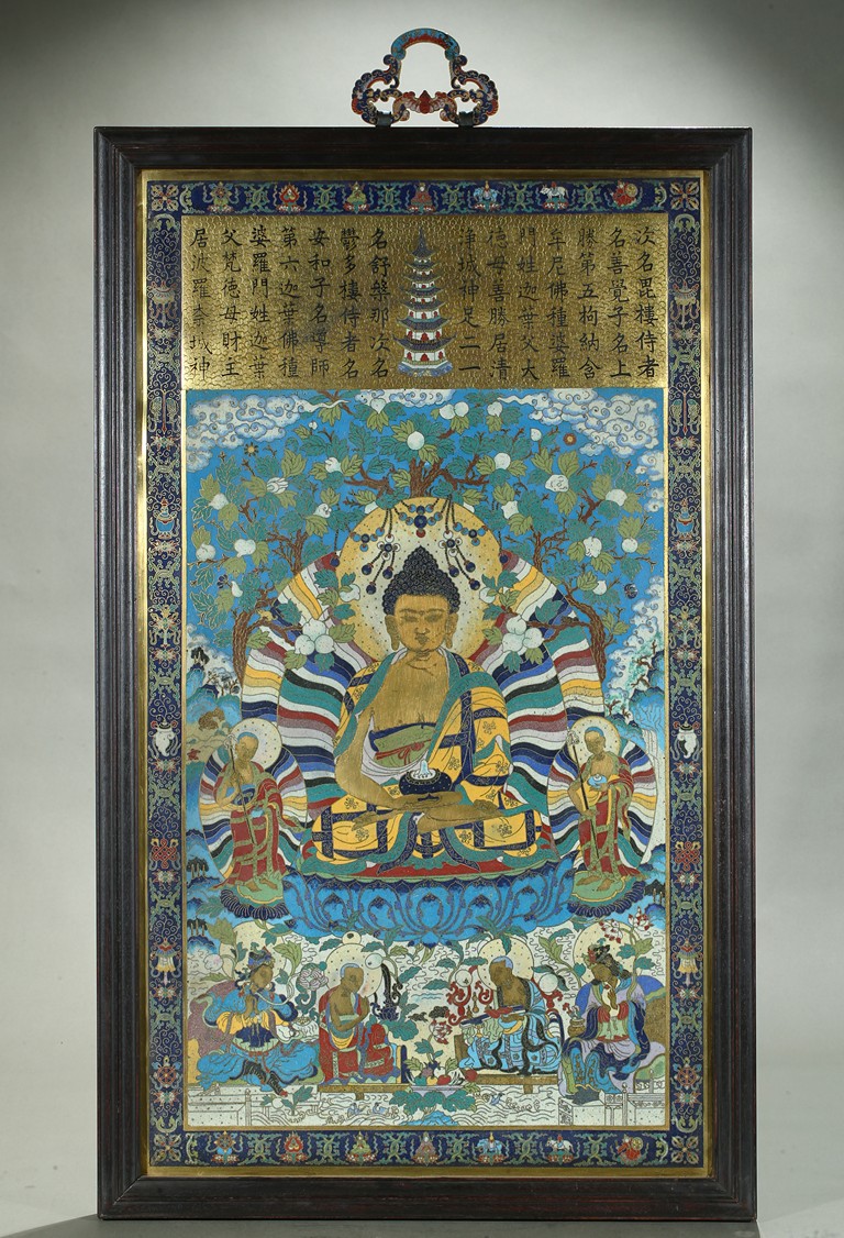 The rectangular panel is finely enamelled in vivid tones to depict the Shakyamuni at the center seated on lotus throne and surrounded by attendants and followers, the panel top finely inscribed with buddhist script describing Shakyamuni's background. Qing Dynasty period.