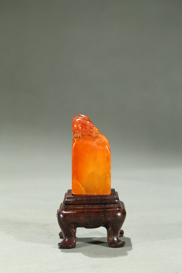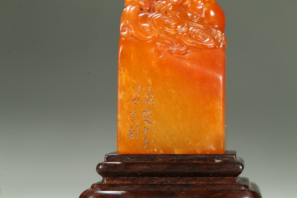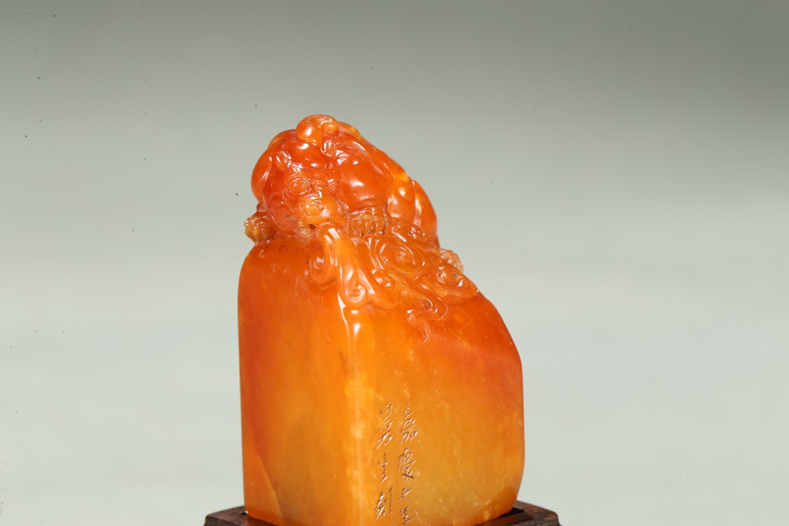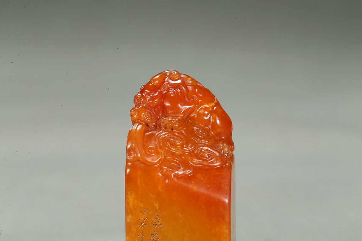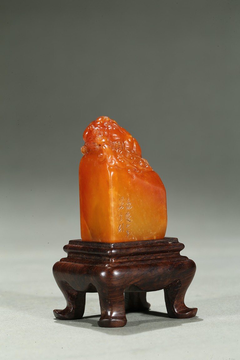 Of square section, finely carved with a mythical lion with bulging eyes and large nostrils, the side inscribed in running script with characters Jiaqing qi nian and artist signature, the seal face with four characters, the stone is of orange to golden caramel tone with natural veining. Qing Dynasty Jiaqing period.
