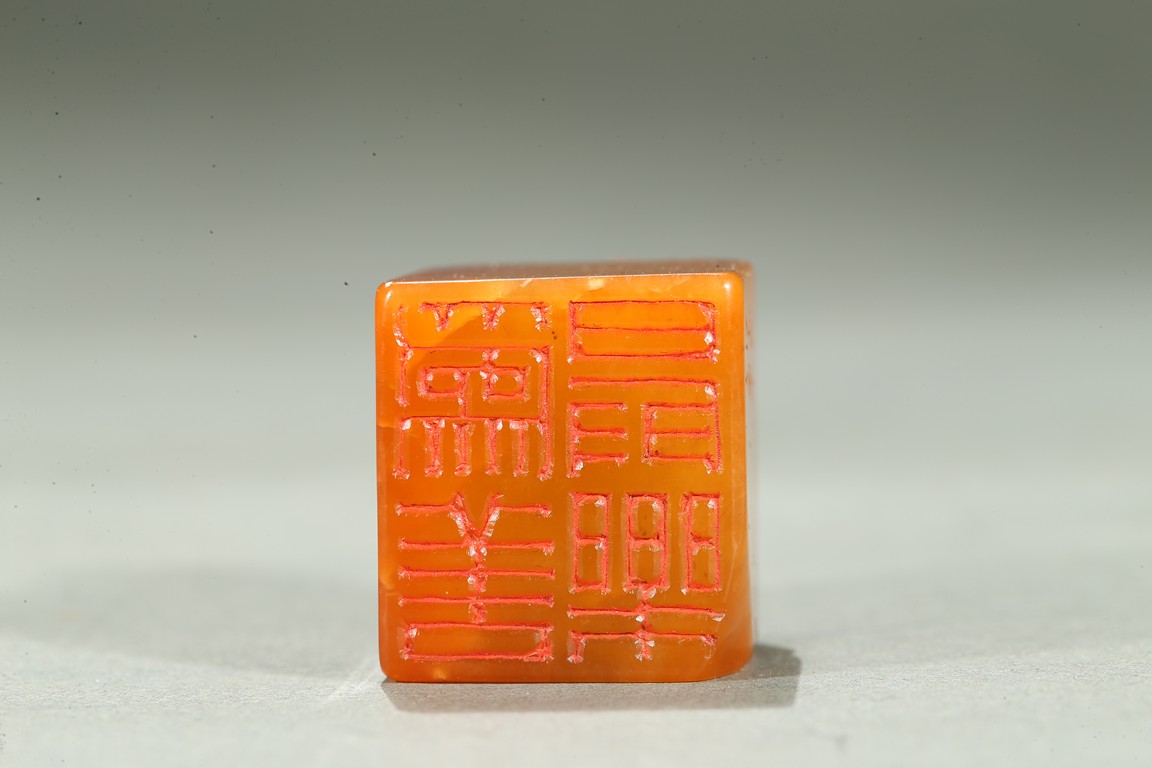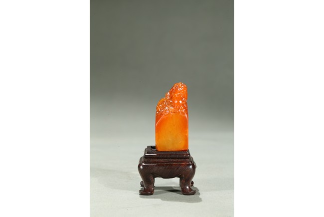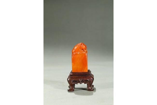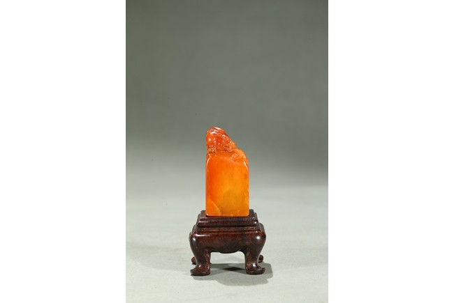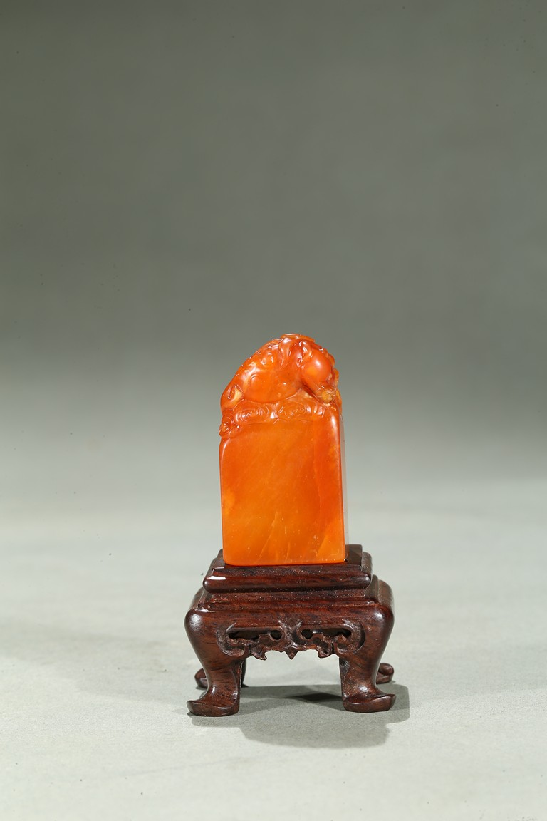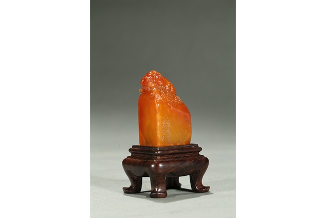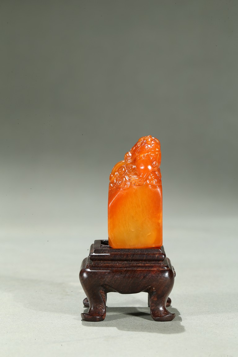 Of square section, finely carved with a mythical lion with bulging eyes and large nostrils, the side inscribed in running script with characters Jiaqing qi nian and artist signature, the seal face with four characters, the stone is of orange to golden caramel tone with natural veining. Qing Dynasty Jiaqing period.