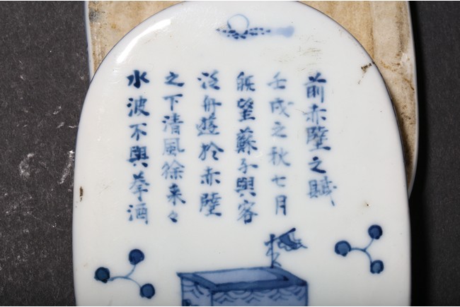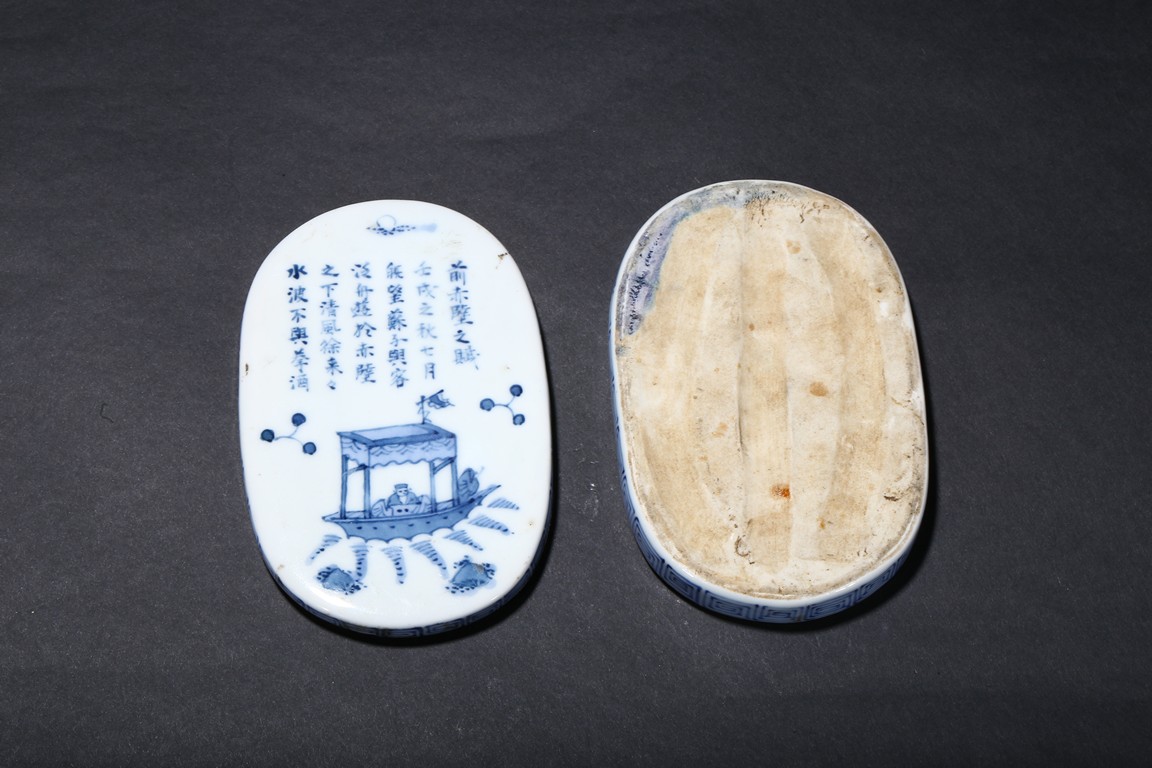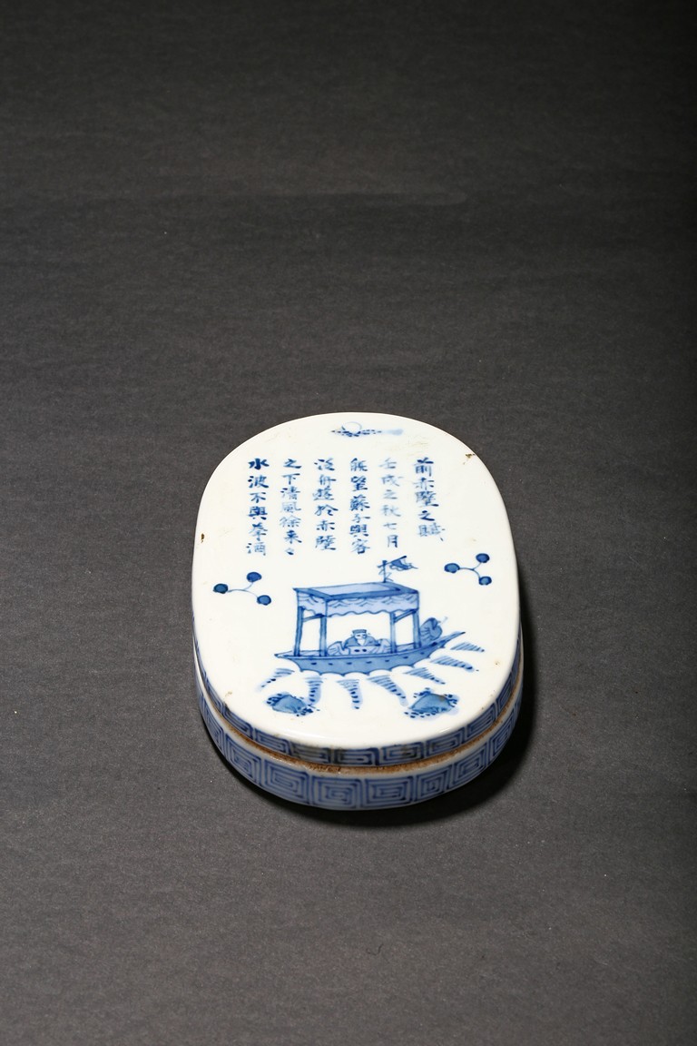Of oval shape, finely enameled with two figures traveling on a boat, with a inscription above, key-fret pattern on the rim, the inside of the cover painted with a pine tree. Qing Dynasty period.