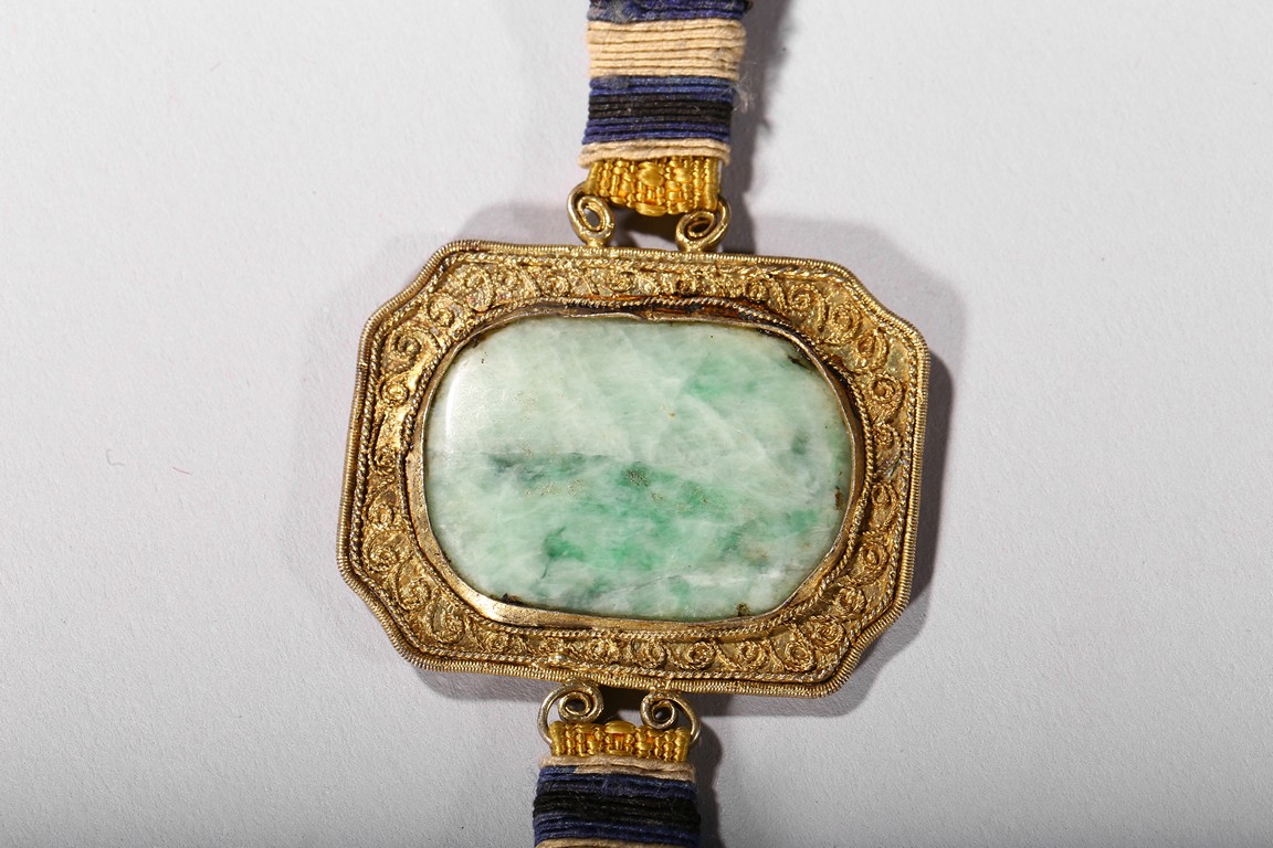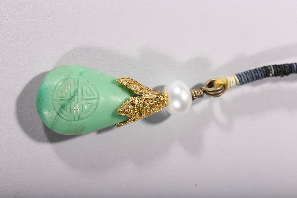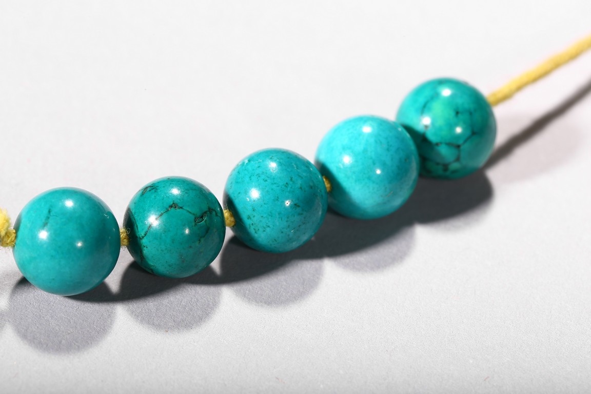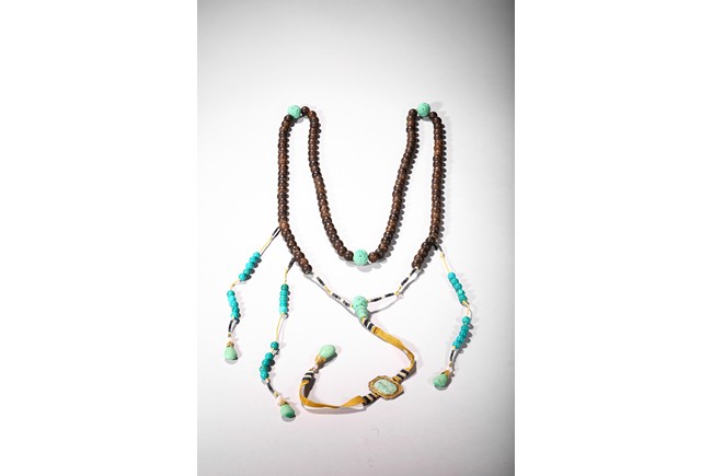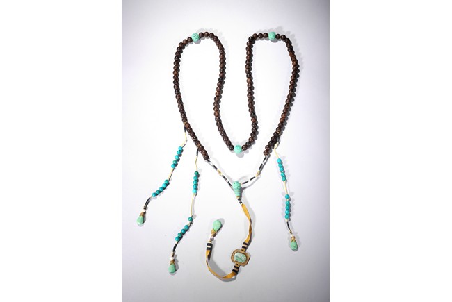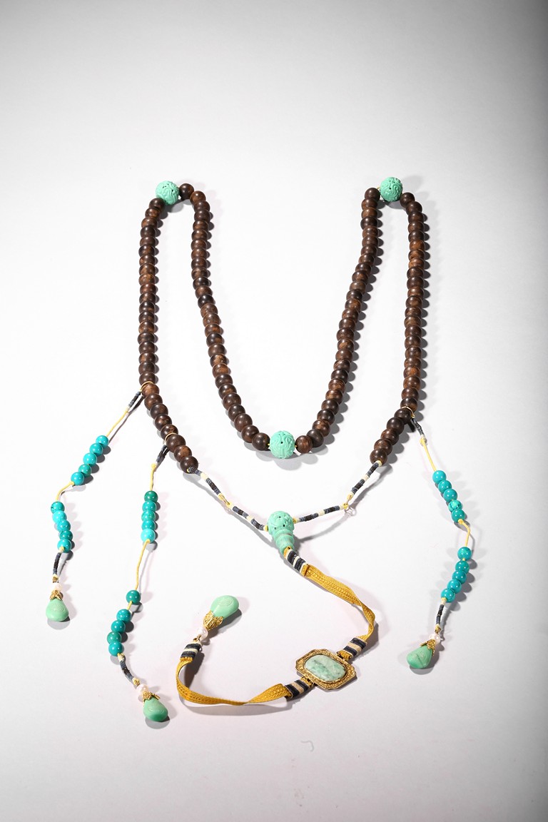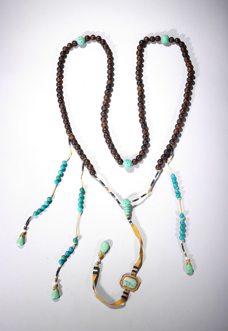 Consisting of 108 tanxiangmu wood round beads and turquoise pendant and beads. Qing Dynasty period.
