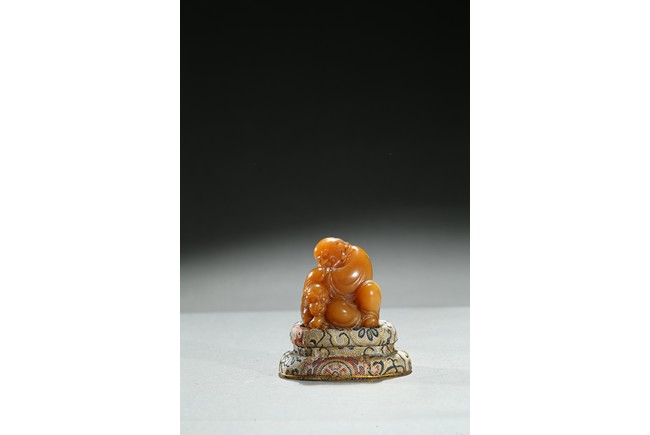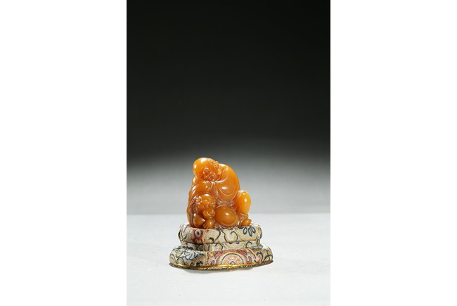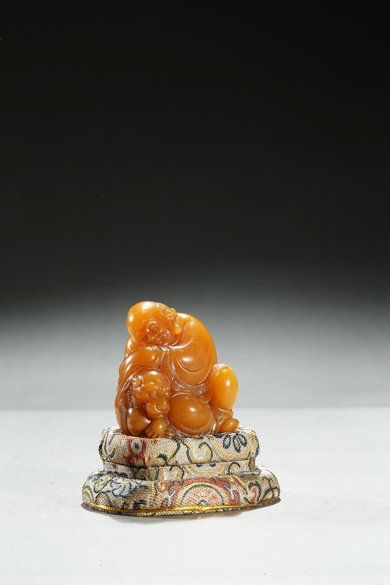 The luohan is shown resting upon a recumbent tiger, with left knee raised, wearing long robes with incised hems, the back incised with auspicious cloud pattern and two character 'Yu Xuan'. The stone is of golden orange tone with excellent translucency. Qing Dynasty period.