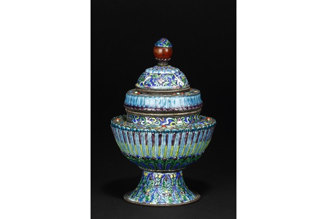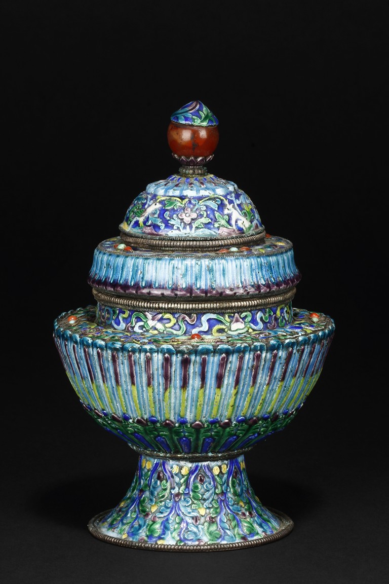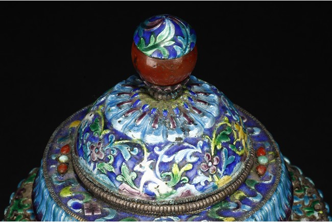 Of multiple conical form, the vessel’s body decorated with floral designs on the side, above scrolling banana leave patterns, supported by splayed round foot ring, decorated with vines, leaves, flowers, and tendrils, the lid topped by a red bead finial, and the shoulder decorated with gems, including ruby, agate, turquoise, and amber. Qing Dynasty Period.