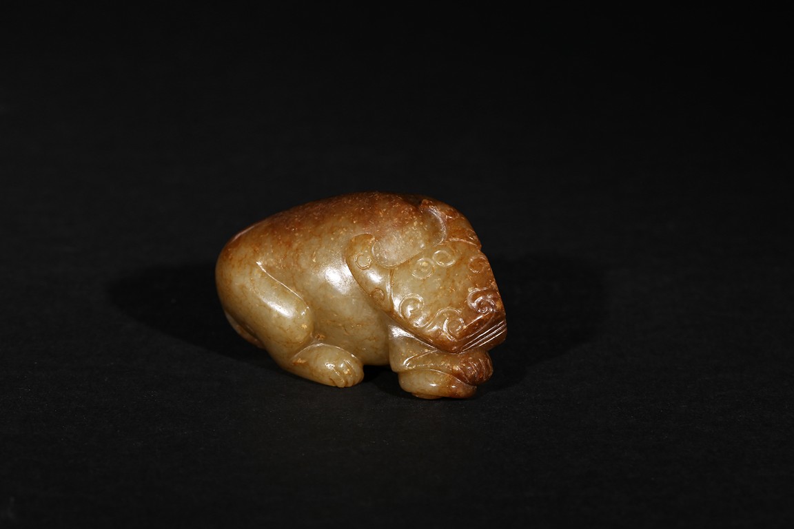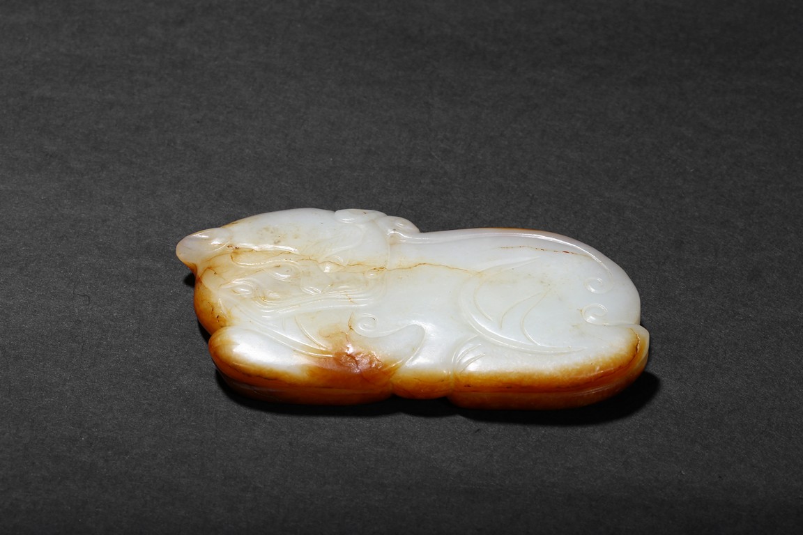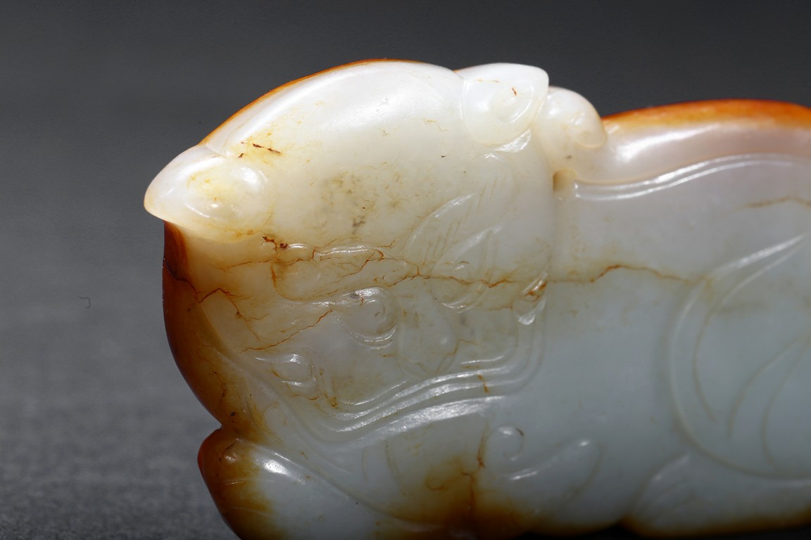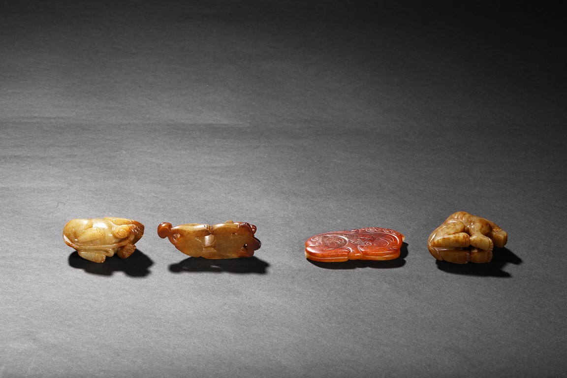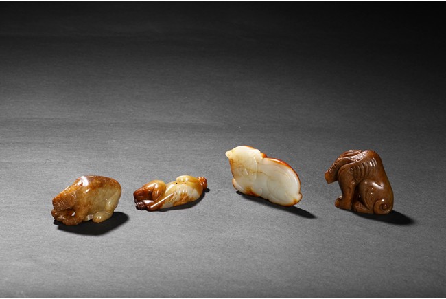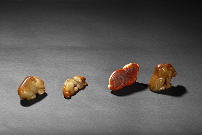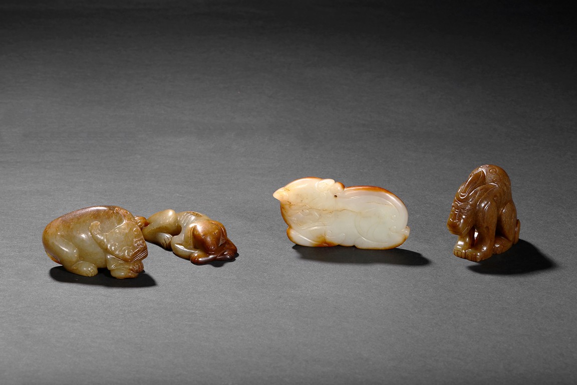 Consisting of a recumbent celadon jade buffalo, with russet inclusions; a recumbent mythical beast of russet and celadon tone; a recumbent dog of celadon tone and russet inclusion; a white and russet jade carved lion pendant. Ming/Qing Dynasty period.