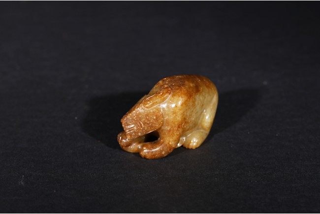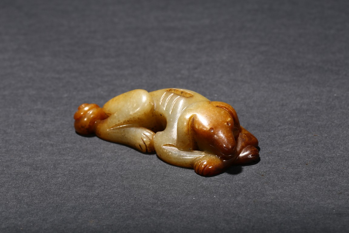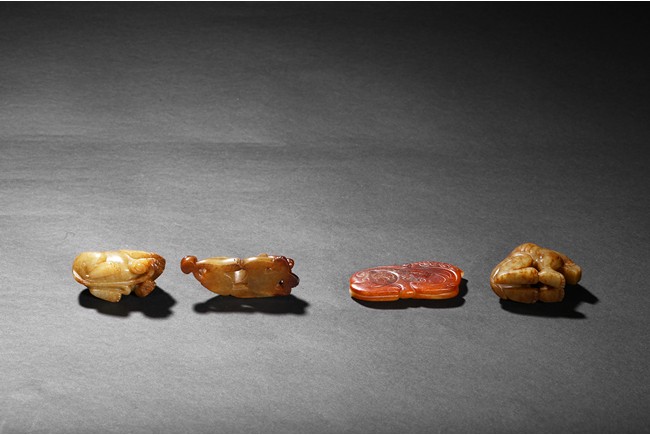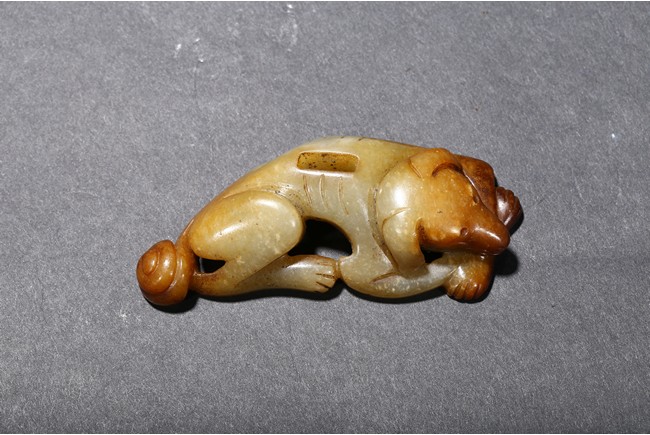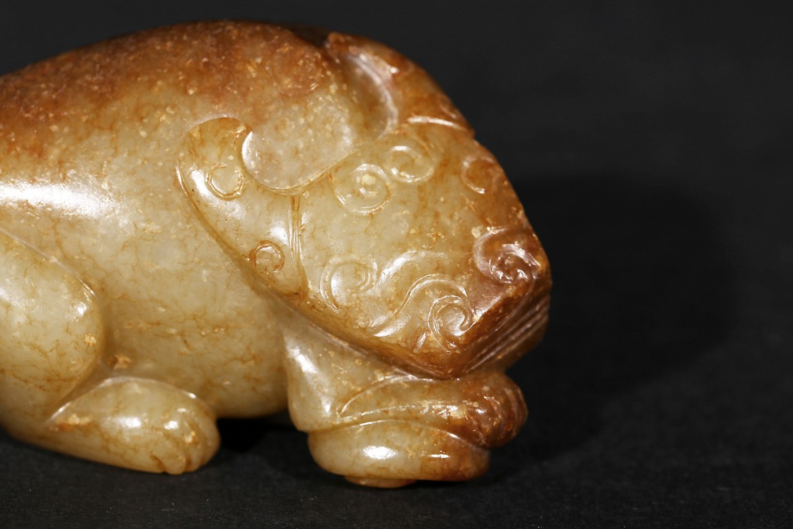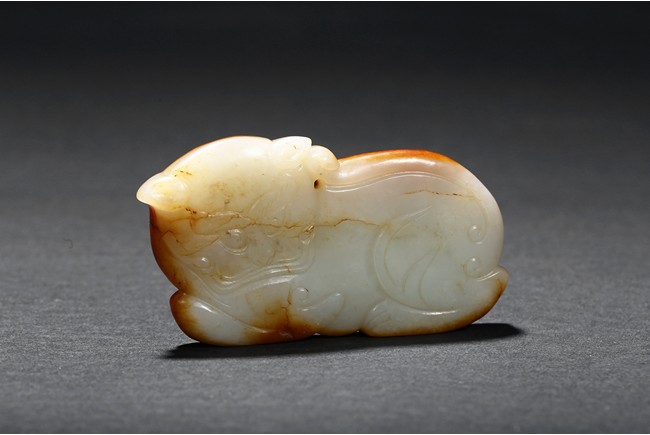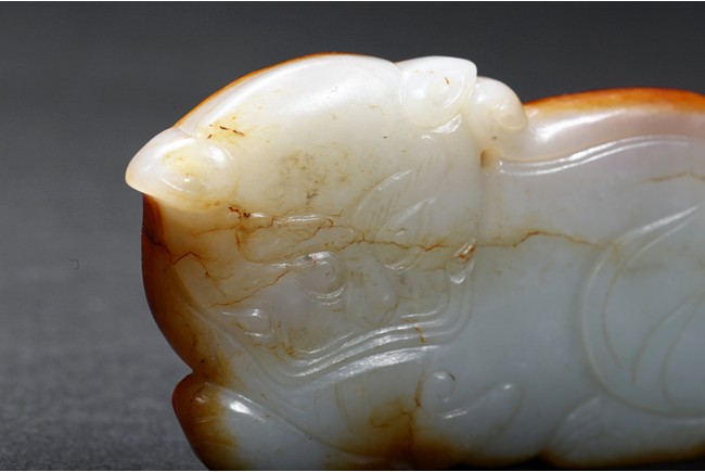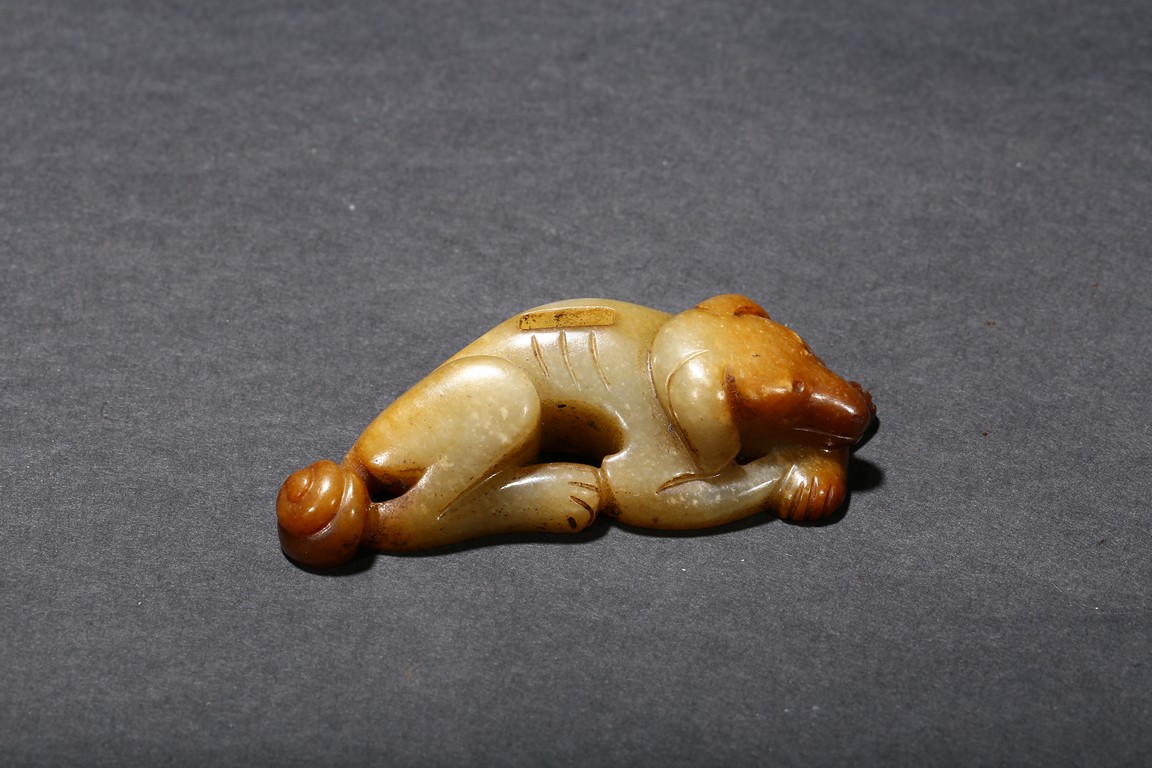 Consisting of a recumbent celadon jade buffalo, with russet inclusions; a recumbent mythical beast of russet and celadon tone; a recumbent dog of celadon tone and russet inclusion; a white and russet jade carved lion pendant. Ming/Qing Dynasty period.