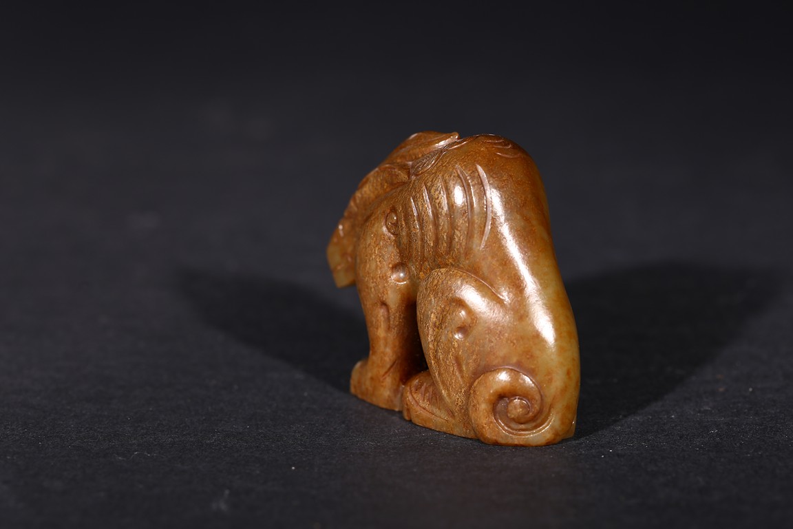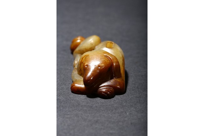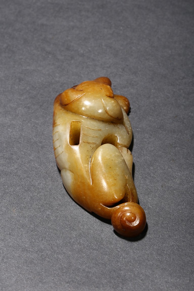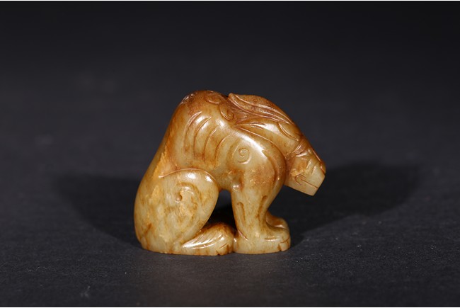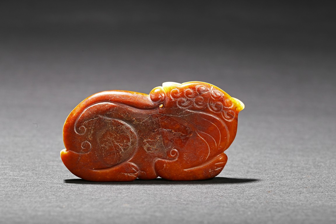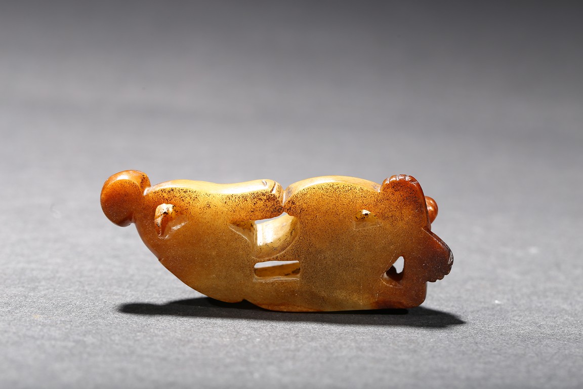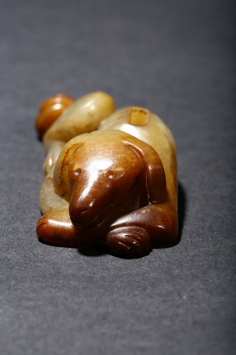 Consisting of a recumbent celadon jade buffalo, with russet inclusions; a recumbent mythical beast of russet and celadon tone; a recumbent dog of celadon tone and russet inclusion; a white and russet jade carved lion pendant. Ming/Qing Dynasty period.