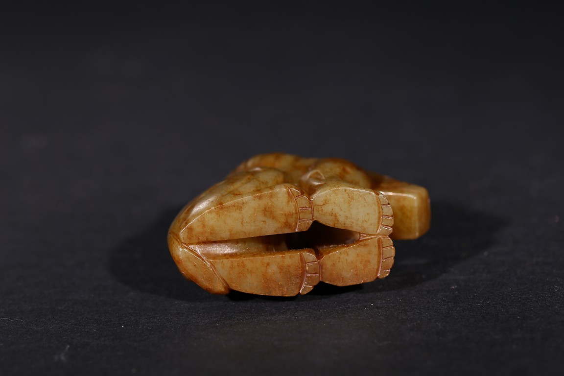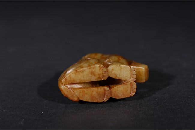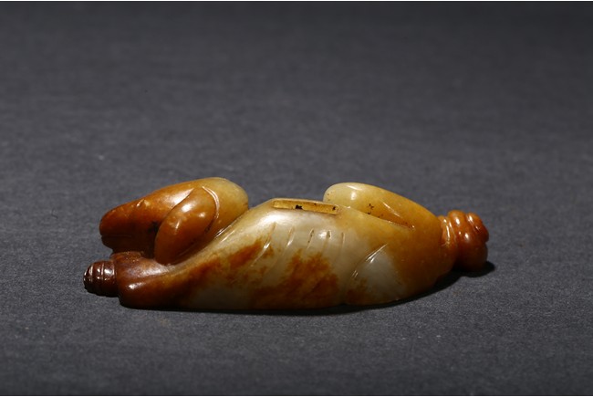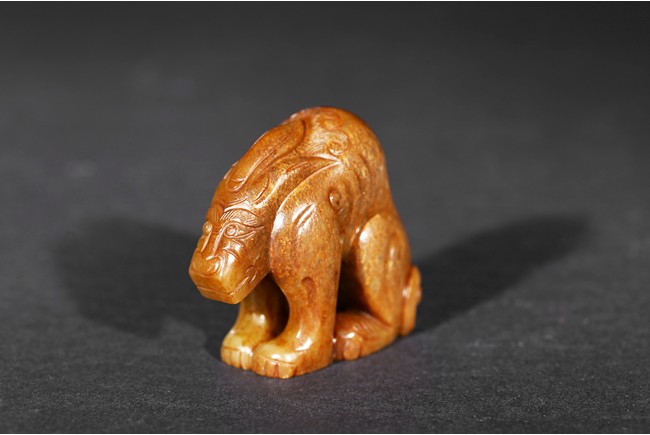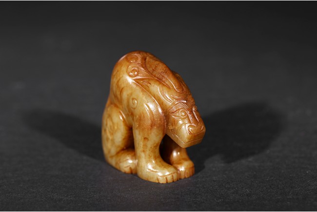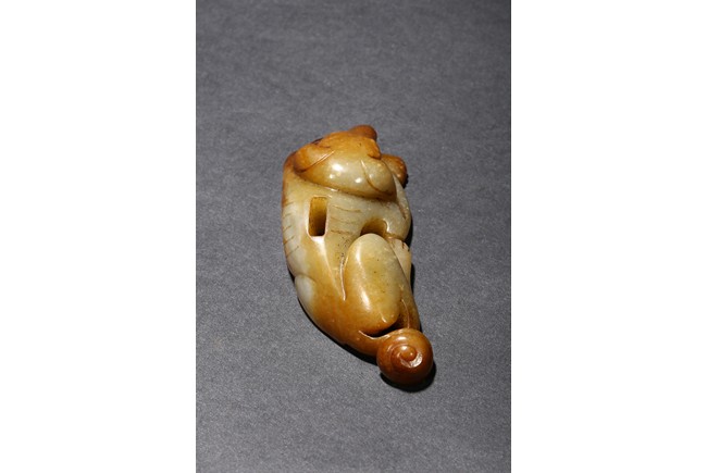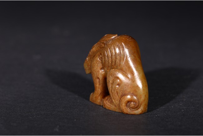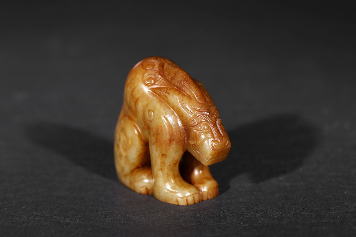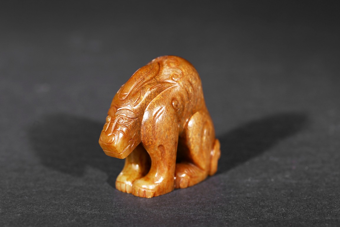 Consisting of a recumbent celadon jade buffalo, with russet inclusions; a recumbent mythical beast of russet and celadon tone; a recumbent dog of celadon tone and russet inclusion; a white and russet jade carved lion pendant. Ming/Qing Dynasty period.