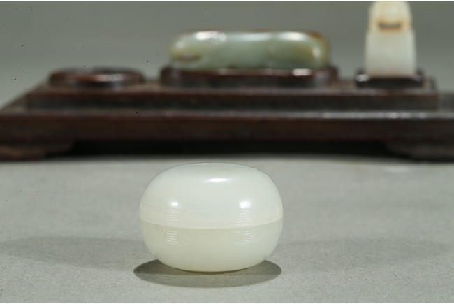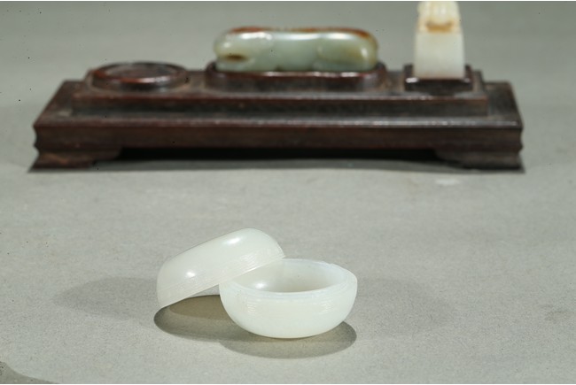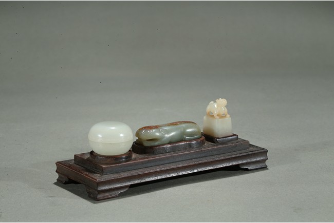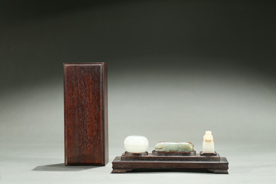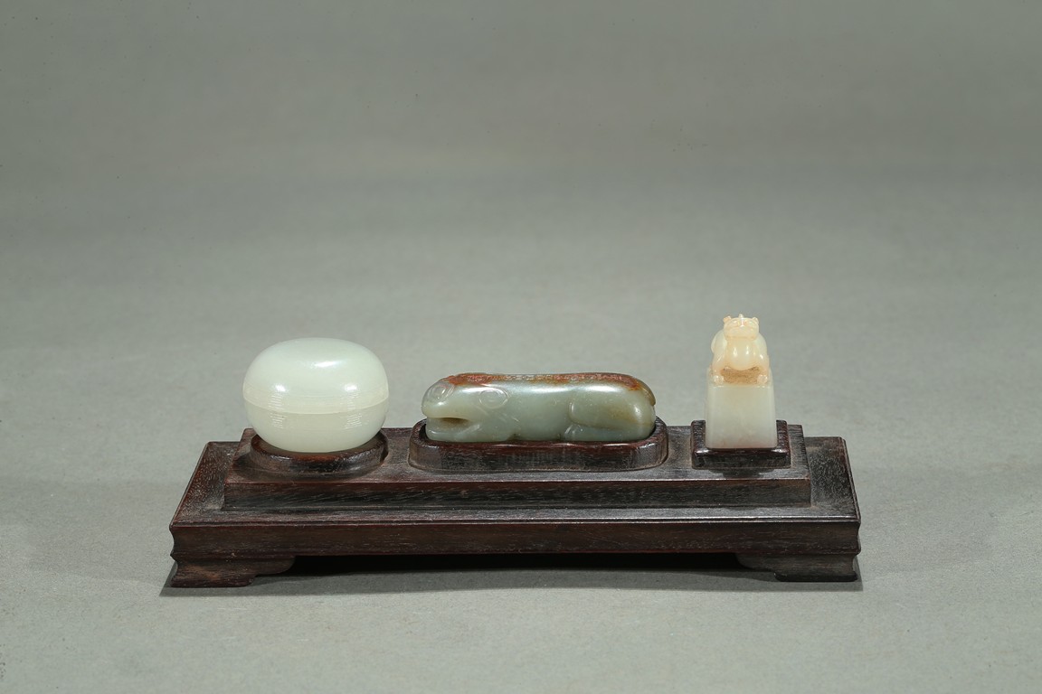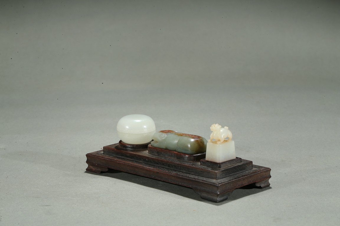 The set consists of a rectangular sectioned jade seal topped with mythical beast finial, the seal face carved with four character inscription; a celadon jade recumbent mythical beast formed paper weight, top inscribed with inscriptions; and a white jade globular formed paste ink box, all fitted on rosewood stand with cover. Qing Dynasty period.