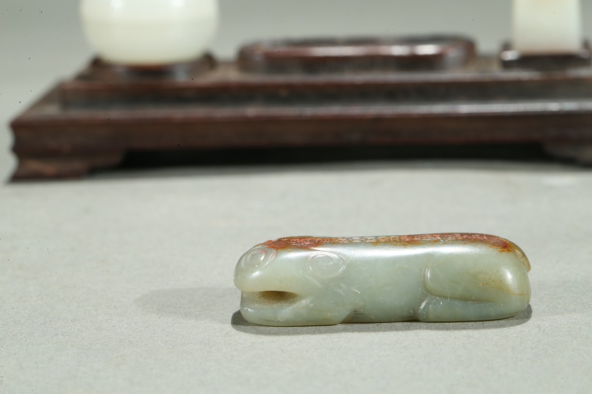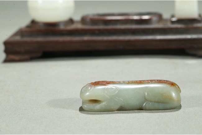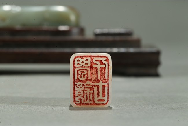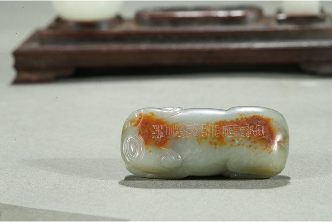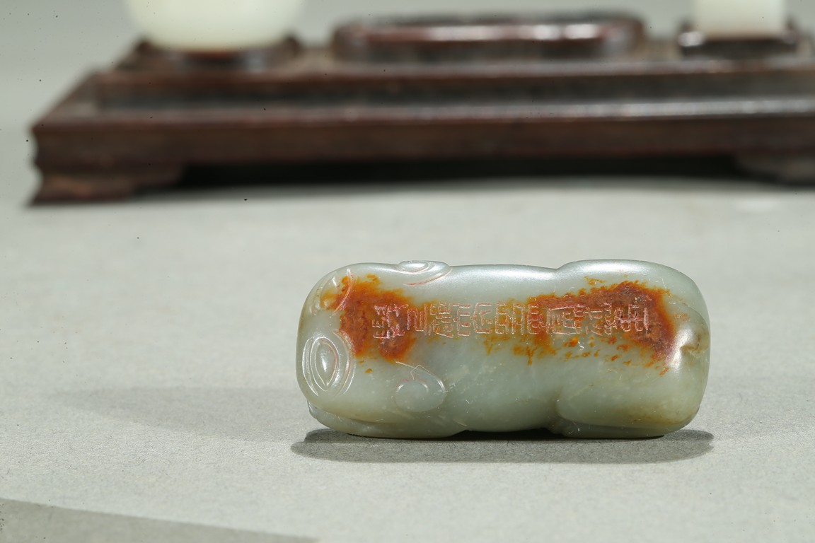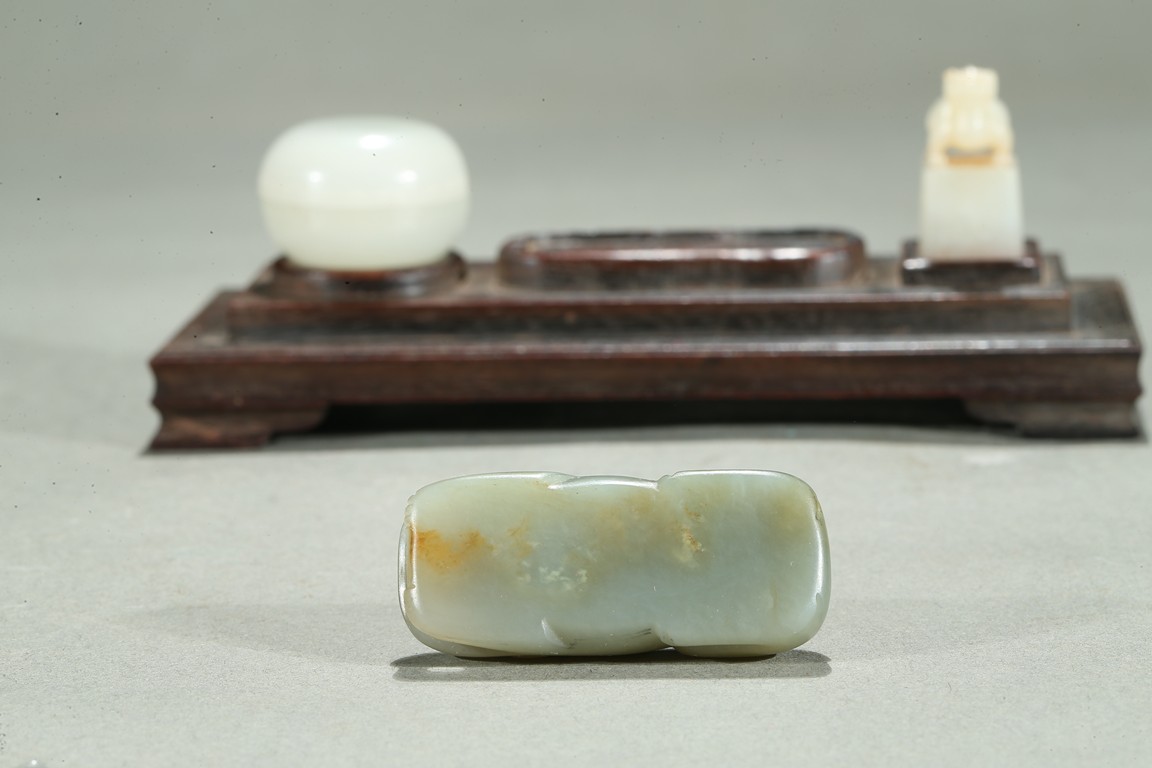 The set consists of a rectangular sectioned jade seal topped with mythical beast finial, the seal face carved with four character inscription; a celadon jade recumbent mythical beast formed paper weight, top inscribed with inscriptions; and a white jade globular formed paste ink box, all fitted on rosewood stand with cover. Qing Dynasty period.