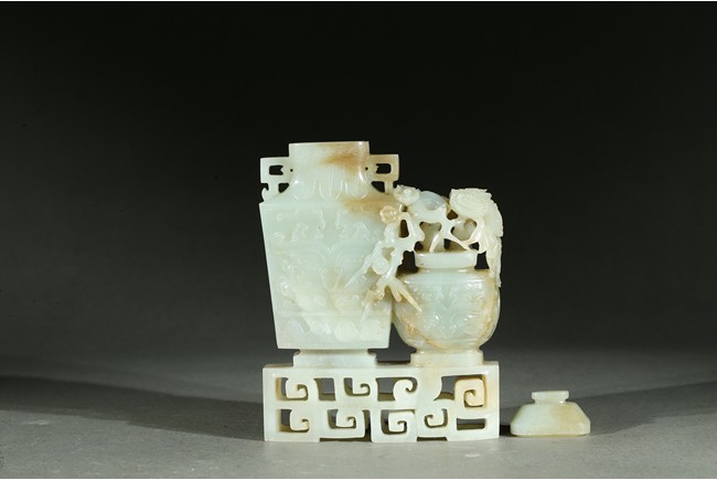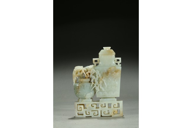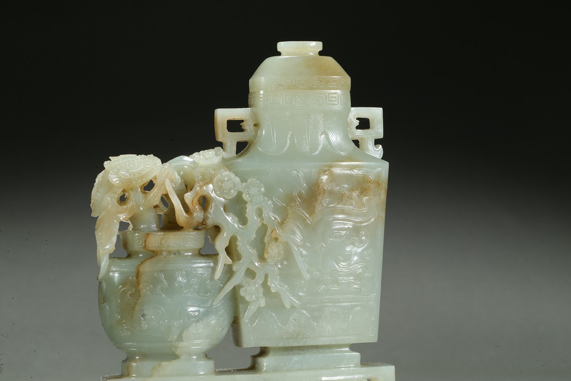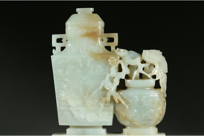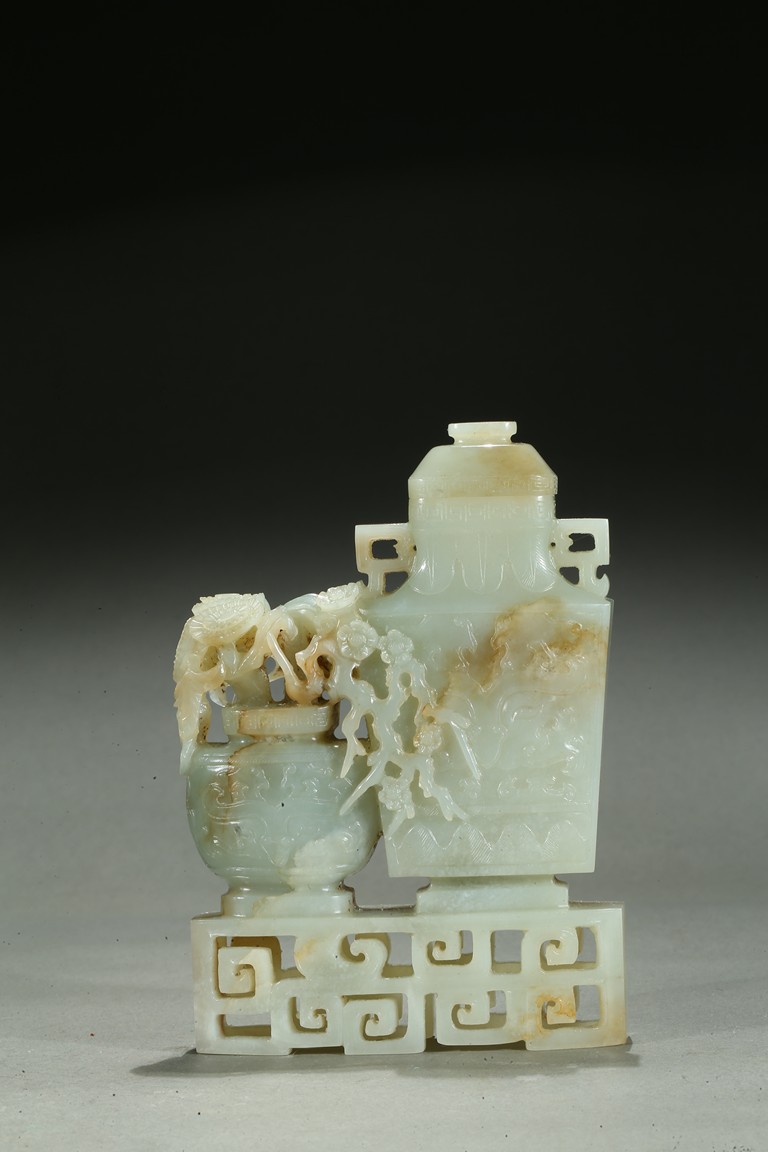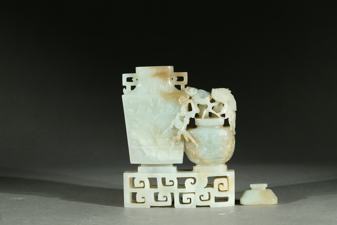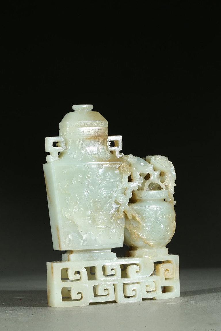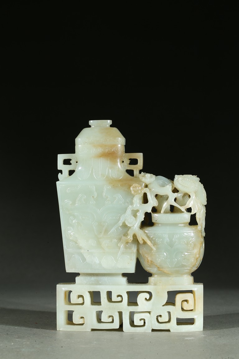 Carved in the form of two joined flattened vessels with archaistic taotie design carved to the exterior, the smaller vessel with plum blossom branches growing from the inside, all supported on an elaborate stand pierced with strapwork. Qing Dynasty period.