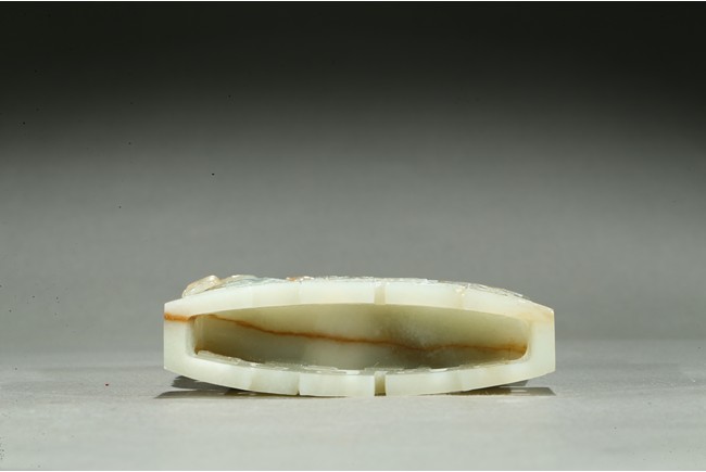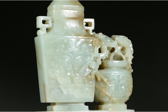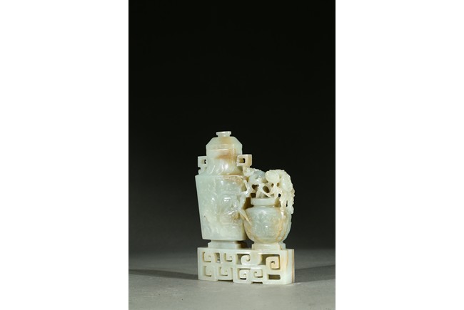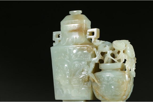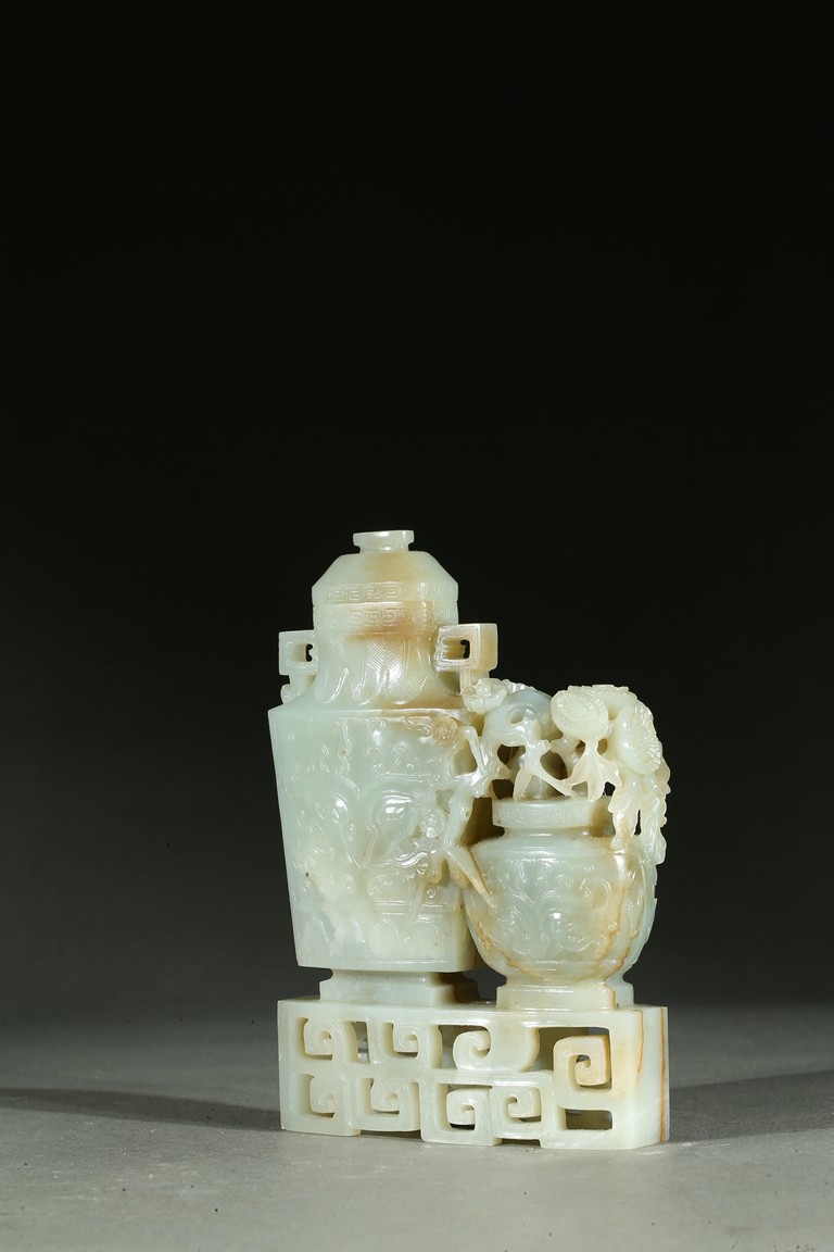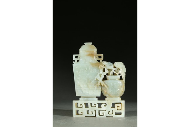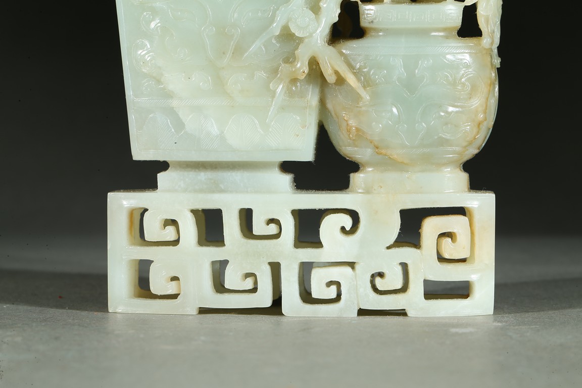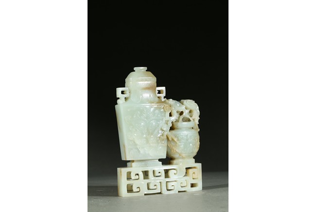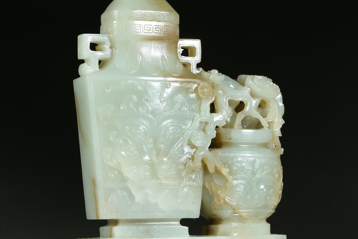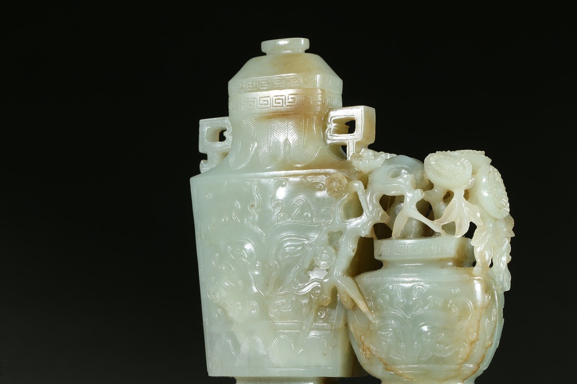 Carved in the form of two joined flattened vessels with archaistic taotie design carved to the exterior, the smaller vessel with plum blossom branches growing from the inside, all supported on an elaborate stand pierced with strapwork. Qing Dynasty period.