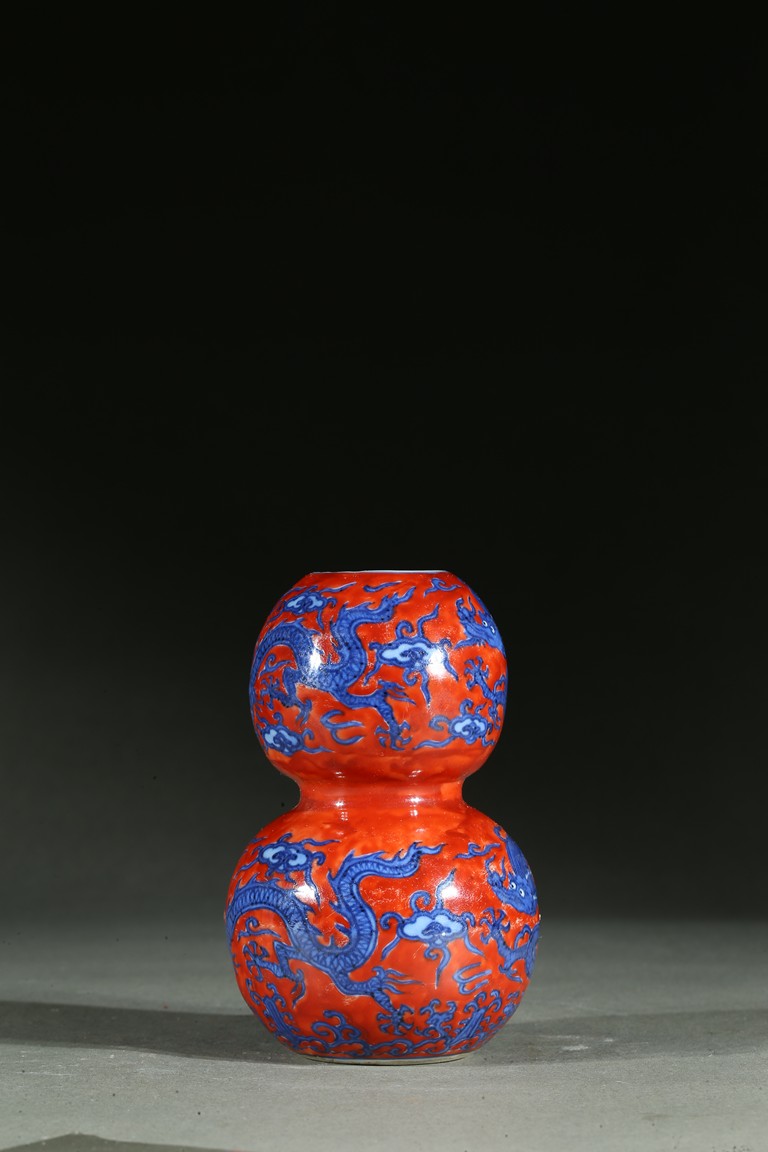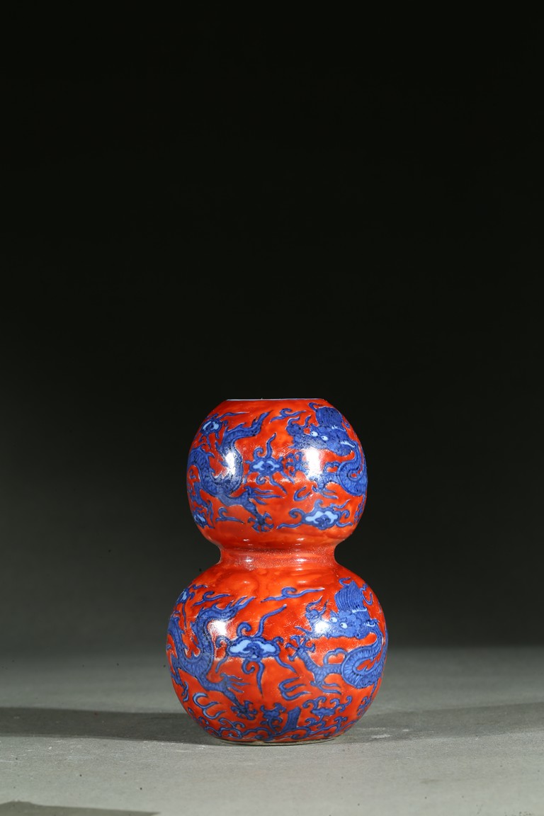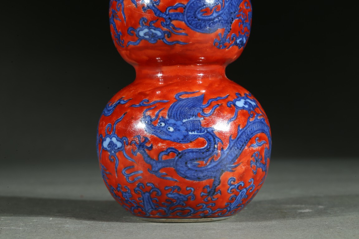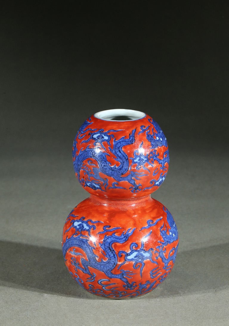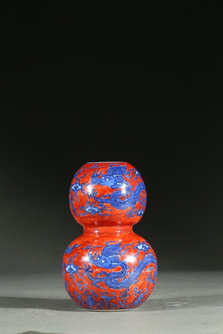 Modelled in the form of double gourd vase with two similar sized bulbs, each finely painted with two ferocious flying dragons chasing flaming pearl amongst auspicious clouds in blue enamel, all reserved on bright red glaze, the base with a Jiajing size character mark. Ming Dynasty period.