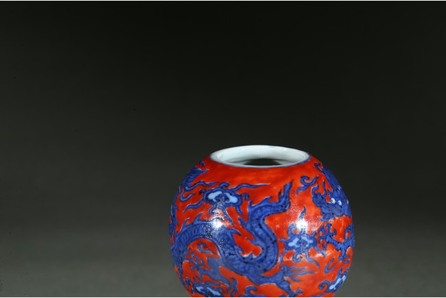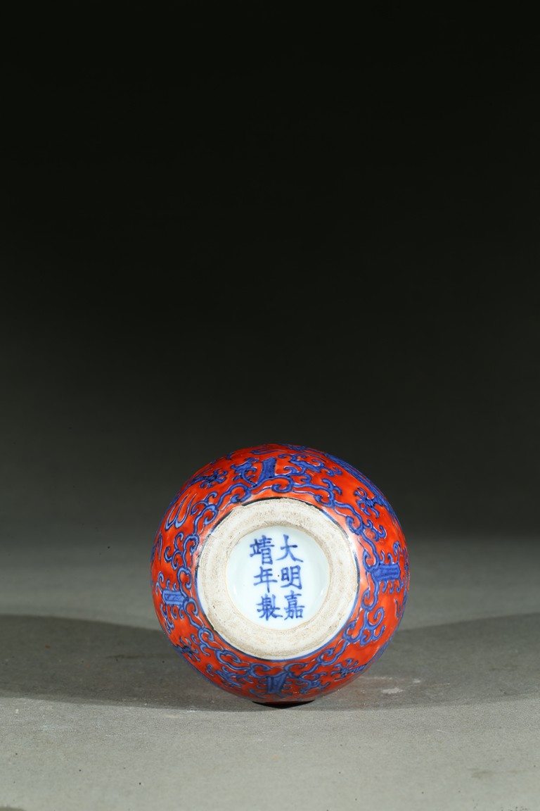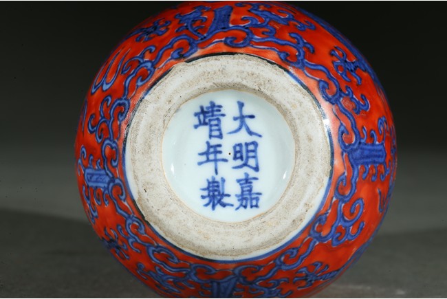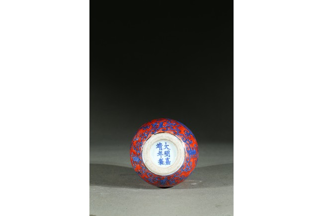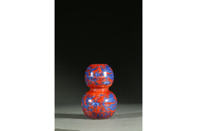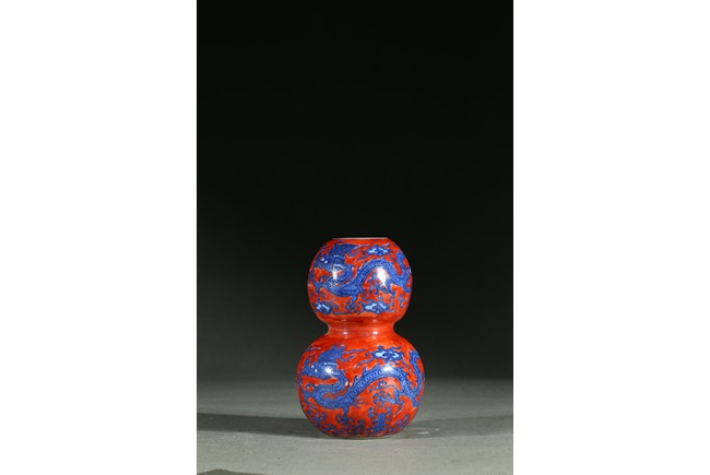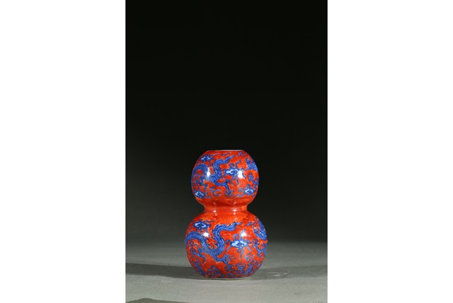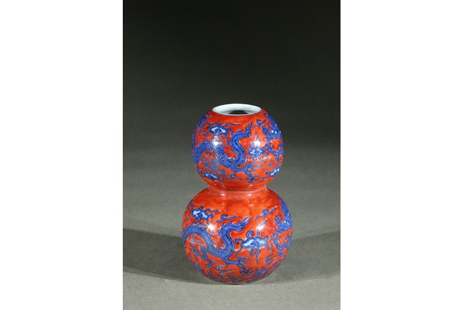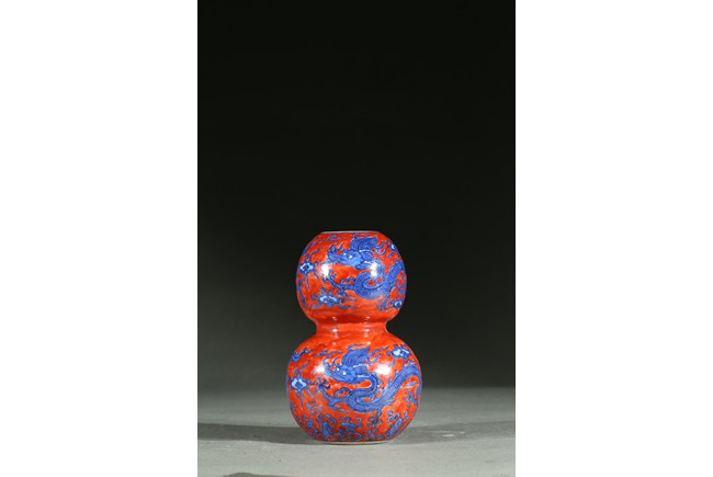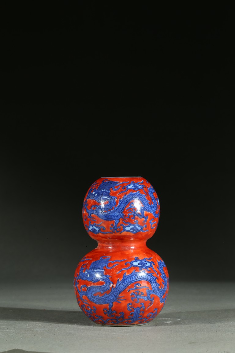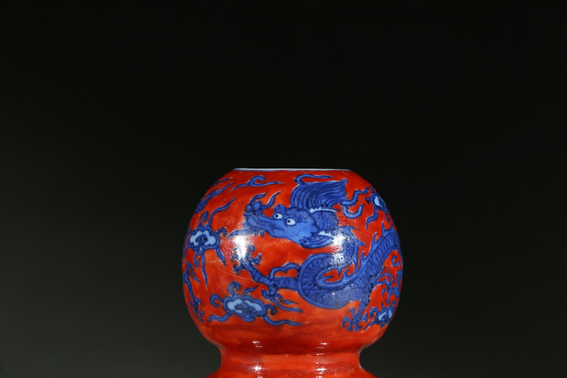 Modelled in the form of double gourd vase with two similar sized bulbs, each finely painted with two ferocious flying dragons chasing flaming pearl amongst auspicious clouds in blue enamel, all reserved on bright red glaze, the base with a Jiajing size character mark. Ming Dynasty period.