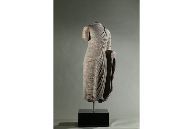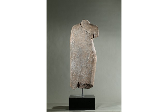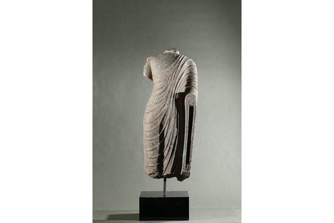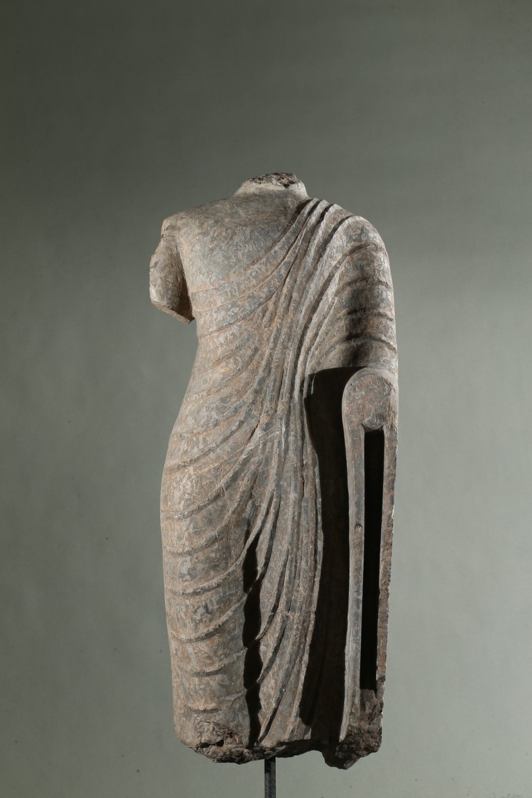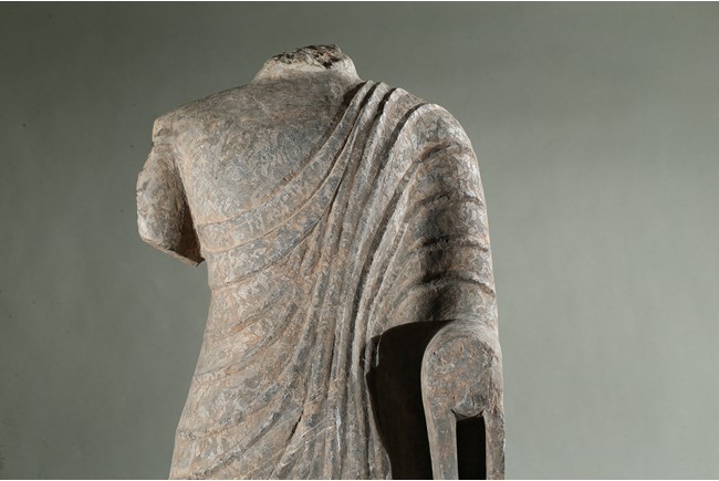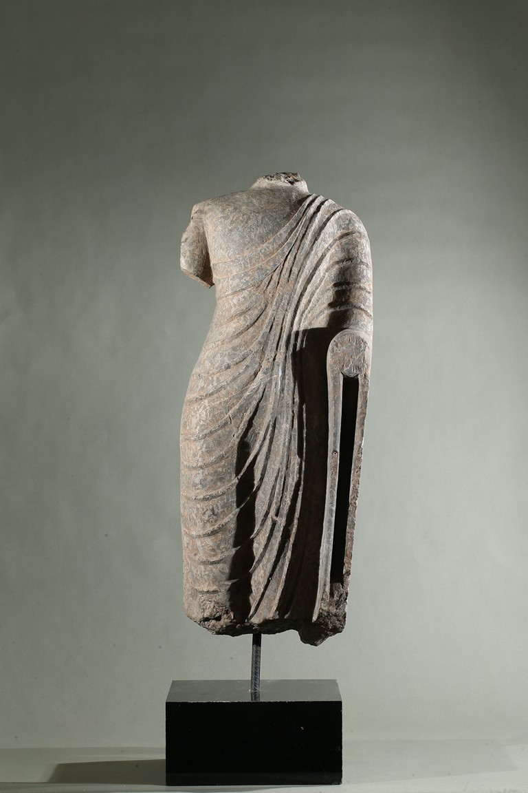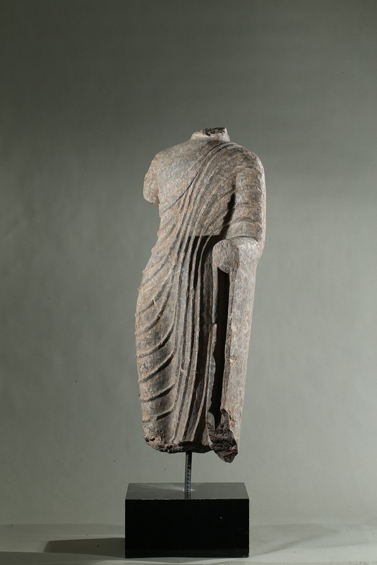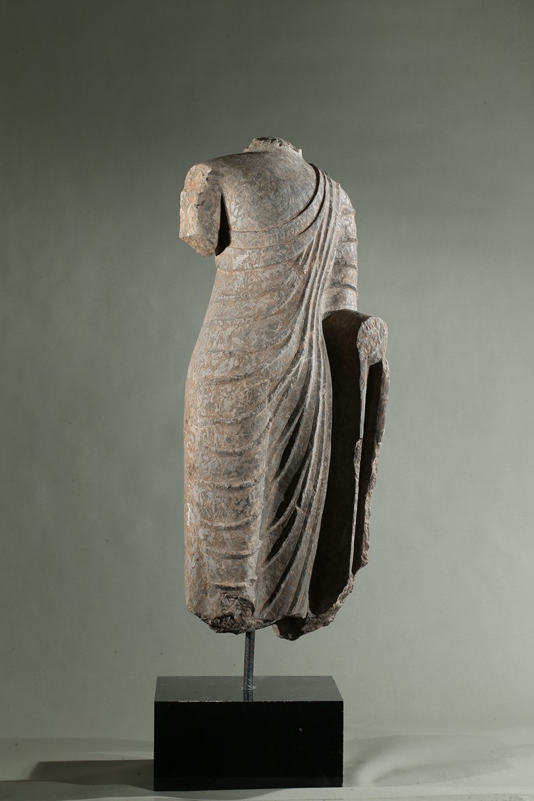 The limestone torso finely carved wearing a long robe with the undulating folds gracefully wrapped around the side, draped over the left elbow and falling down following the contours of the body, his left hand possibly raised in abhaya mudra.