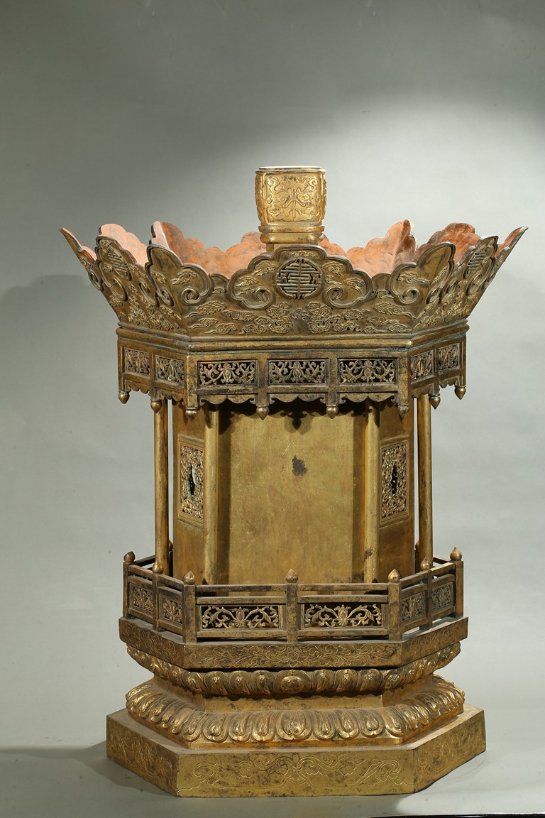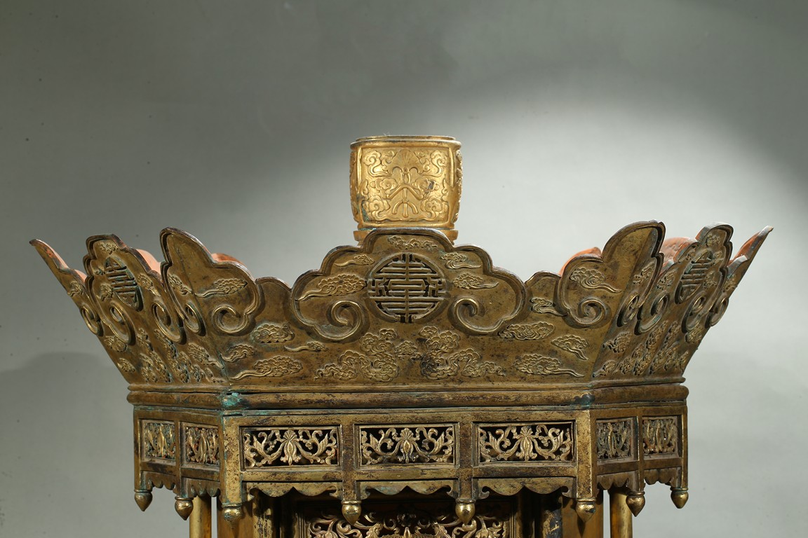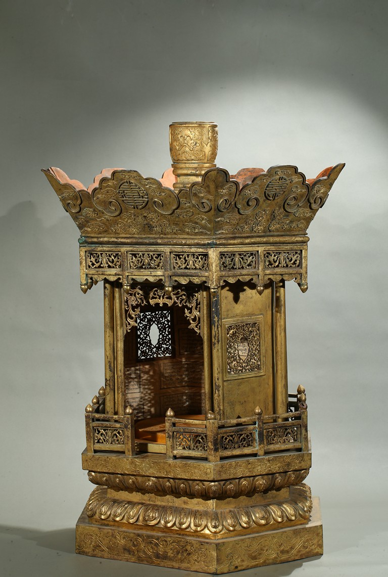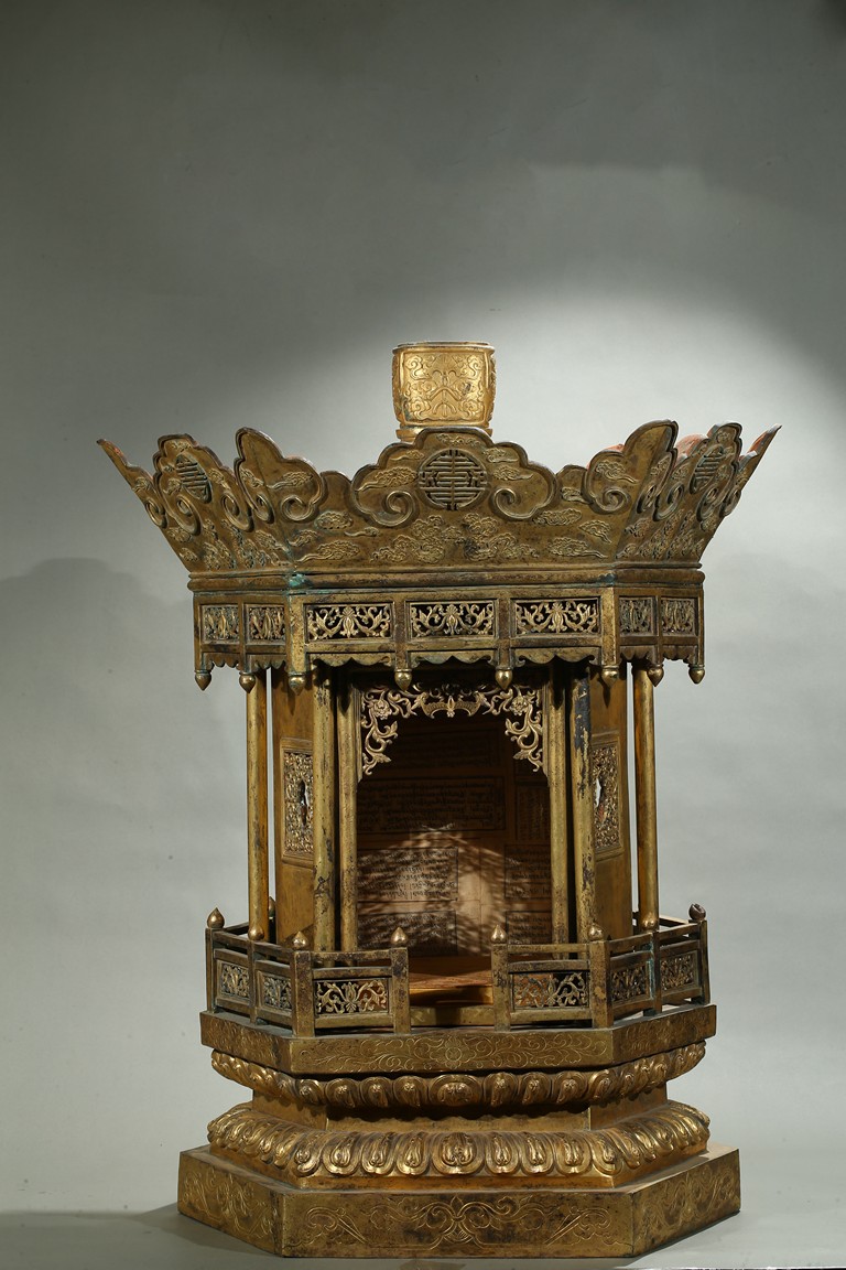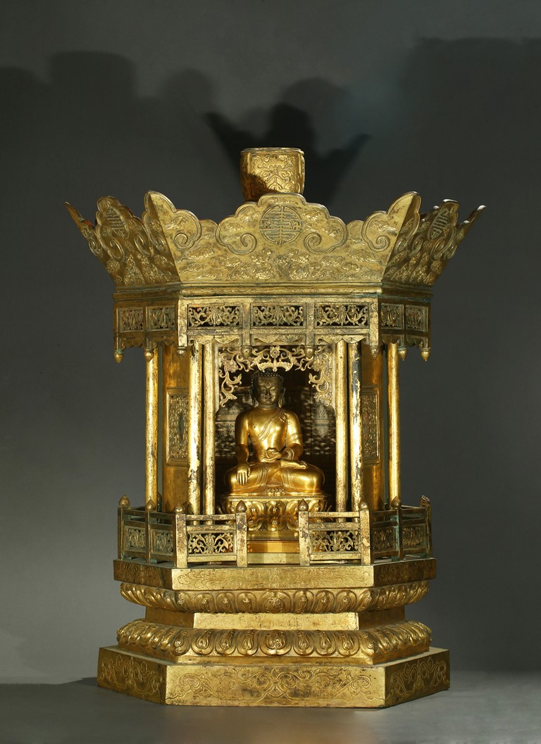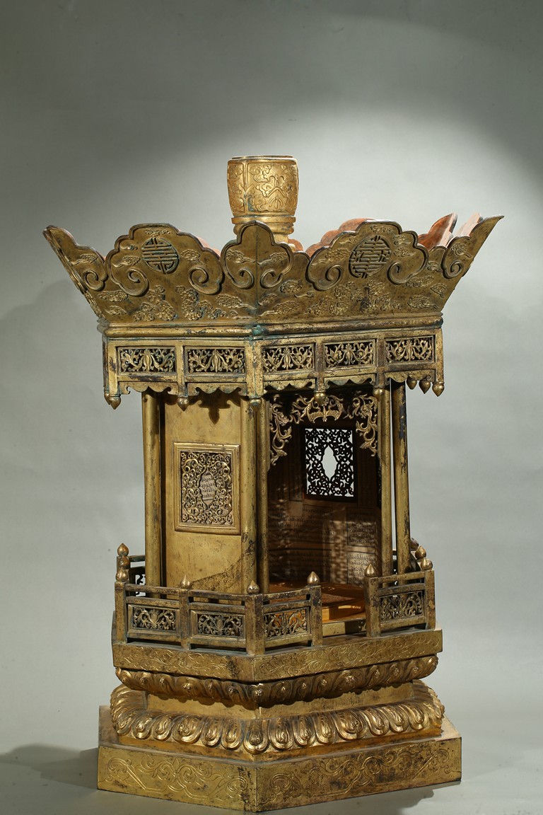 Of architectural pavilion form, the hexagonal pedestal base rising to the central open galleried section, each with cylindrical columns supportng the arched roof and with ornate pierced balustrades, the roof with shou symbols and auspicious clouds decorated in relief, the top surmounted with a rounded finial. The interior with an associated gilt-bronze figure of bodhisattva, the base sealed, seated in dhyanasana upon double lotus throne with right hand resting on leg, left hand holding a bowl in dhyana mudra, wearing loose-fitting robe falling in elegant folds, the serene face with downcast eyes and gentle smile flanked by pendulous earlobes, the head with tall ushnisha with tight curls. Qing Dynasty Qianlong period.