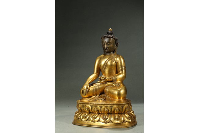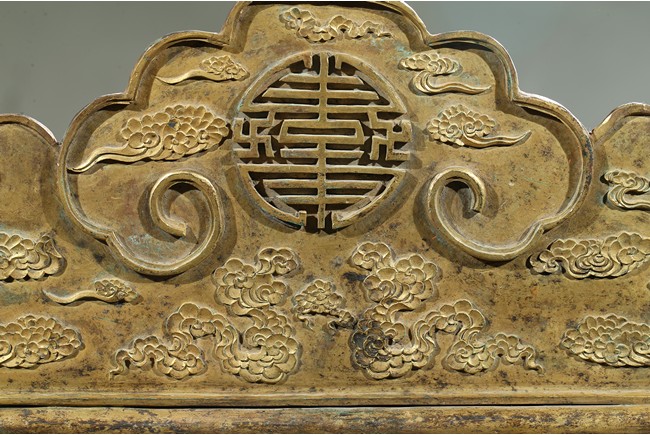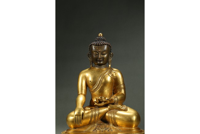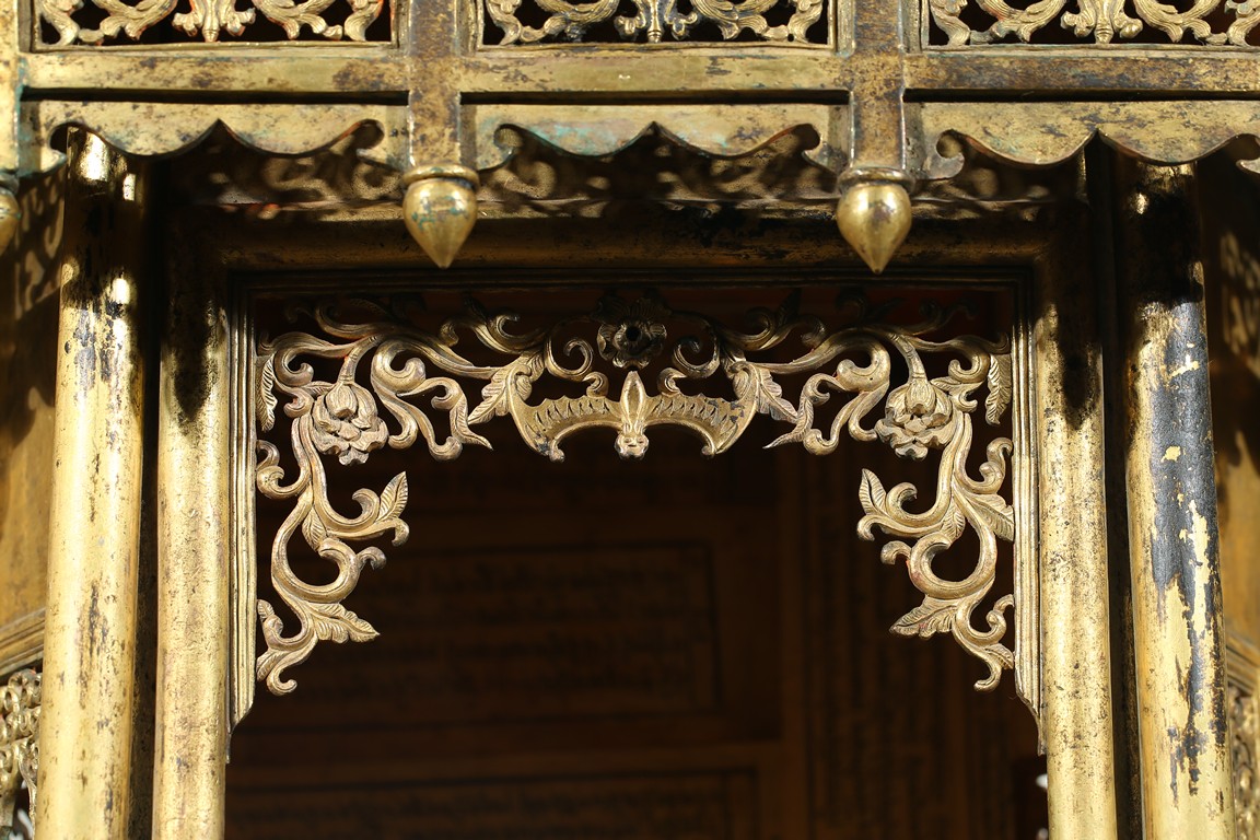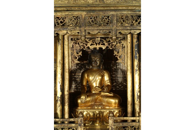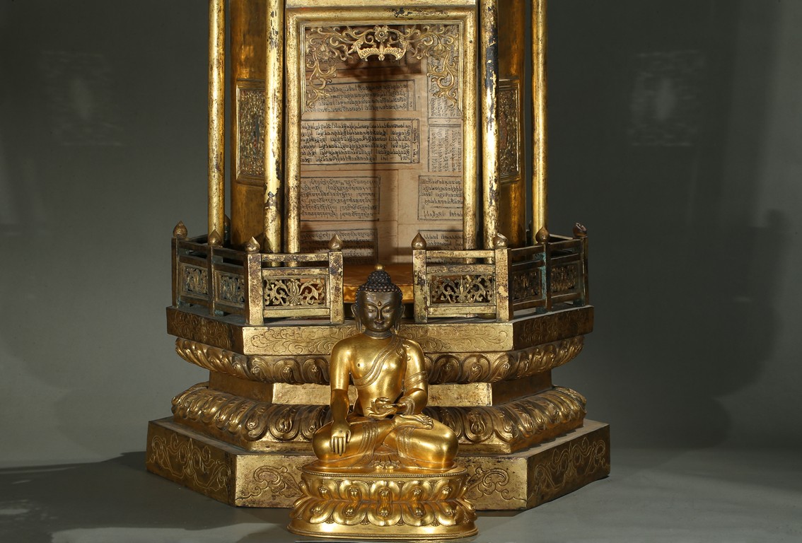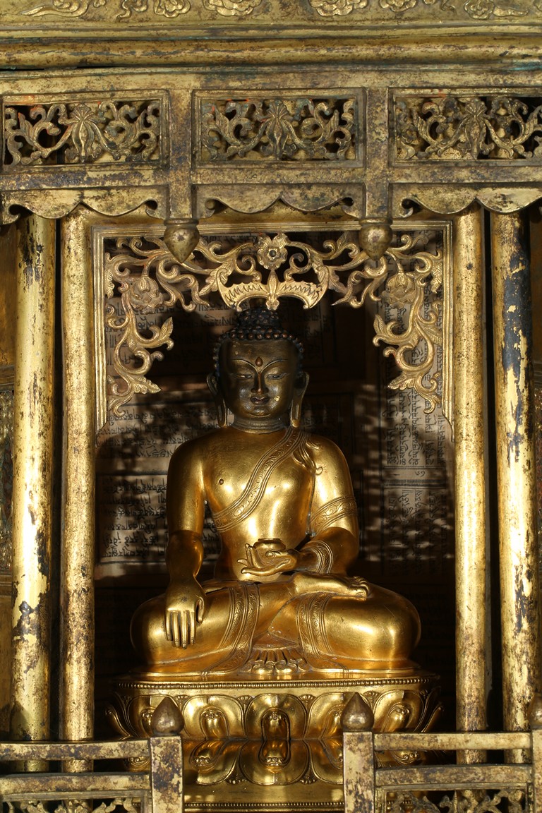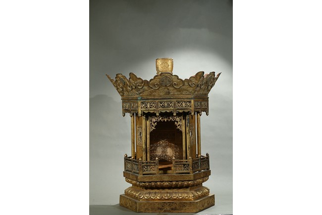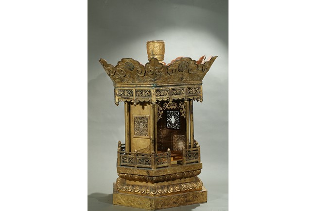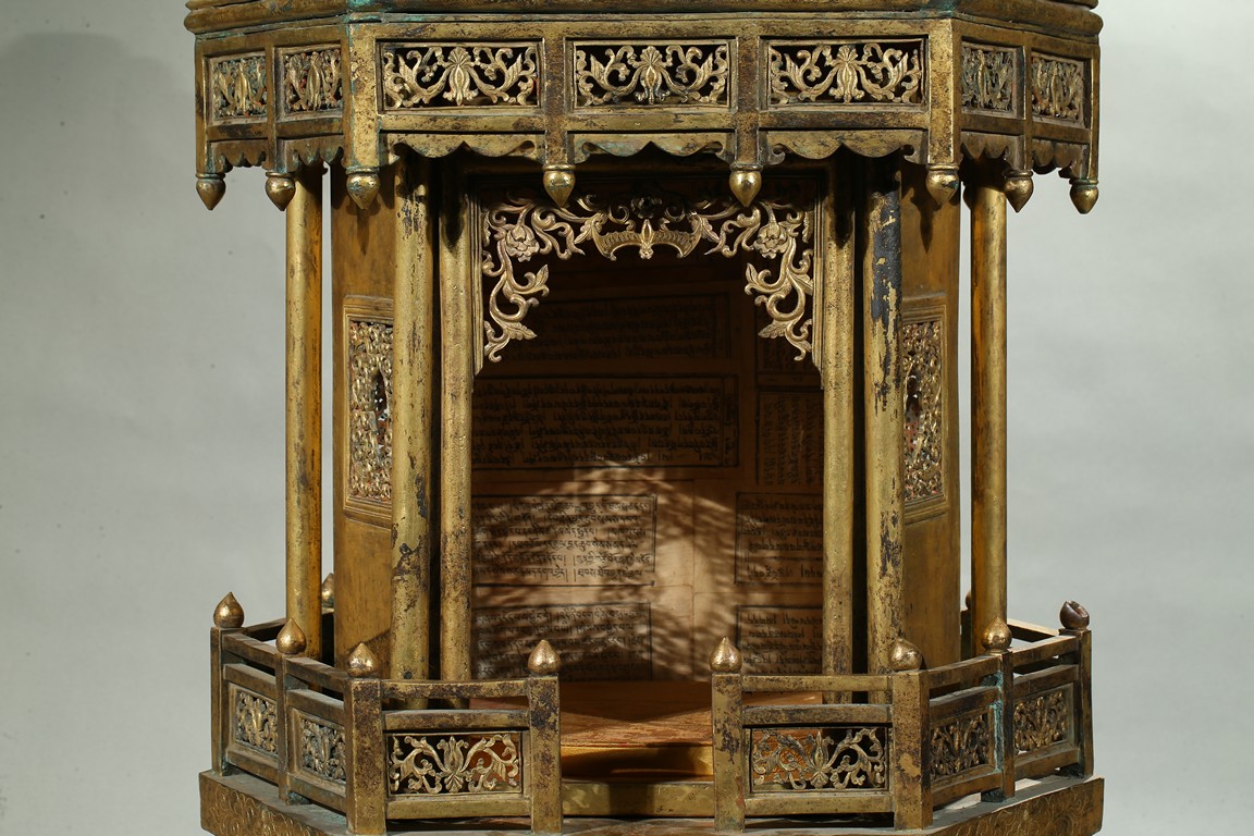 Of architectural pavilion form, the hexagonal pedestal base rising to the central open galleried section, each with cylindrical columns supportng the arched roof and with ornate pierced balustrades, the roof with shou symbols and auspicious clouds decorated in relief, the top surmounted with a rounded finial. The interior with an associated gilt-bronze figure of bodhisattva, the base sealed, seated in dhyanasana upon double lotus throne with right hand resting on leg, left hand holding a bowl in dhyana mudra, wearing loose-fitting robe falling in elegant folds, the serene face with downcast eyes and gentle smile flanked by pendulous earlobes, the head with tall ushnisha with tight curls. Qing Dynasty Qianlong period.