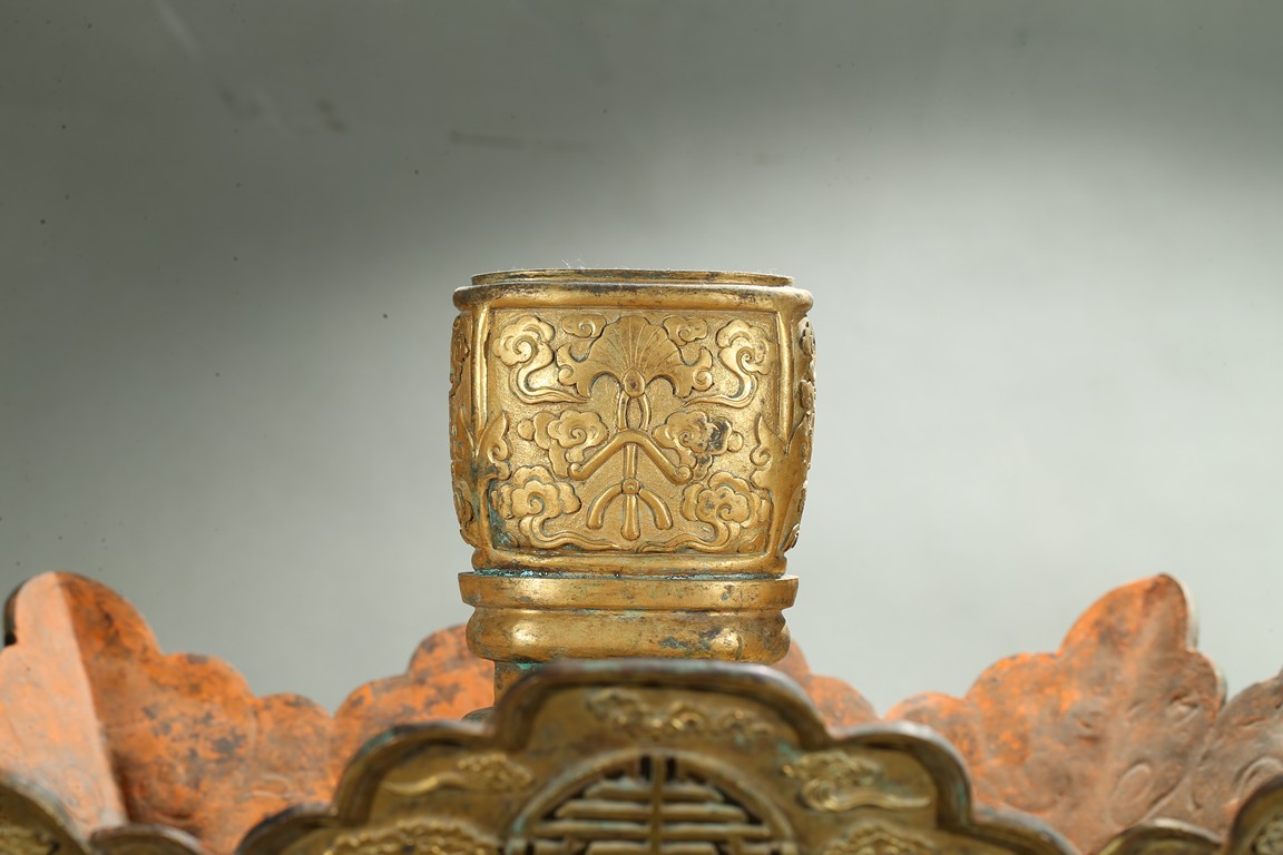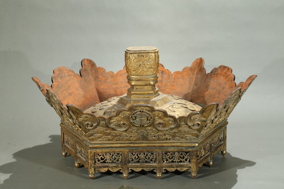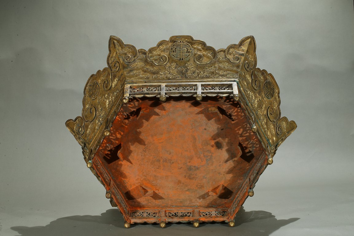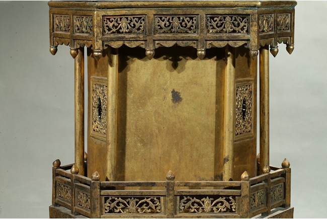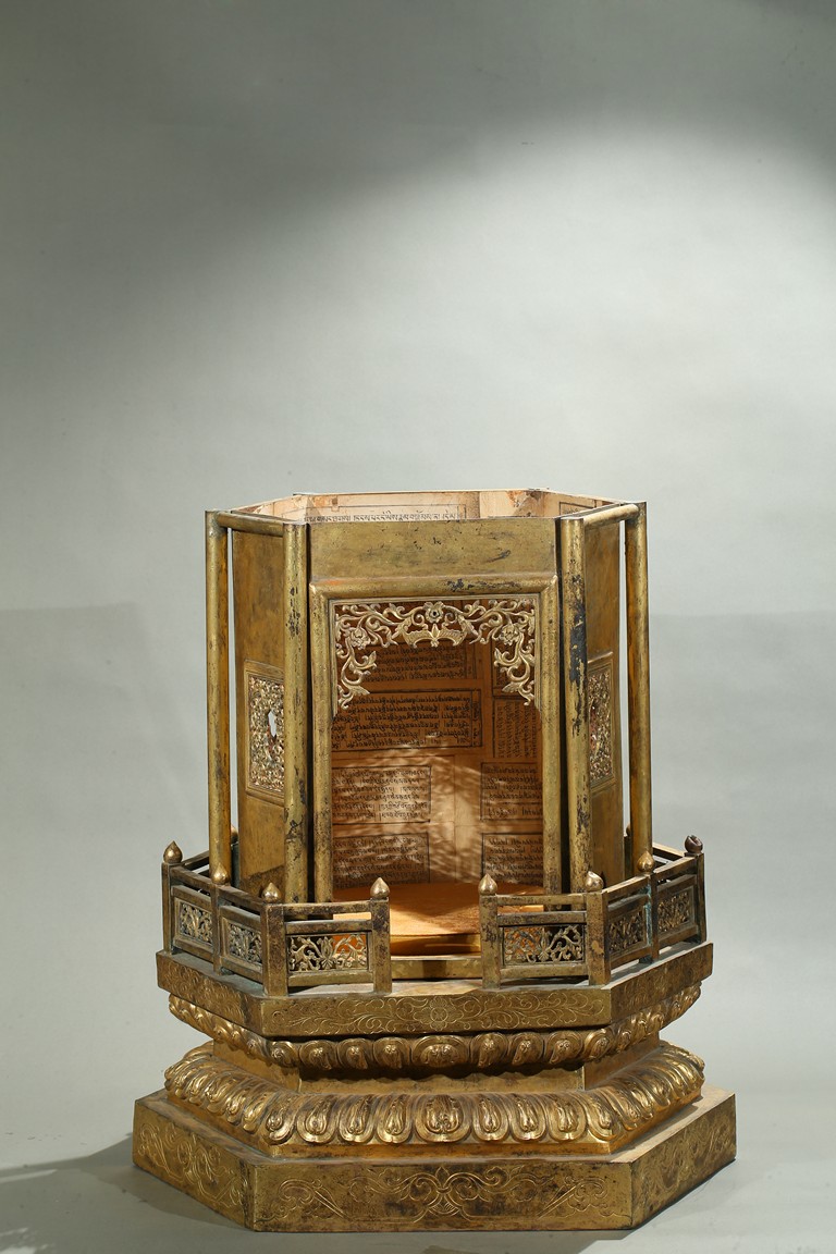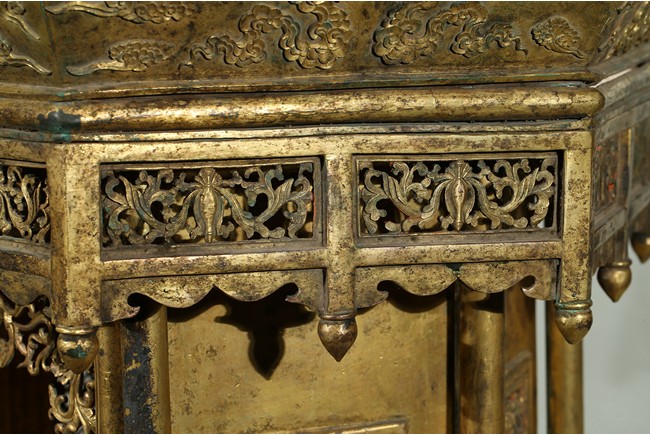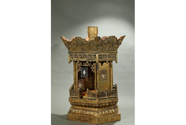 此佛龕為六方亭造型,須彌座。六角立柱,四周環以封板。頂為六角穹窿式蓋,浮雕勾卷雲紋。上部安方形寶頂,浮雕蝠磬紋。廊柱內為六方式板壁,正中為開敞的門戶,銅鎏金打說法印端坐其中。須彌座束腰浮雕卷草,面上隨形裝圍欄,飾透雕寶相花縧環板。內供奉銅鎏金釋迦摩尼佛,鎏金厚實,造型莊嚴。佛龕在宮廷佛堂中佔有顯要位置,也是官式和宗教建築造型的縮影,因此每個細節均設計嚴謹,如屋頂的式樣、裝飾紋樣等,都有嚴格規定,其以“三塔龕”和“五塔龕”最具清宮特色,結合了漢藏兩地的典型建築。 此宮廷製佛龕造型別緻,盡顯皇家氣派,保存完好,十分難得。 類似佛龕可參考紐約蘇富比2011年3月拍品號695。 Provenance: Property from a private collector, Los Angeles, acquired in Hong Kong before 1980s. 來源:洛杉磯資深藏家提供,1980以前購於香港