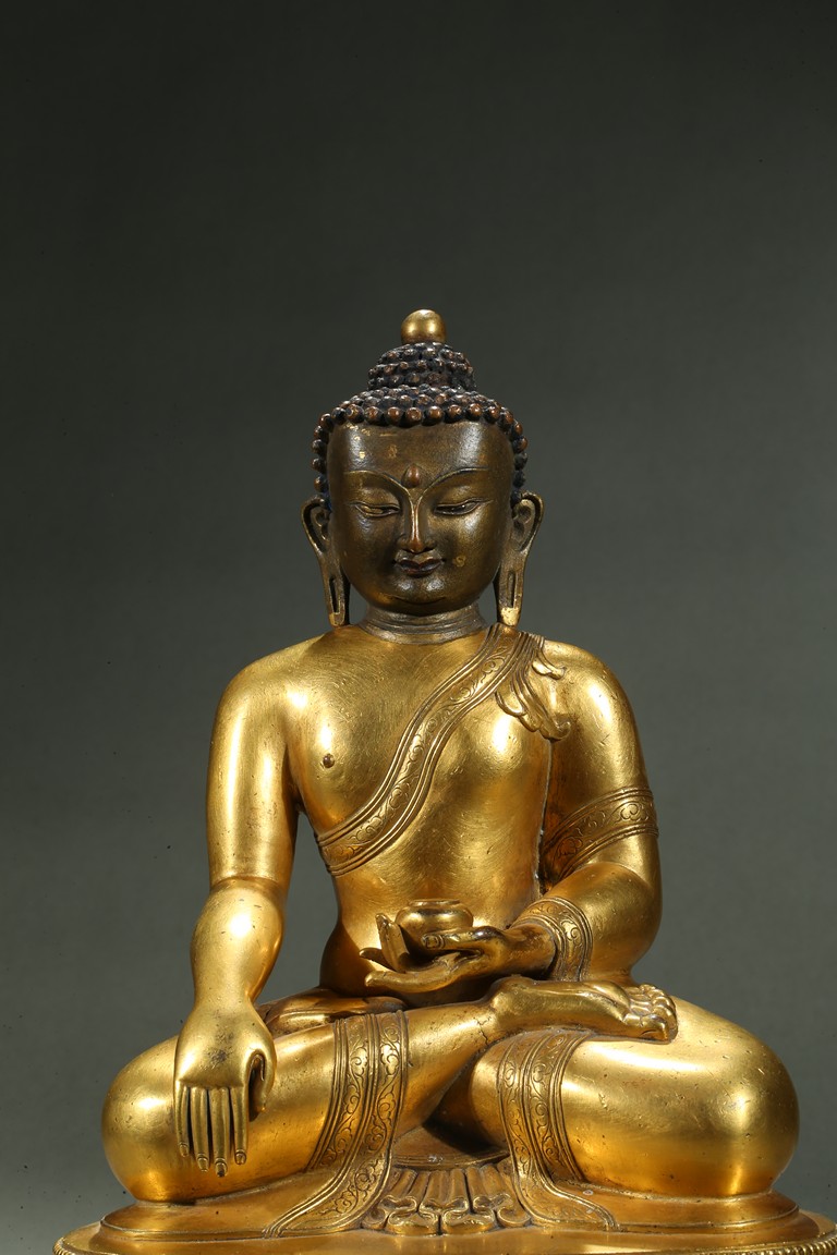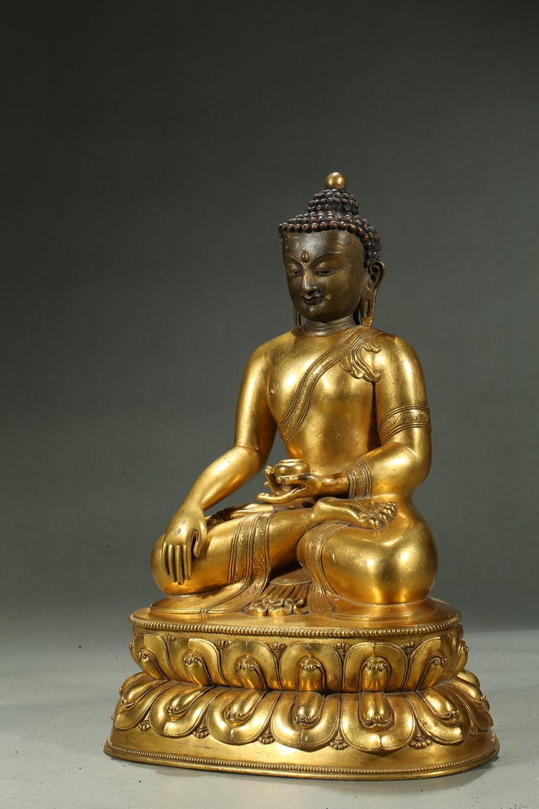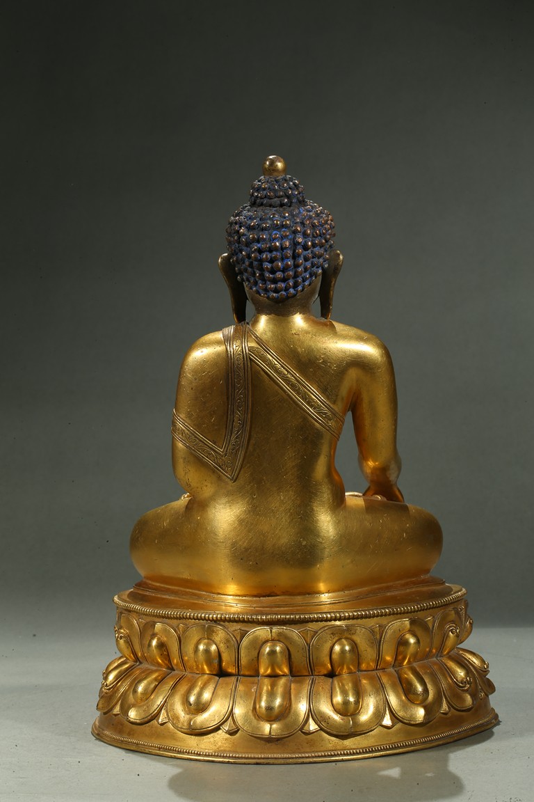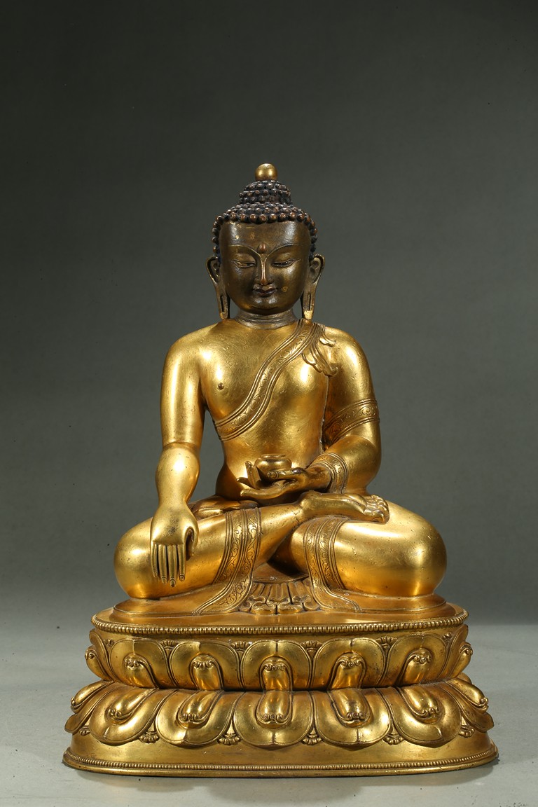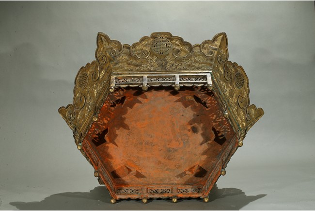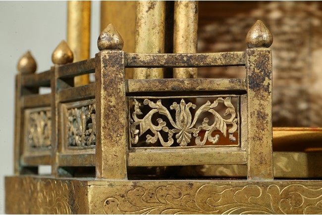 此佛龕為六方亭造型,須彌座。六角立柱,四周環以封板。頂為六角穹窿式蓋,浮雕勾卷雲紋。上部安方形寶頂,浮雕蝠磬紋。廊柱內為六方式板壁,正中為開敞的門戶,銅鎏金打說法印端坐其中。須彌座束腰浮雕卷草,面上隨形裝圍欄,飾透雕寶相花縧環板。內供奉銅鎏金釋迦摩尼佛,鎏金厚實,造型莊嚴。佛龕在宮廷佛堂中佔有顯要位置,也是官式和宗教建築造型的縮影,因此每個細節均設計嚴謹,如屋頂的式樣、裝飾紋樣等,都有嚴格規定,其以“三塔龕”和“五塔龕”最具清宮特色,結合了漢藏兩地的典型建築。 此宮廷製佛龕造型別緻,盡顯皇家氣派,保存完好,十分難得。 類似佛龕可參考紐約蘇富比2011年3月拍品號695。 Provenance: Property from a private collector, Los Angeles, acquired in Hong Kong before 1980s. 來源:洛杉磯資深藏家提供,1980以前購於香港