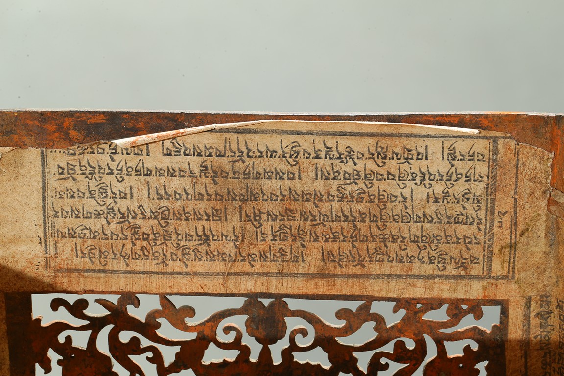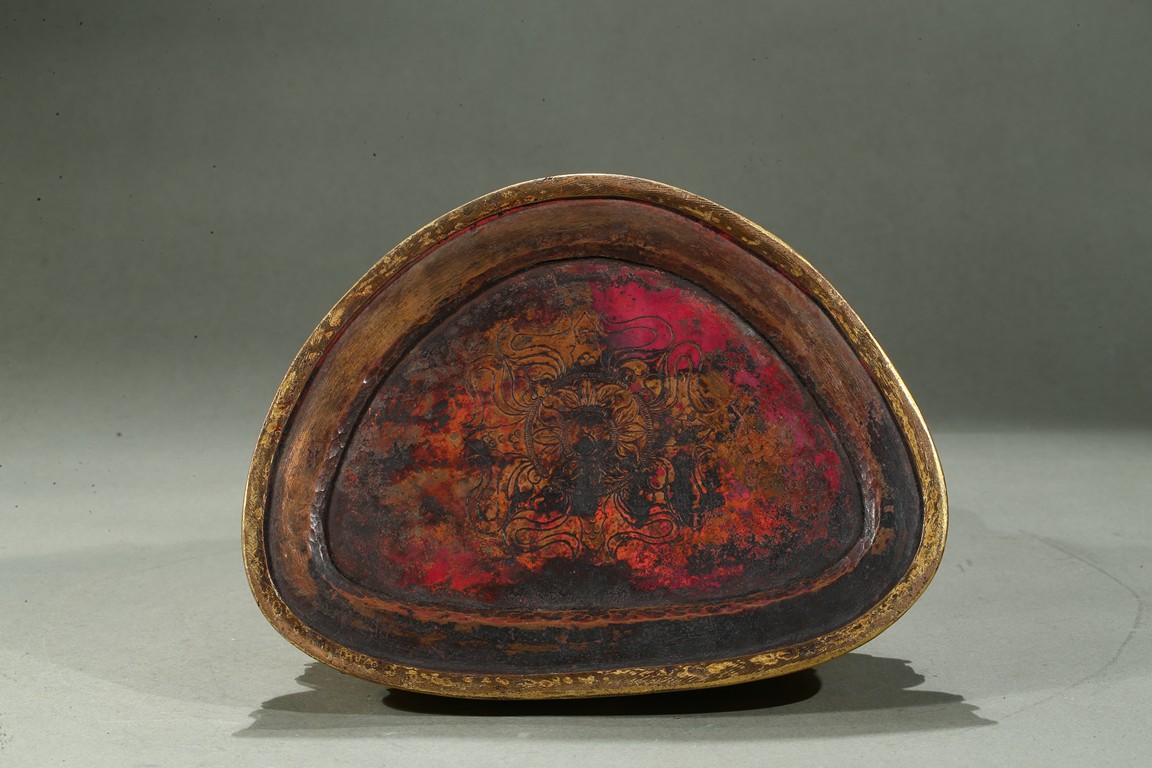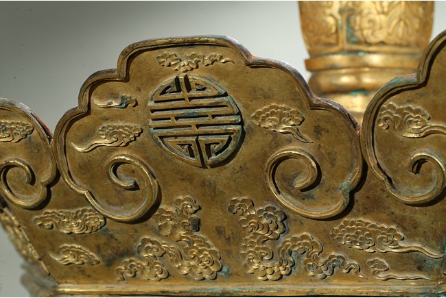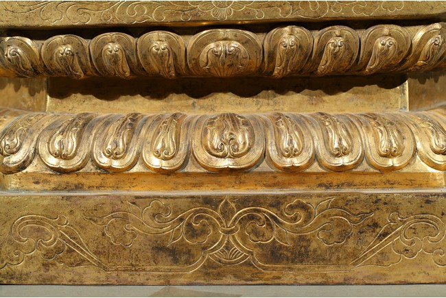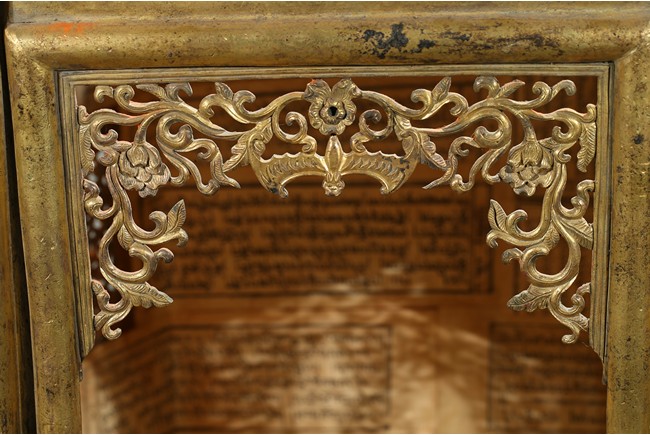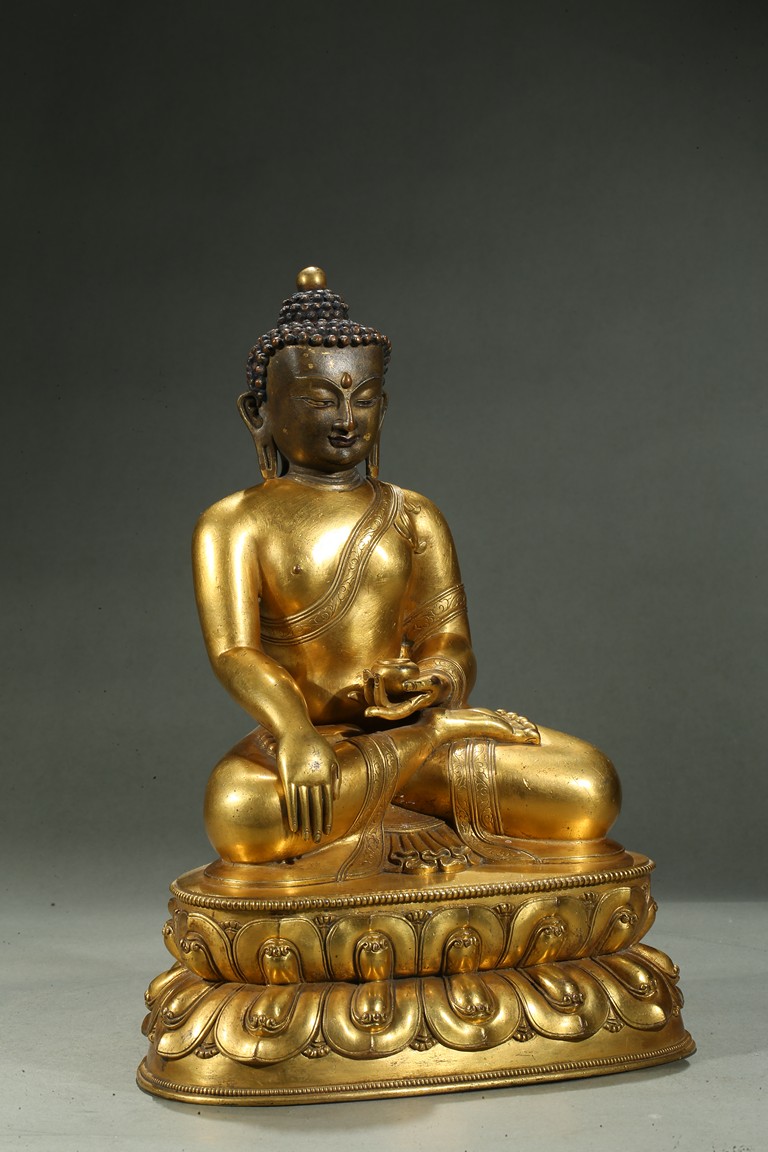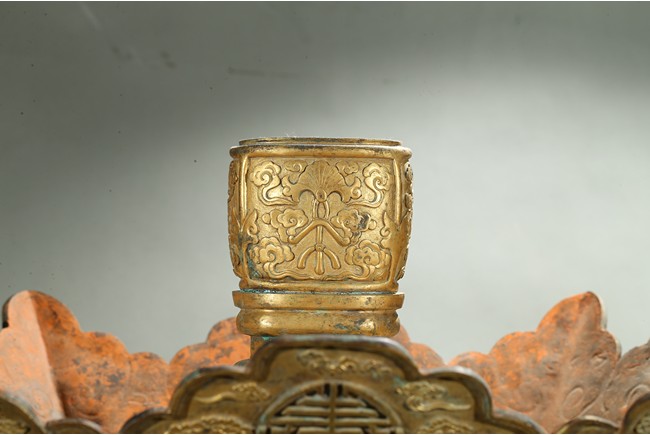 此佛龕為六方亭造型,須彌座。六角立柱,四周環以封板。頂為六角穹窿式蓋,浮雕勾卷雲紋。上部安方形寶頂,浮雕蝠磬紋。廊柱內為六方式板壁,正中為開敞的門戶,銅鎏金打說法印端坐其中。須彌座束腰浮雕卷草,面上隨形裝圍欄,飾透雕寶相花縧環板。內供奉銅鎏金釋迦摩尼佛,鎏金厚實,造型莊嚴。佛龕在宮廷佛堂中佔有顯要位置,也是官式和宗教建築造型的縮影,因此每個細節均設計嚴謹,如屋頂的式樣、裝飾紋樣等,都有嚴格規定,其以“三塔龕”和“五塔龕”最具清宮特色,結合了漢藏兩地的典型建築。 此宮廷製佛龕造型別緻,盡顯皇家氣派,保存完好,十分難得。 類似佛龕可參考紐約蘇富比2011年3月拍品號695。 Provenance: Property from a private collector, Los Angeles, acquired in Hong Kong before 1980s. 來源:洛杉磯資深藏家提供,1980以前購於香港