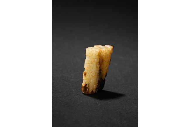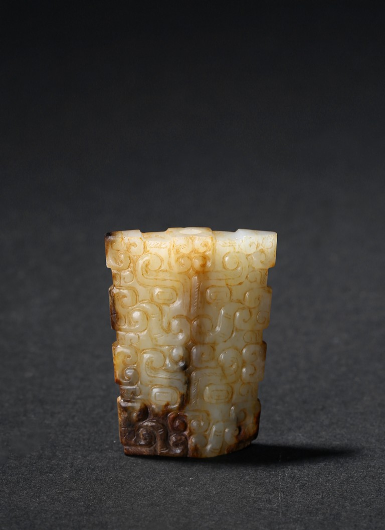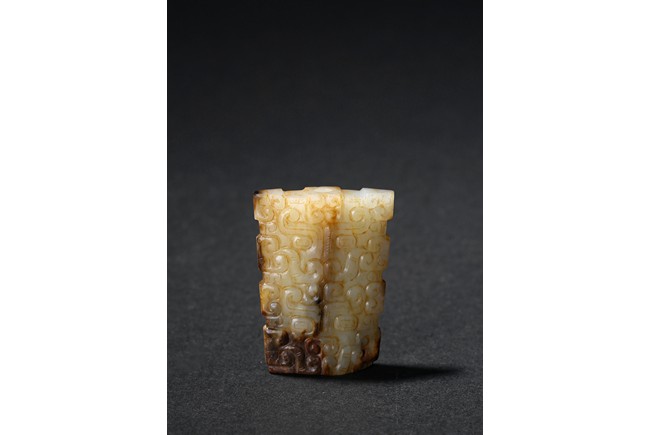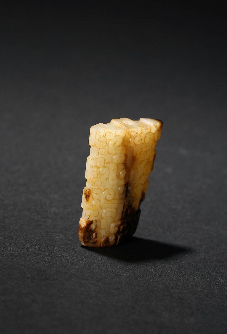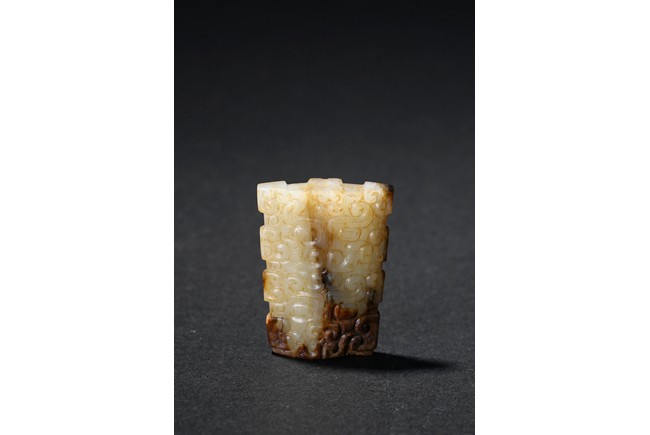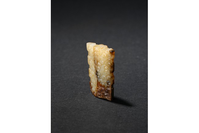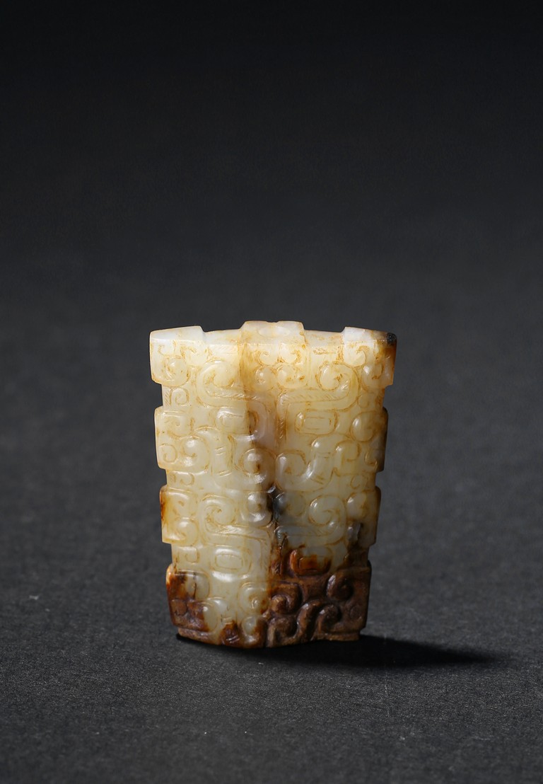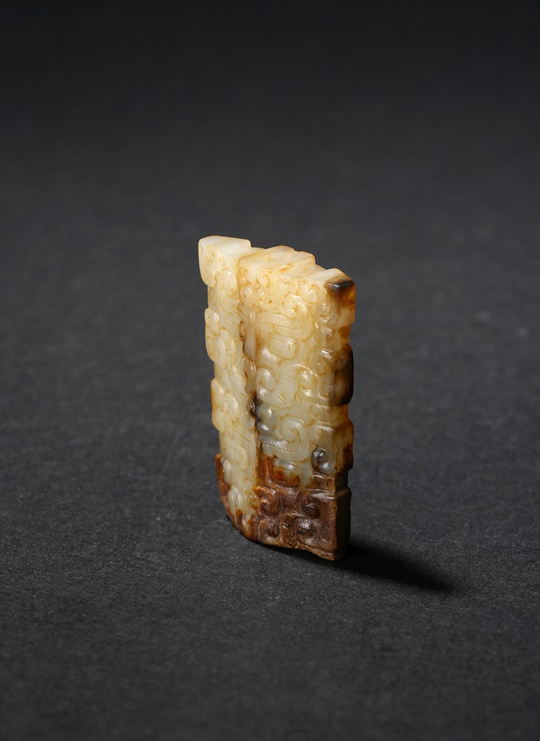 of trapezoidal form, worked in relief with archaistic motifs forming a taotie mask, the stone of a celadon white color with dark brown inclusions. Eastern Zhou dynasty period.