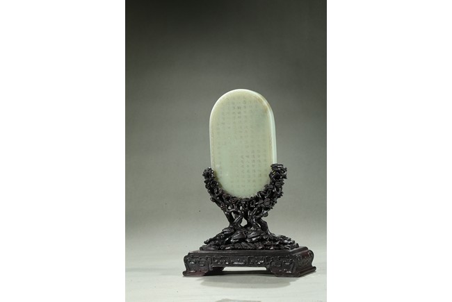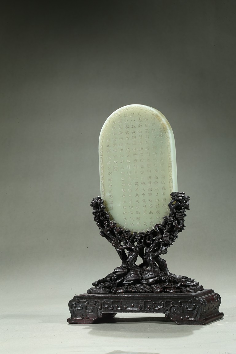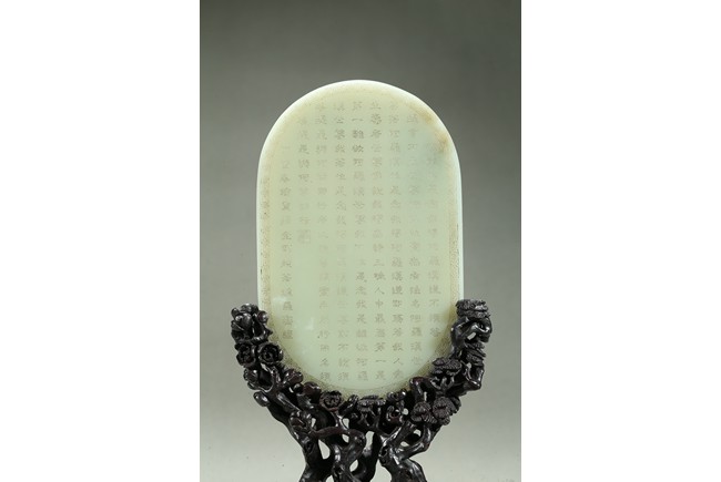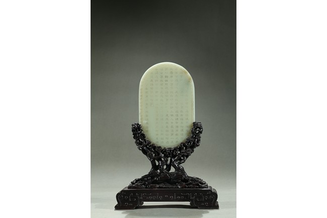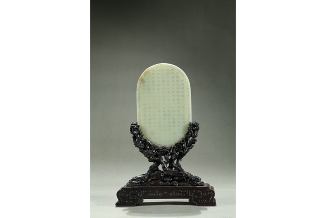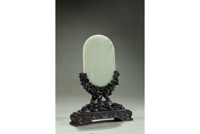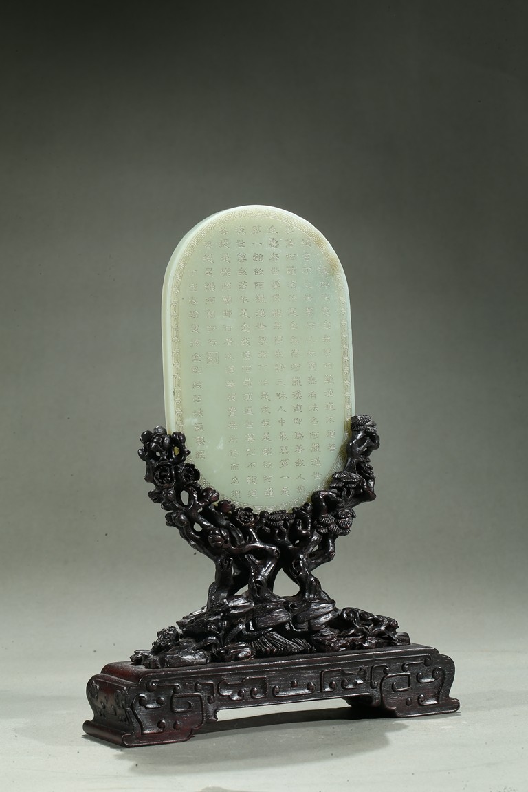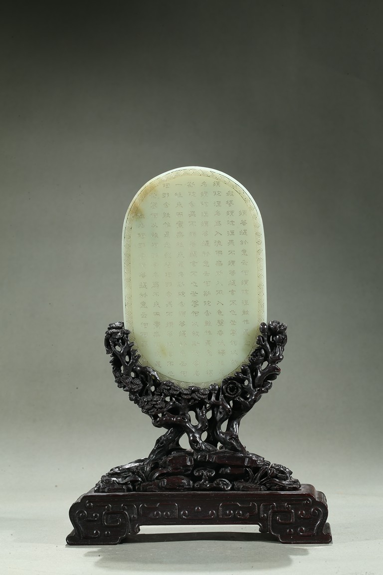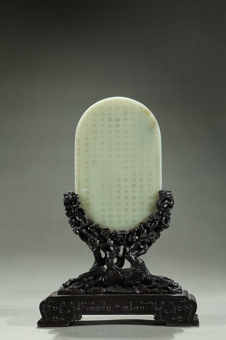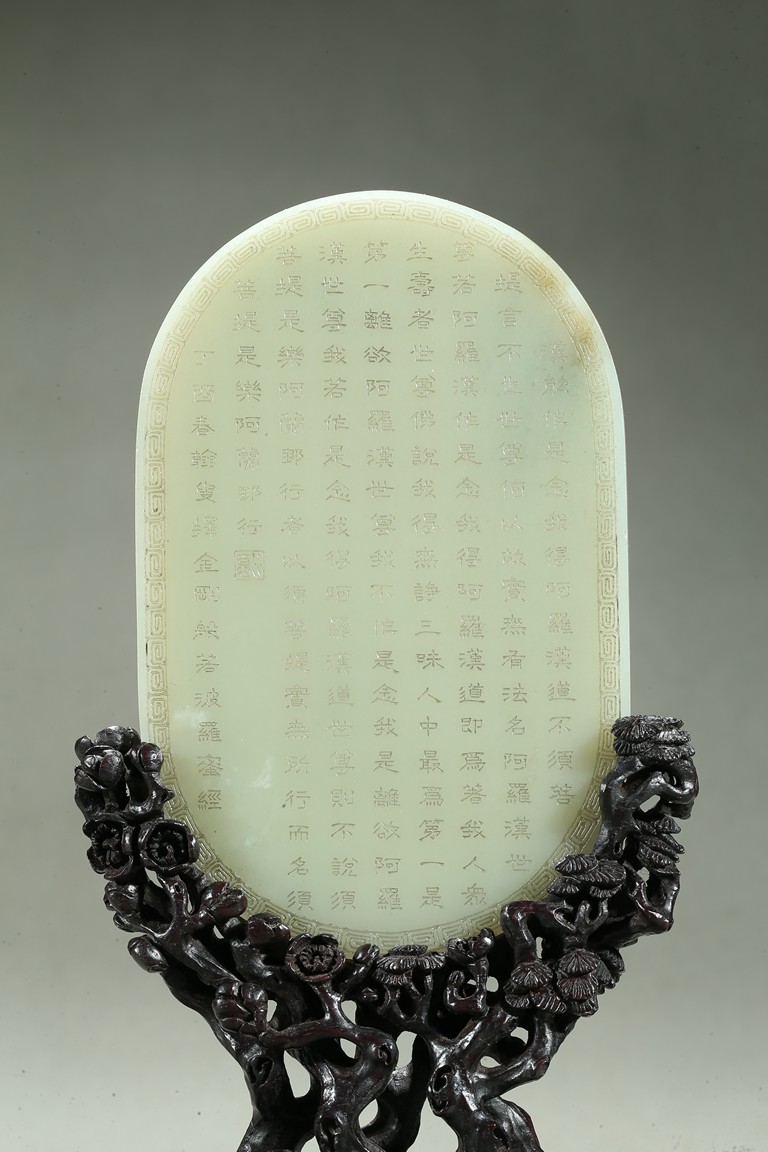 The table screen finely inscribed with diamond sutra to the front and reverse, all enclosed within a key-fret border, further supported on an elaborately carved zitan stand.