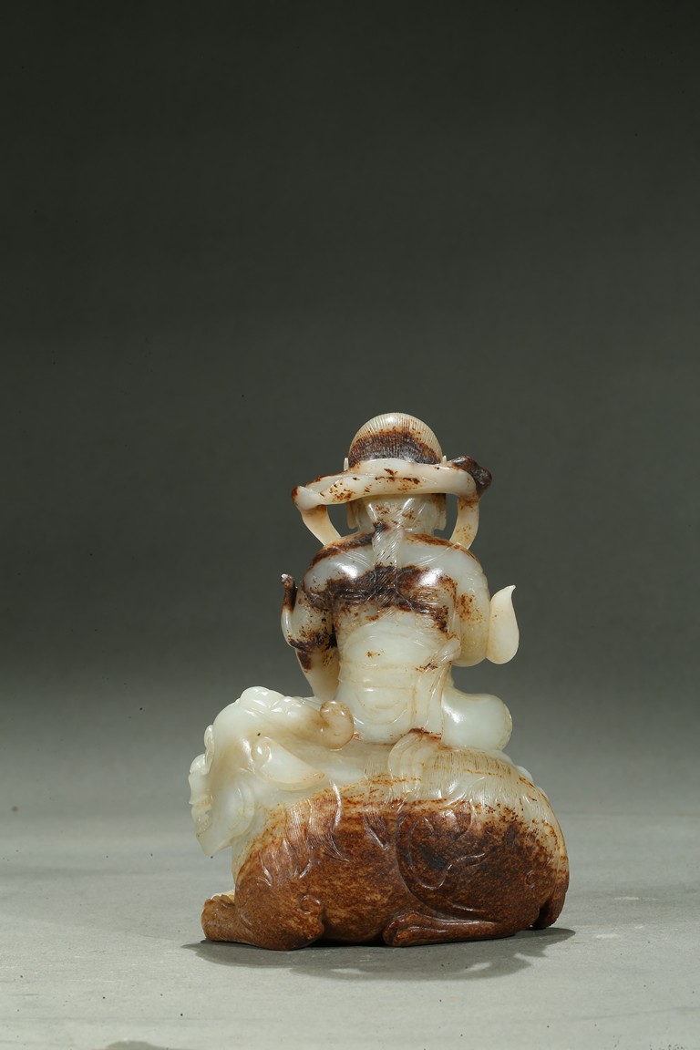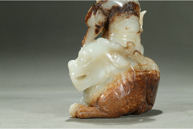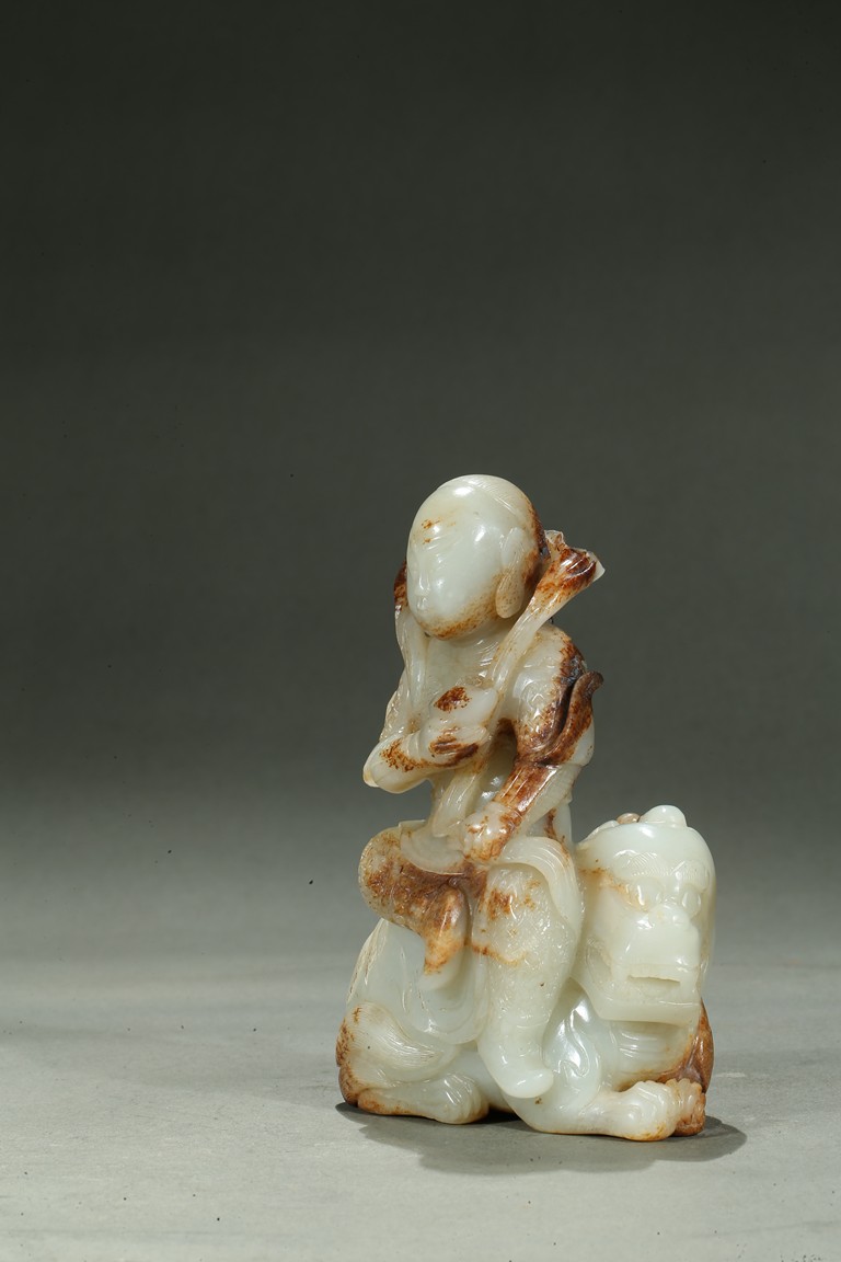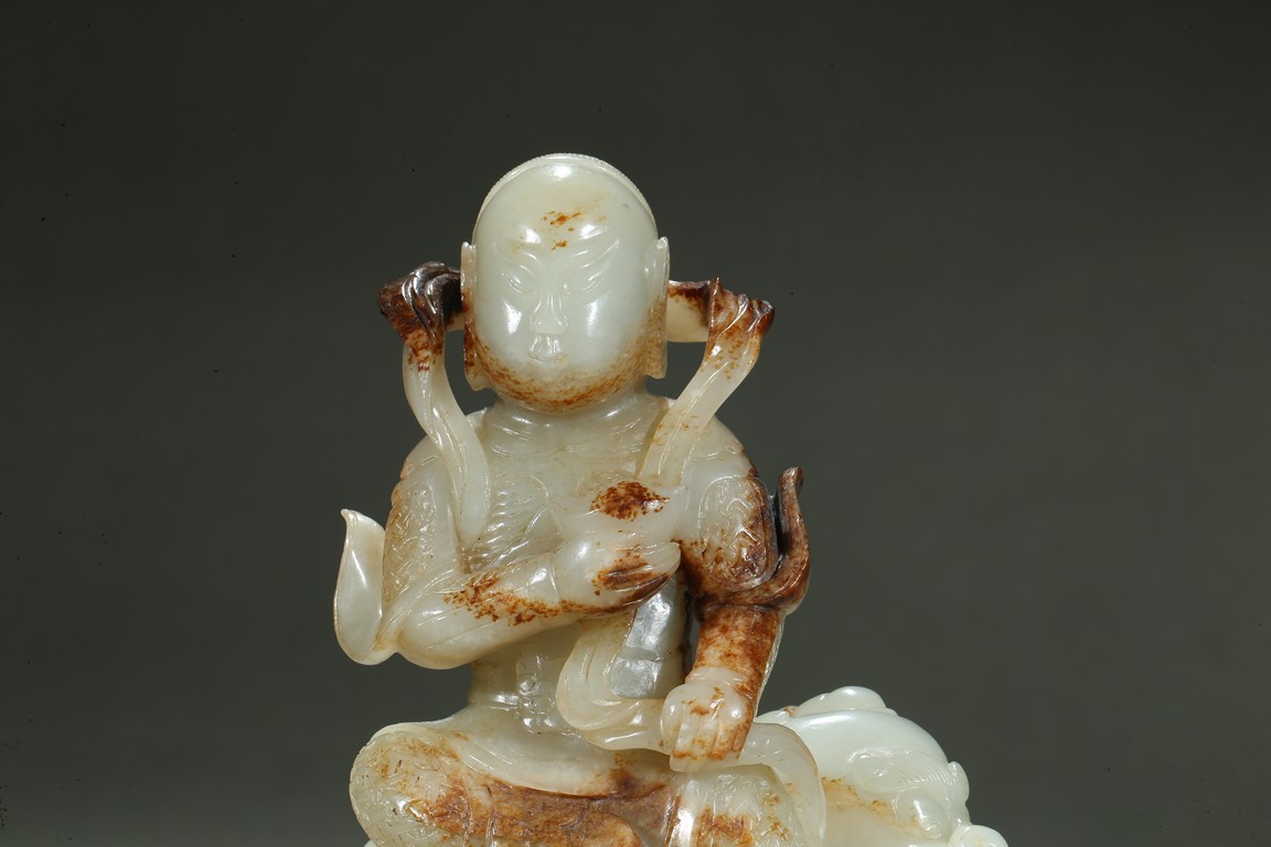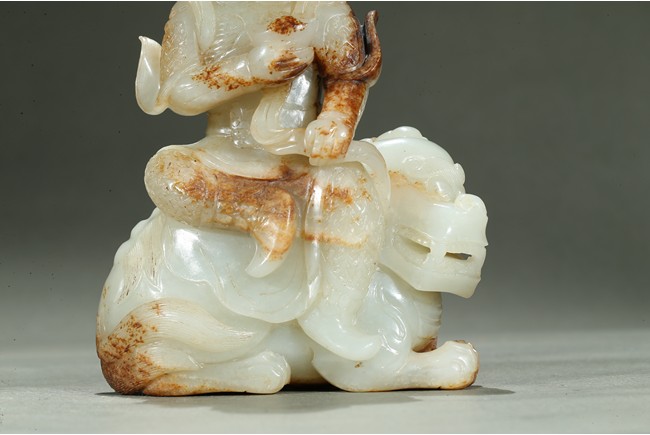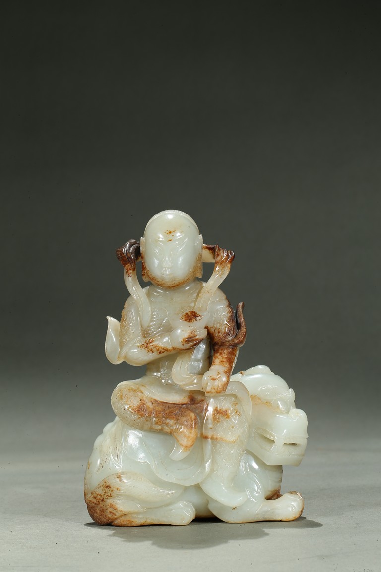 Carved in the form of an arhat sitting upon a recumbent lion, the arhat shown wearing full armor with celestial ribbon flying across his shoulder, face with stern expression; the lion shown with bulging rounded eyes and wide mouth.