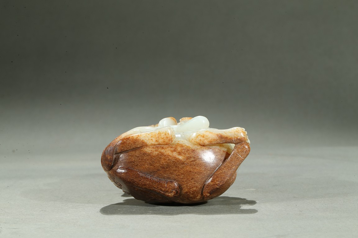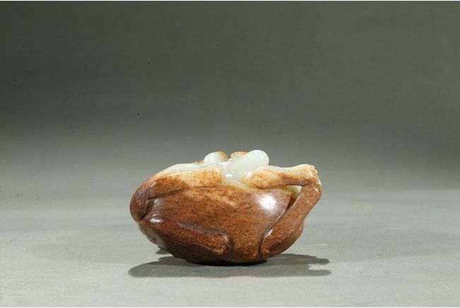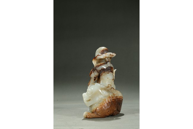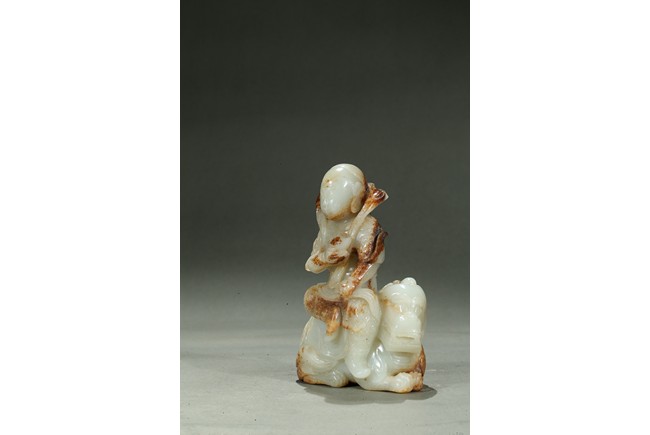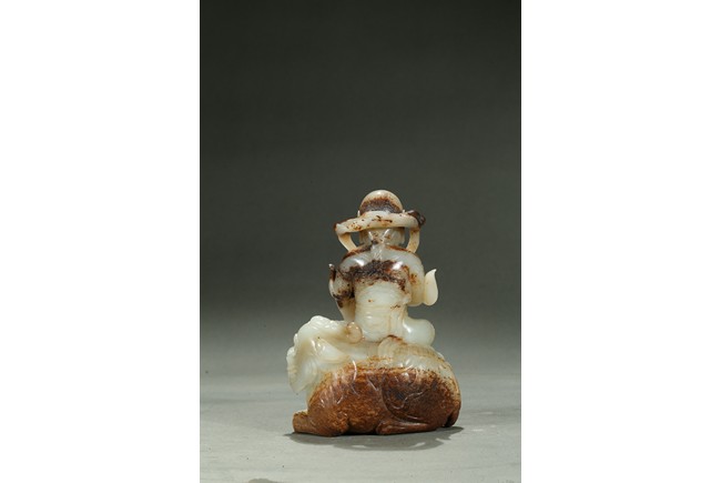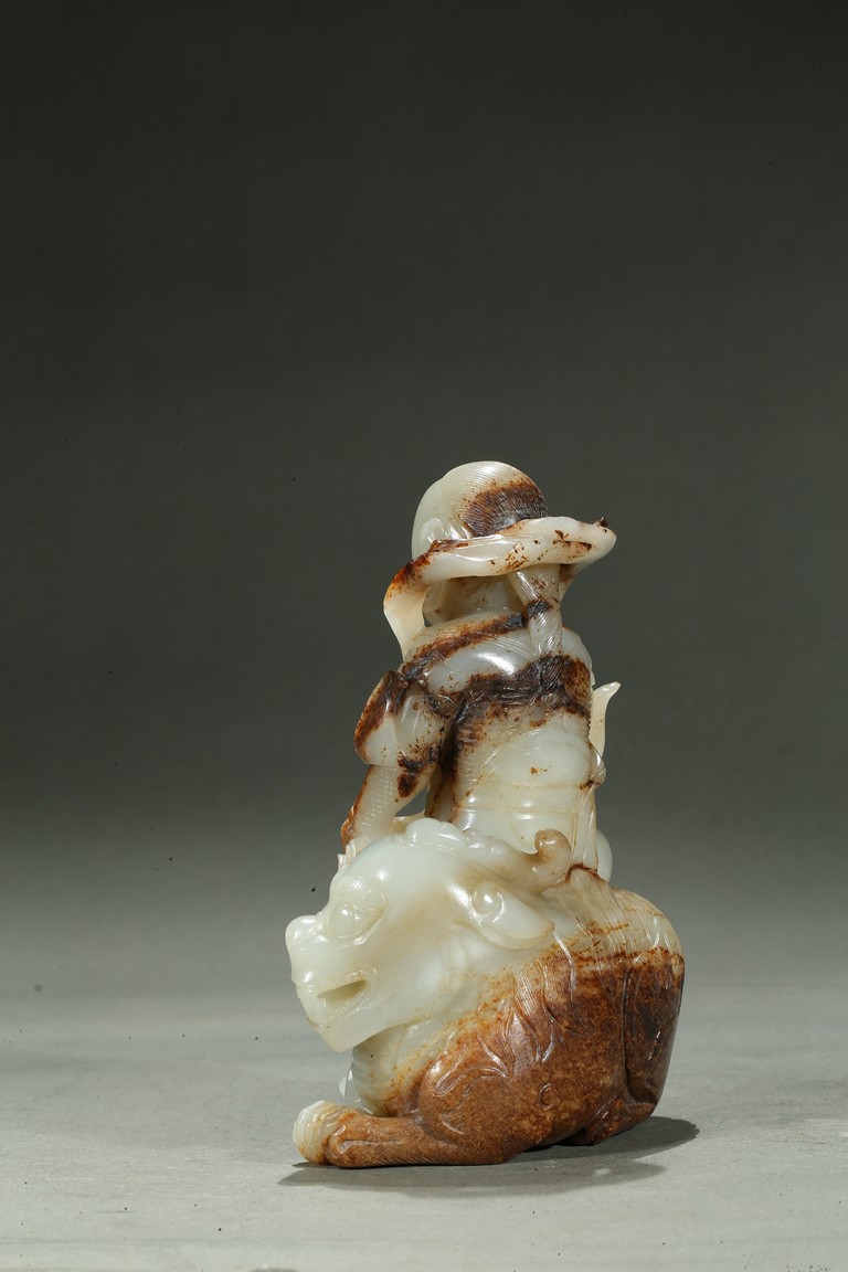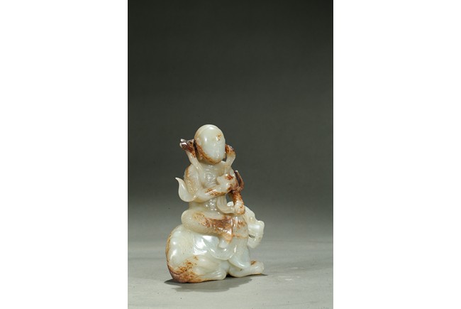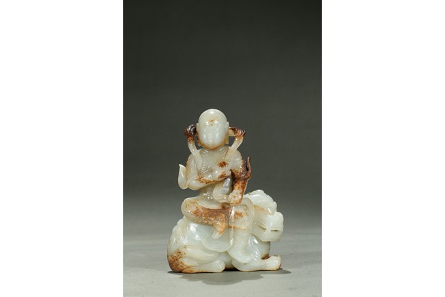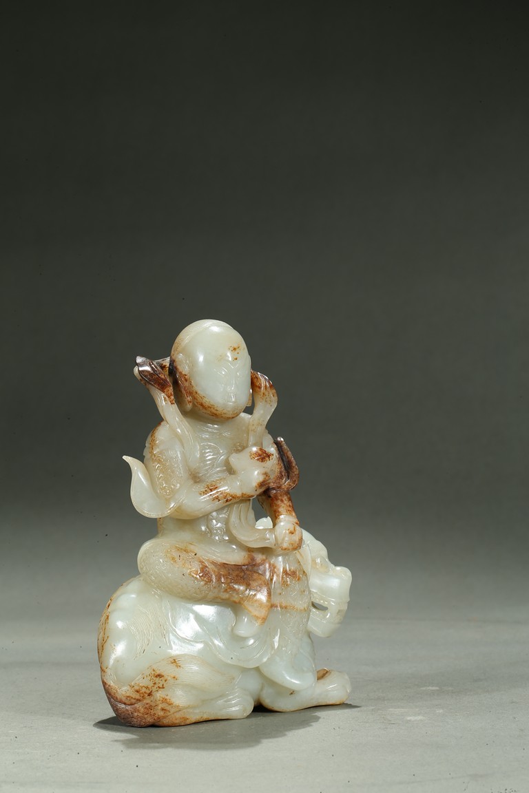 Carved in the form of an arhat sitting upon a recumbent lion, the arhat shown wearing full armor with celestial ribbon flying across his shoulder, face with stern expression; the lion shown with bulging rounded eyes and wide mouth.