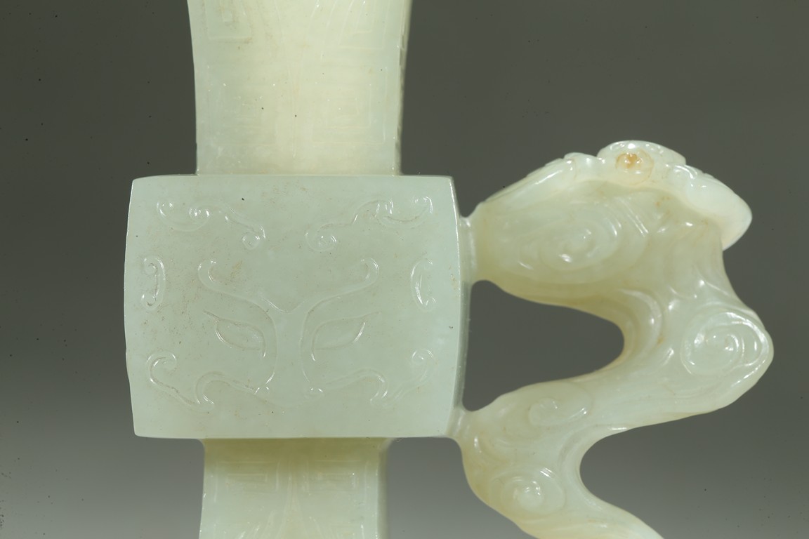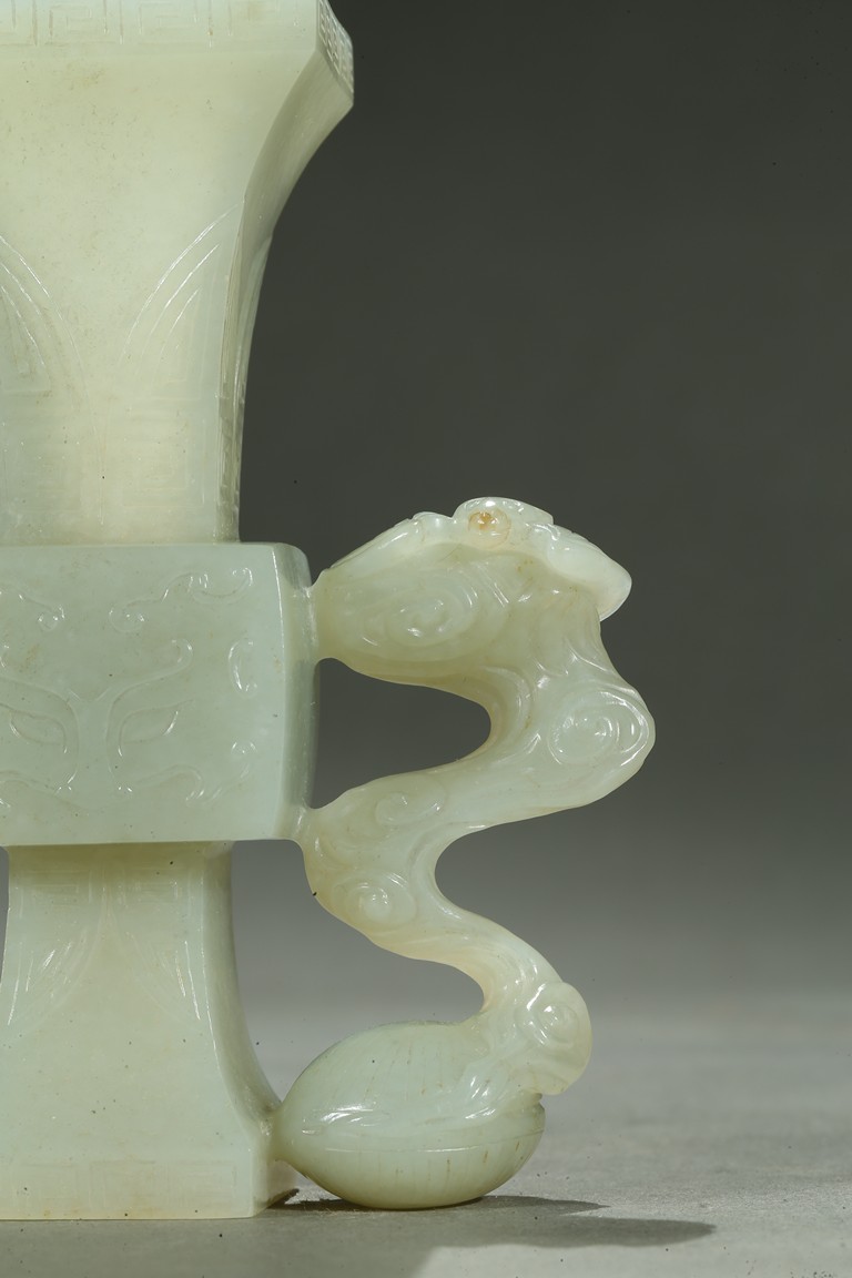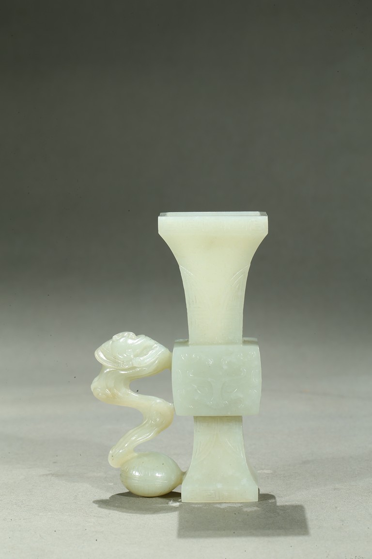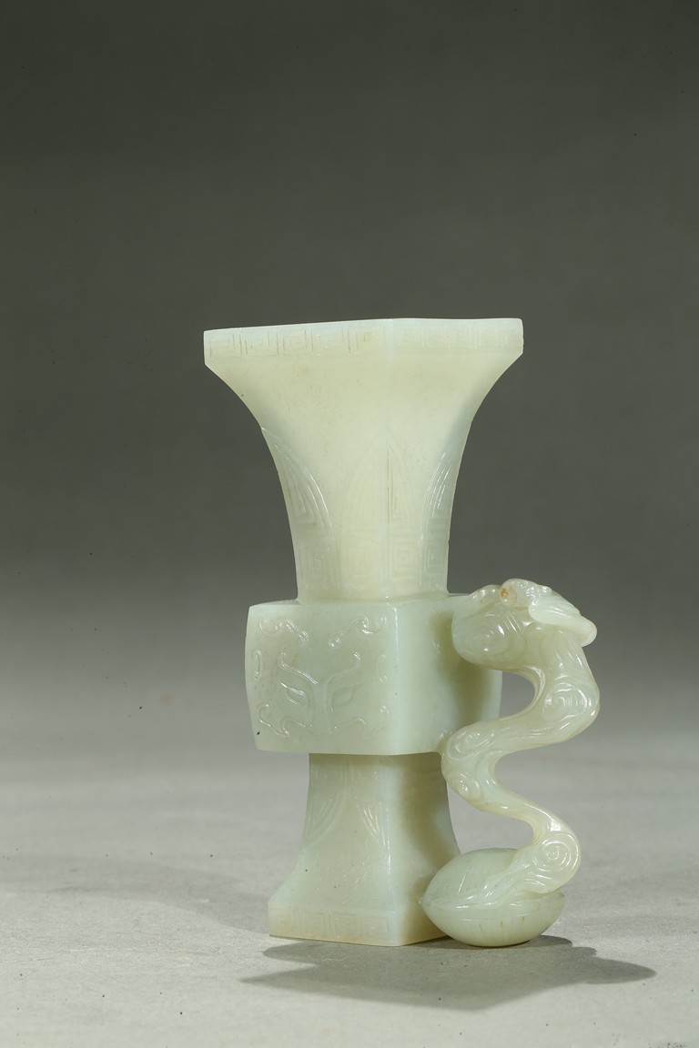 Carved in the form of archaic gu vessel, the body decorated with taotie masks, with the side set with auspicious clouds rising a turtle shell. Qing Dynasty period.