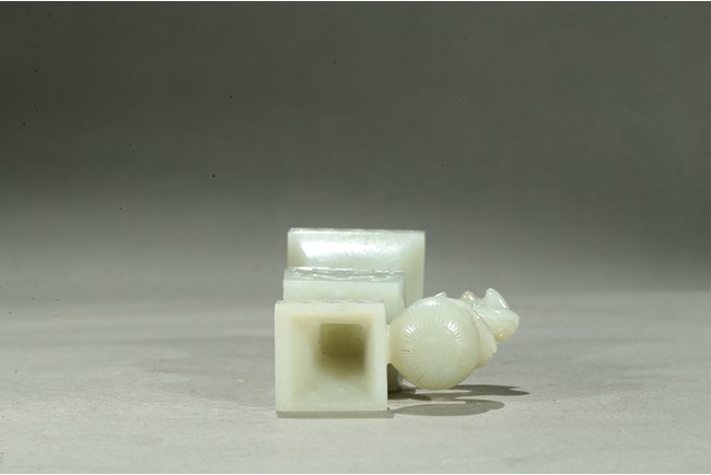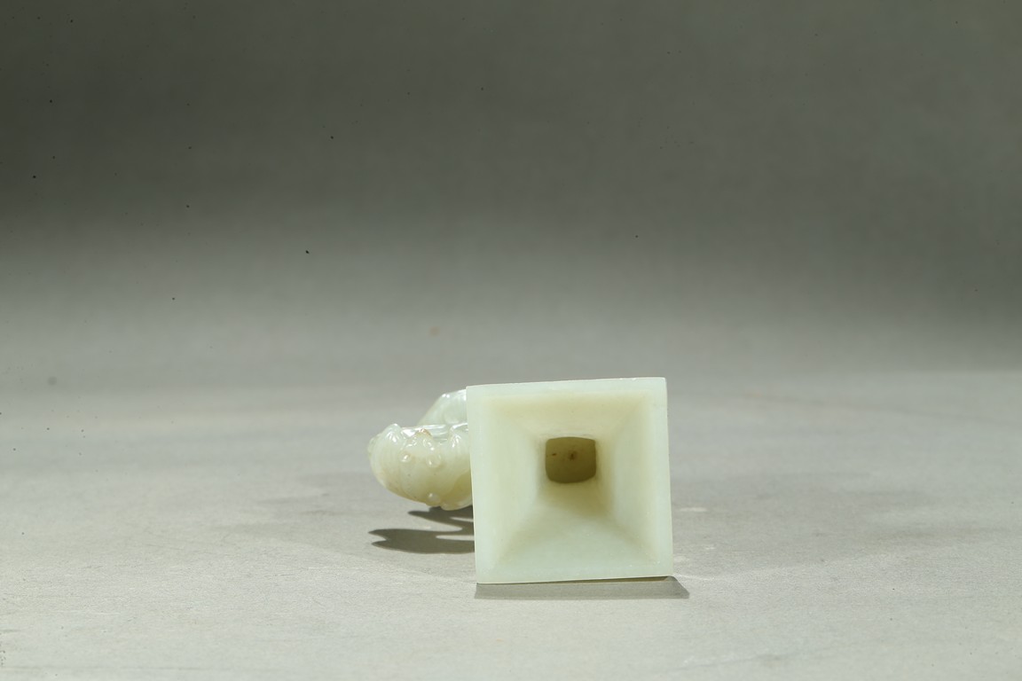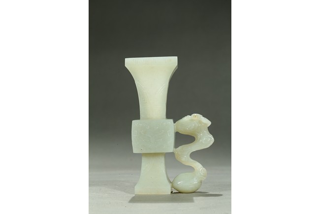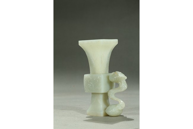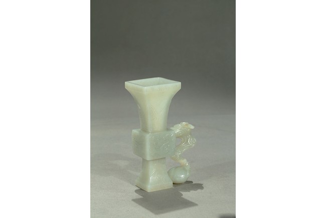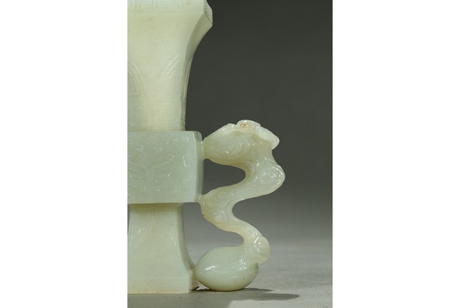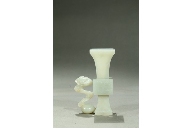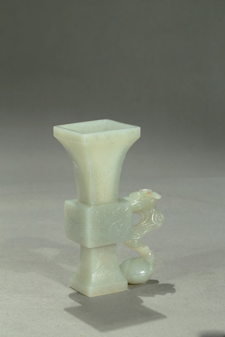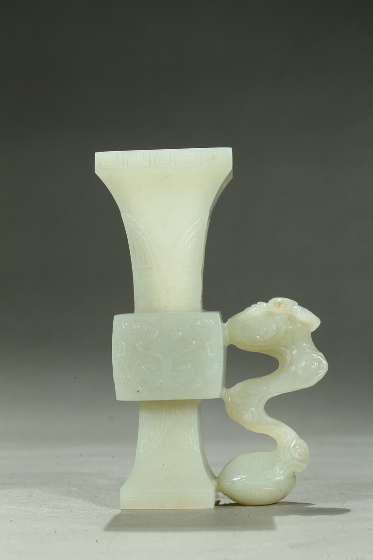 Carved in the form of archaic gu vessel, the body decorated with taotie masks, with the side set with auspicious clouds rising a turtle shell. Qing Dynasty period.