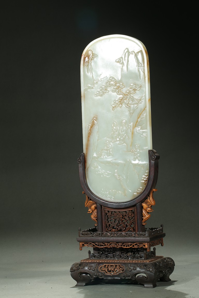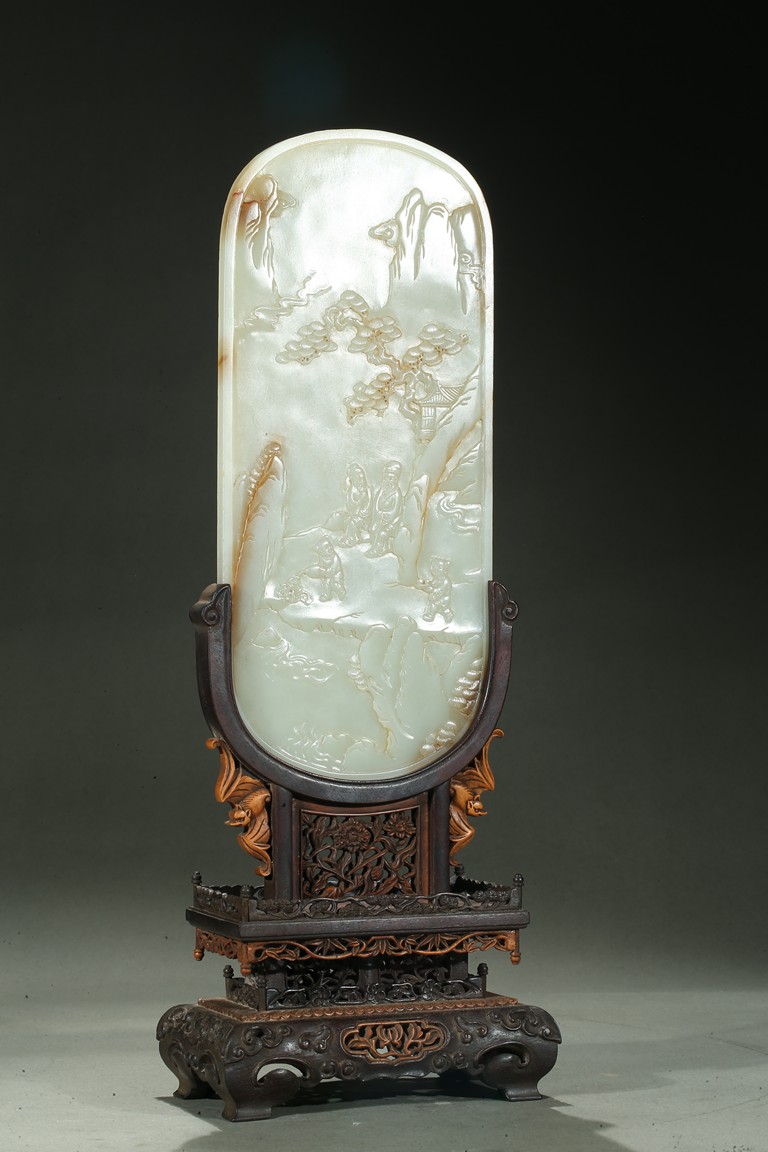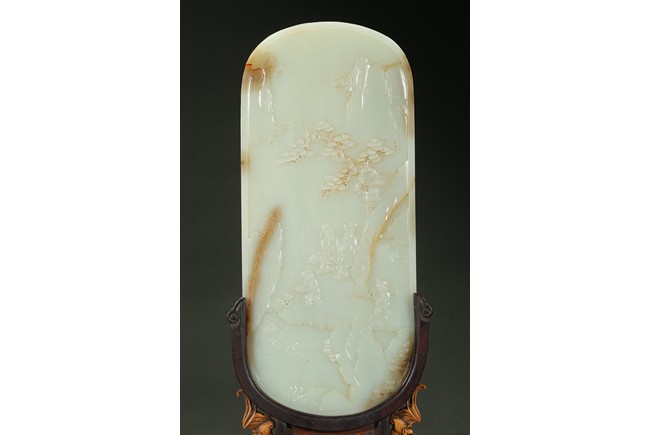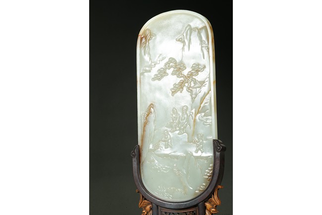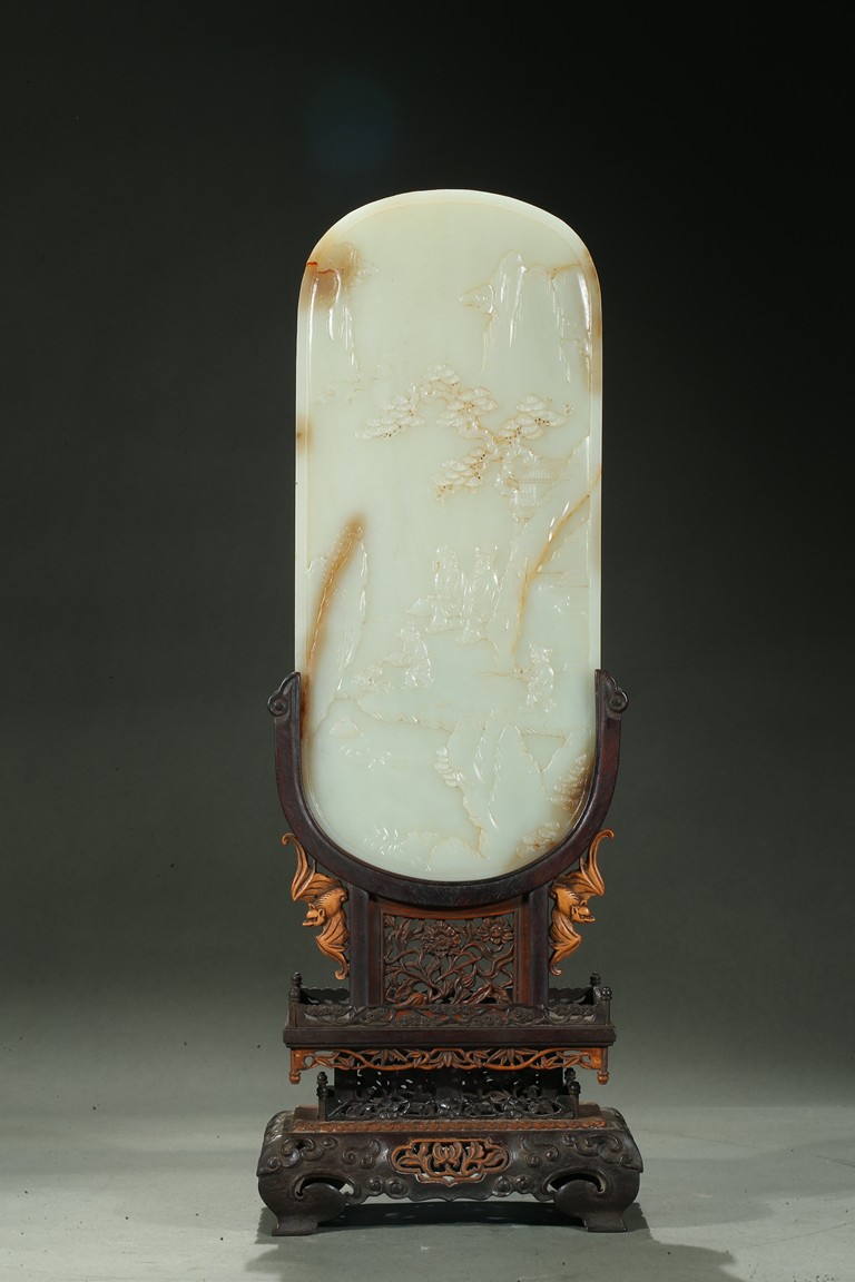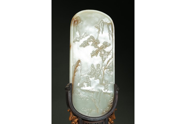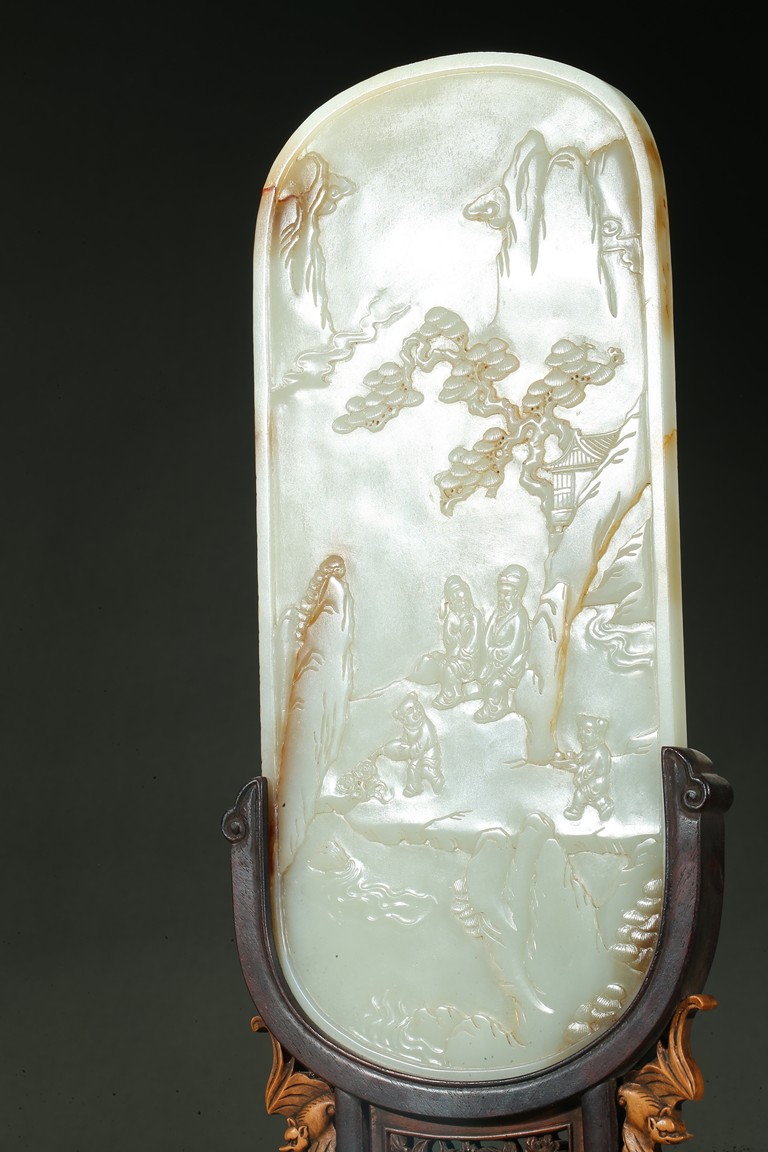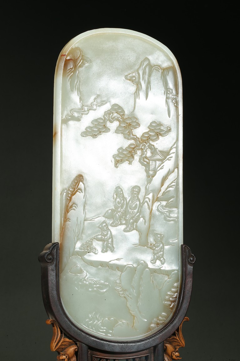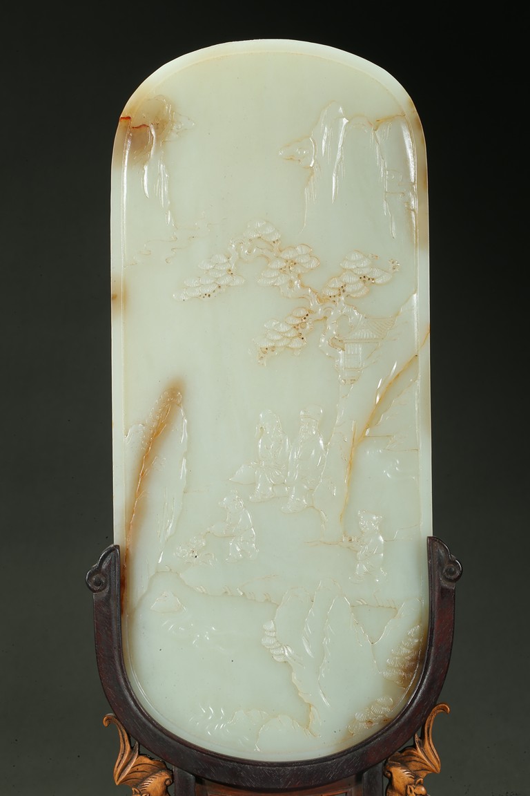 Of upright rounded rectangular form, one side carved in relief with two elderly literati conversing in a riverbank setting, with two boys next to them playing, all below a large pine tree and jagged rocky outcrops; the reverse finely carved with inscriptions.