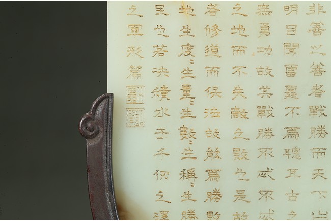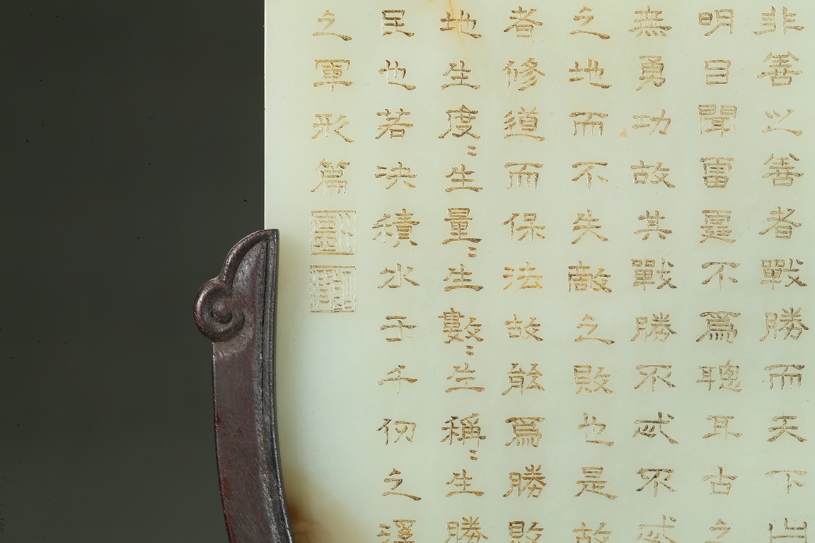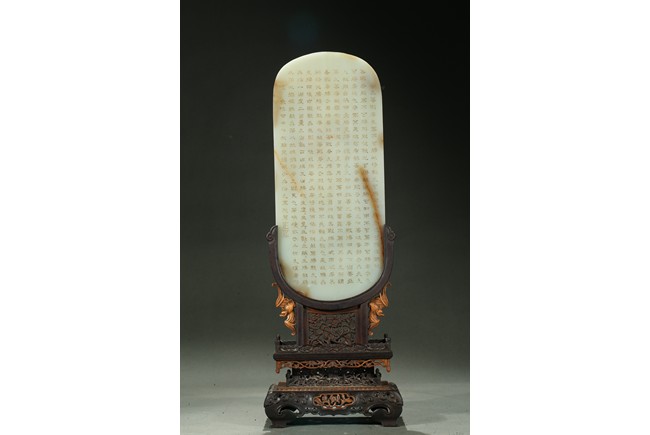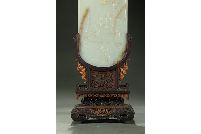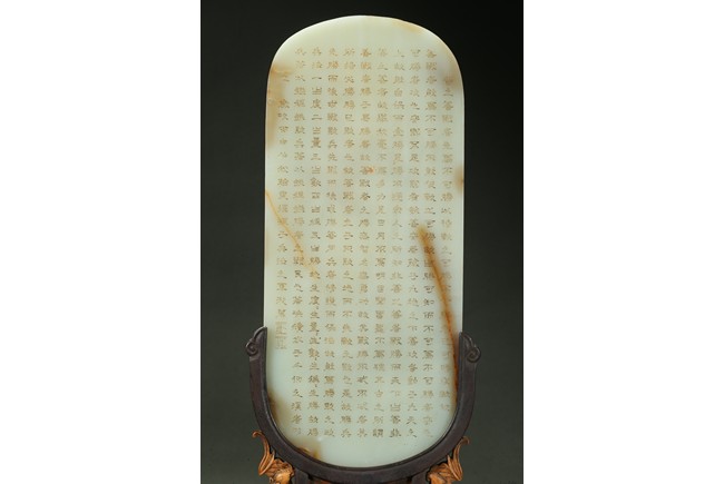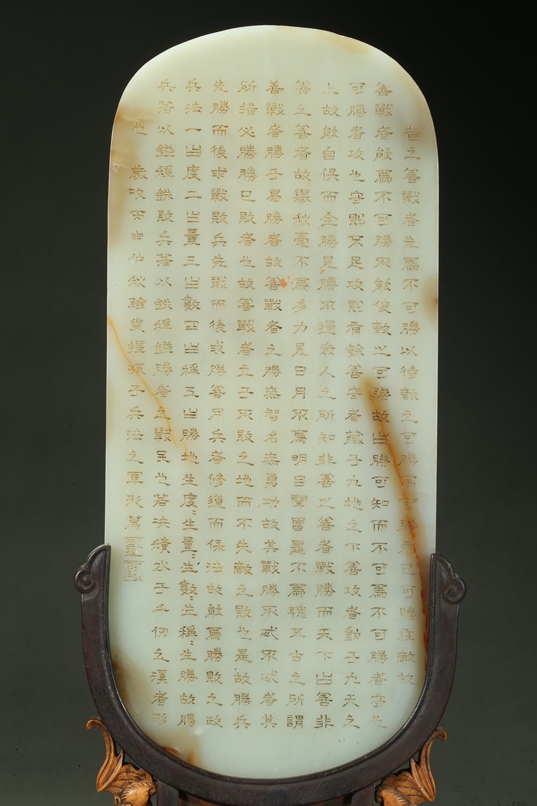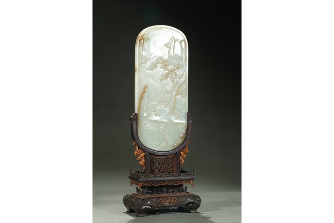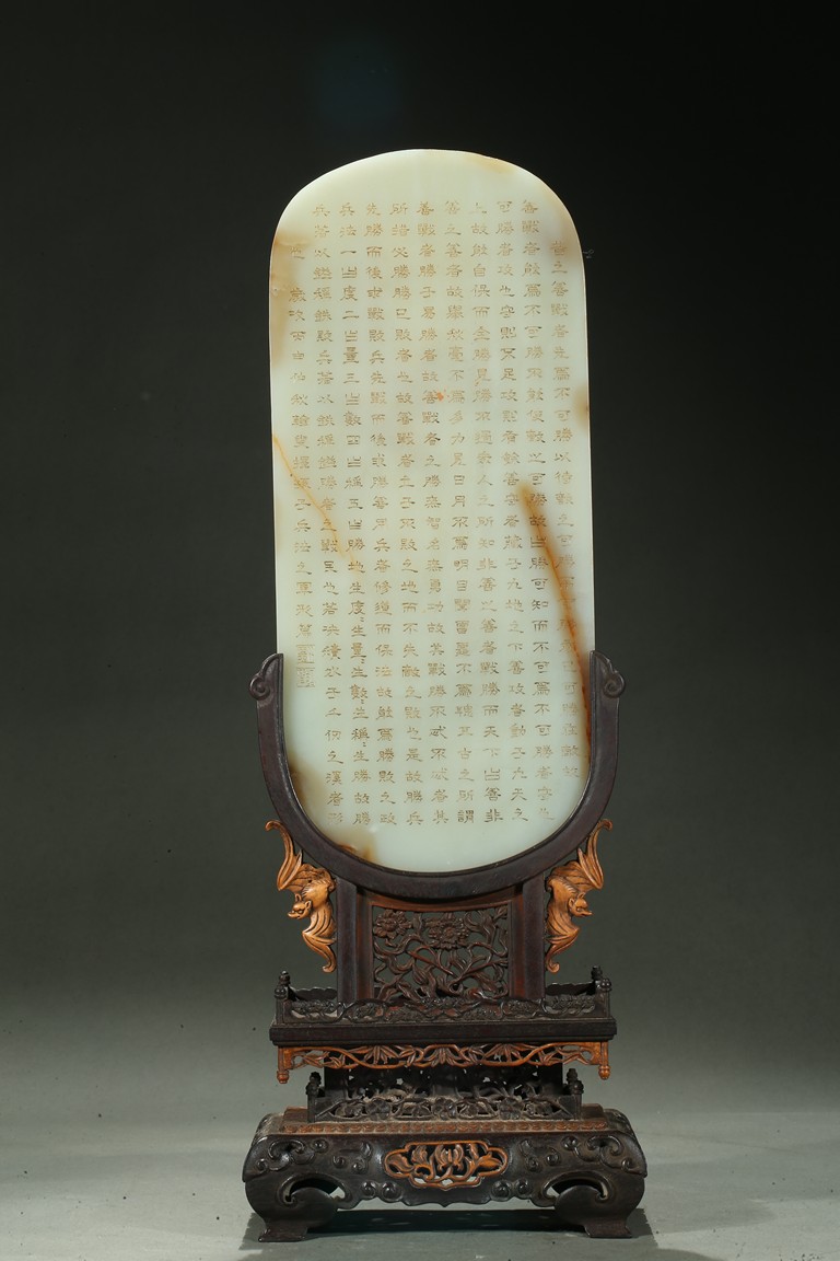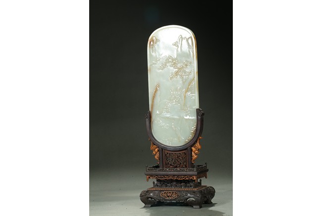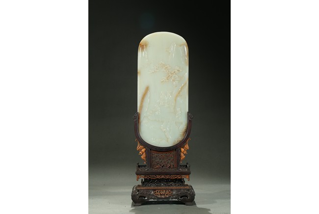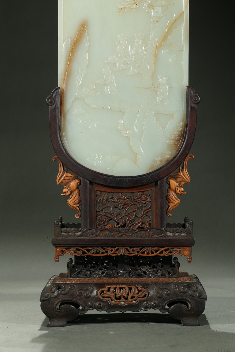 Of upright rounded rectangular form, one side carved in relief with two elderly literati conversing in a riverbank setting, with two boys next to them playing, all below a large pine tree and jagged rocky outcrops; the reverse finely carved with inscriptions.