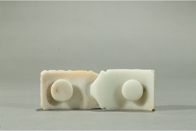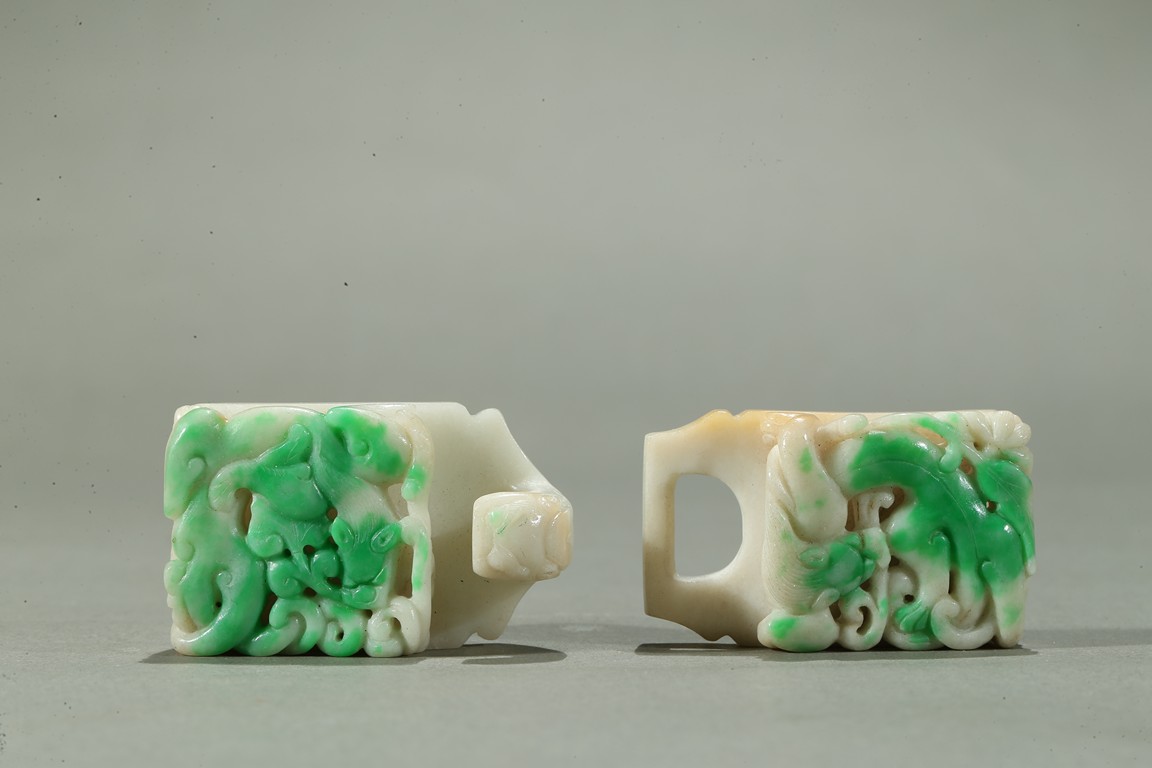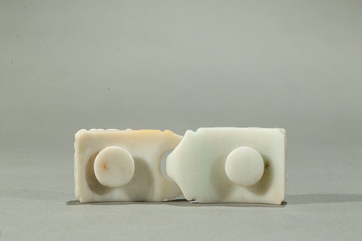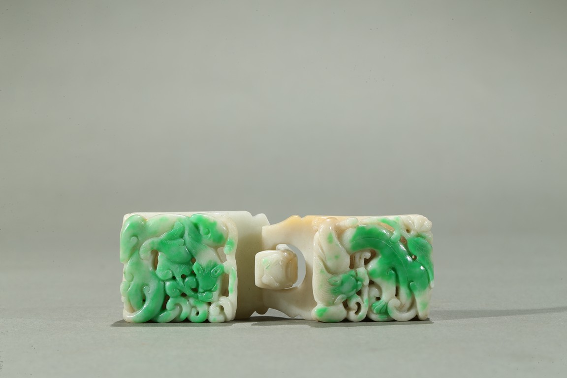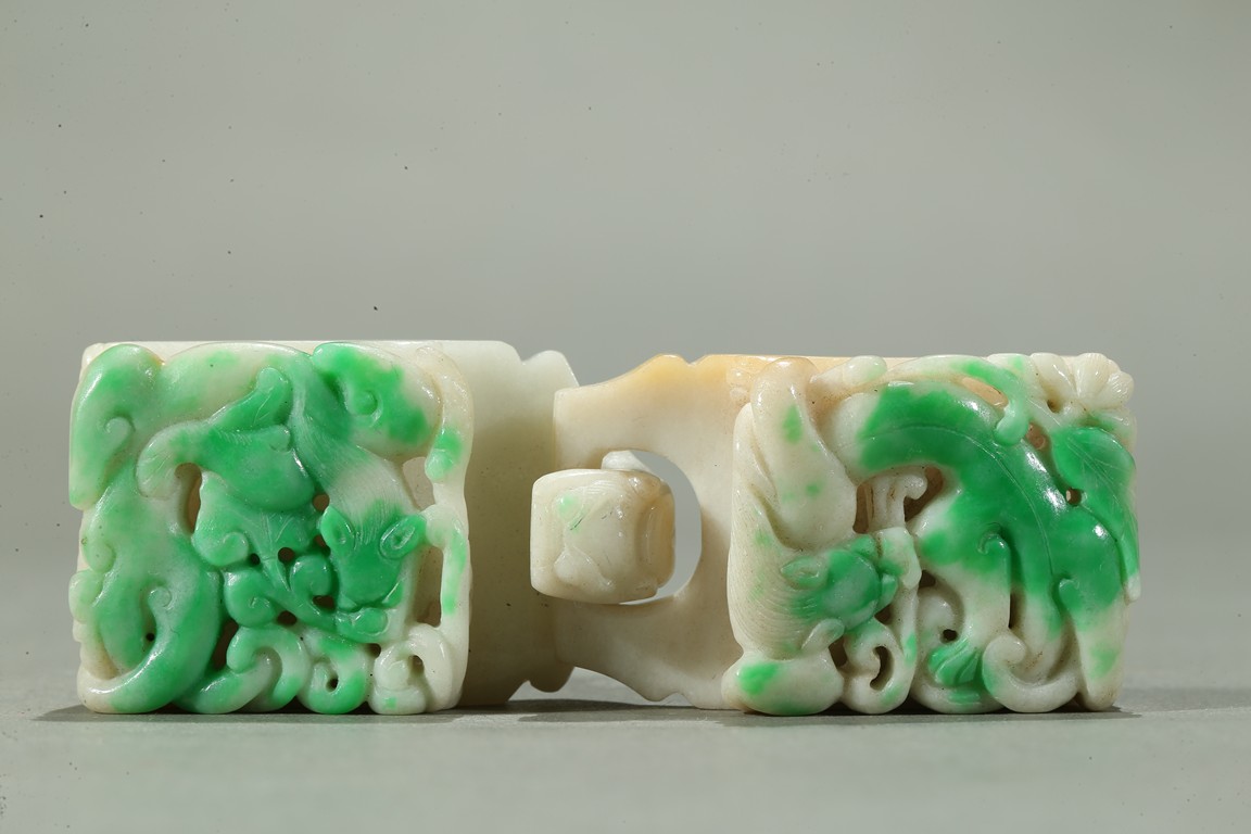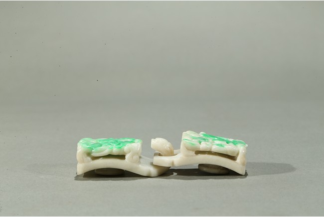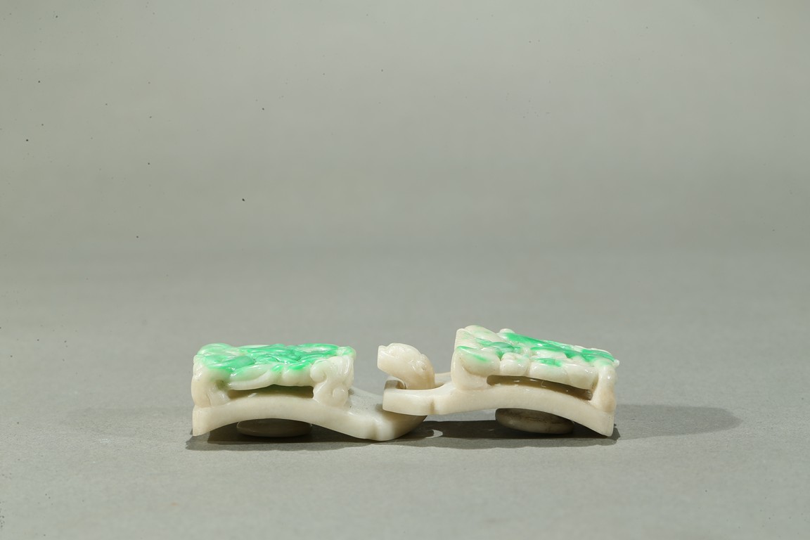 Carved in openwork with chilong and lingzhi, the hook in the form of a dragon-head, the green areas of the stone used to highlight the design, the underside carved with a circular buttons, the stone with lustrous polish. Qing Dynasty period.