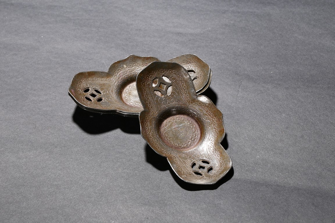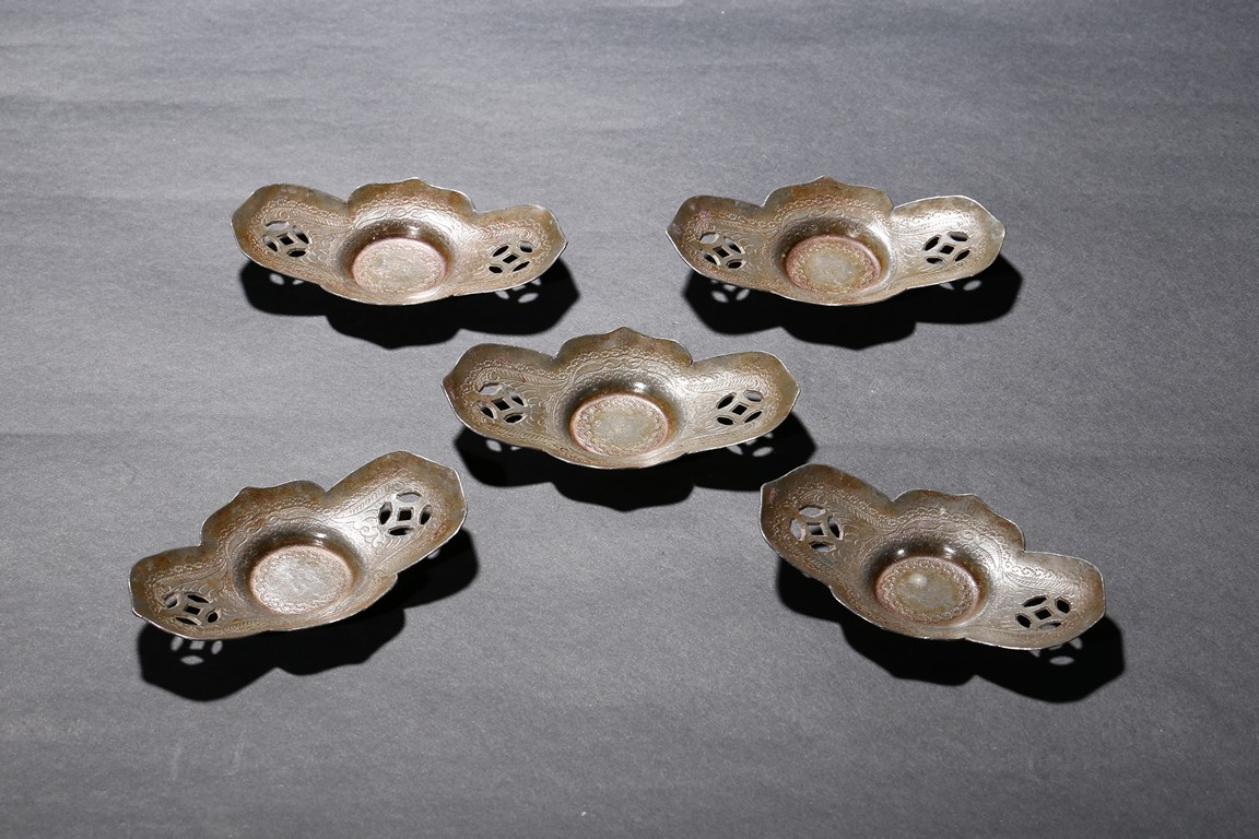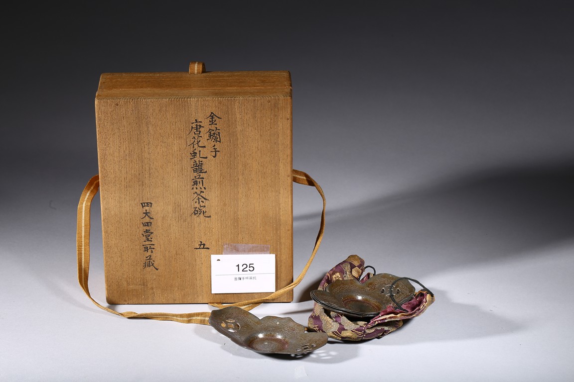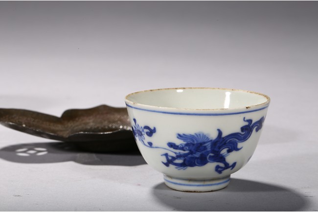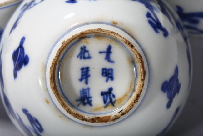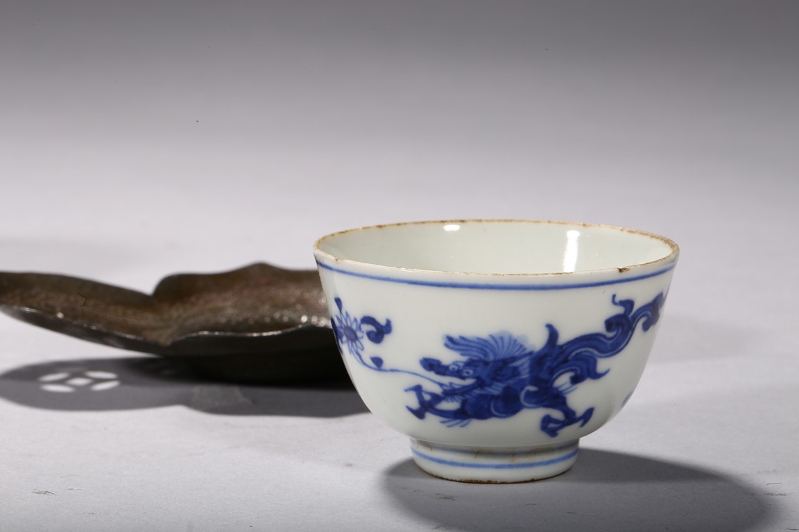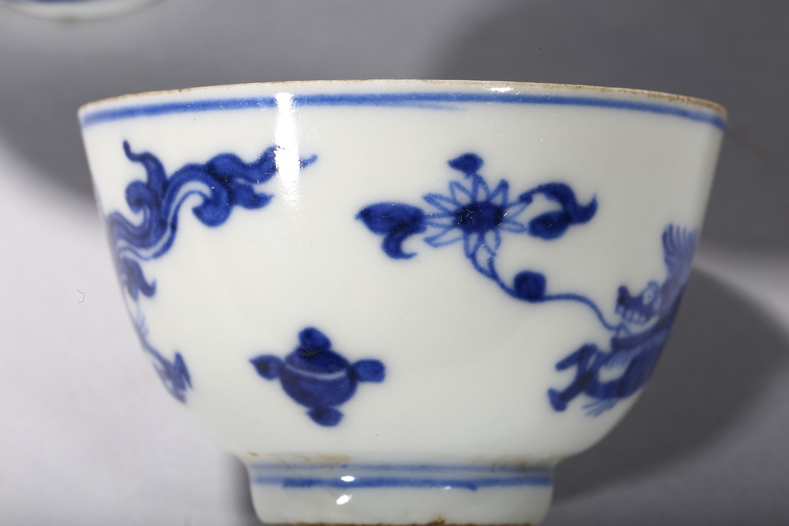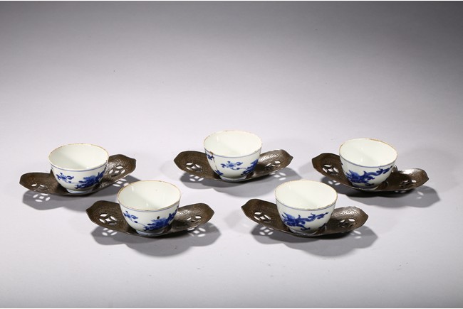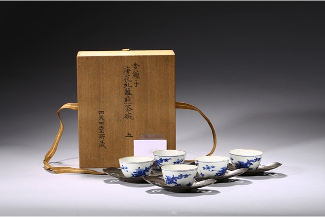 Of rounded sides, the exterior decorated with stylized dragon in pursuit of flaming pearl, the base with six character chenghua reign mark, all accompanied with five silver boat-shaped cup holders and Japanese wood box. Ming Dynasty period.
